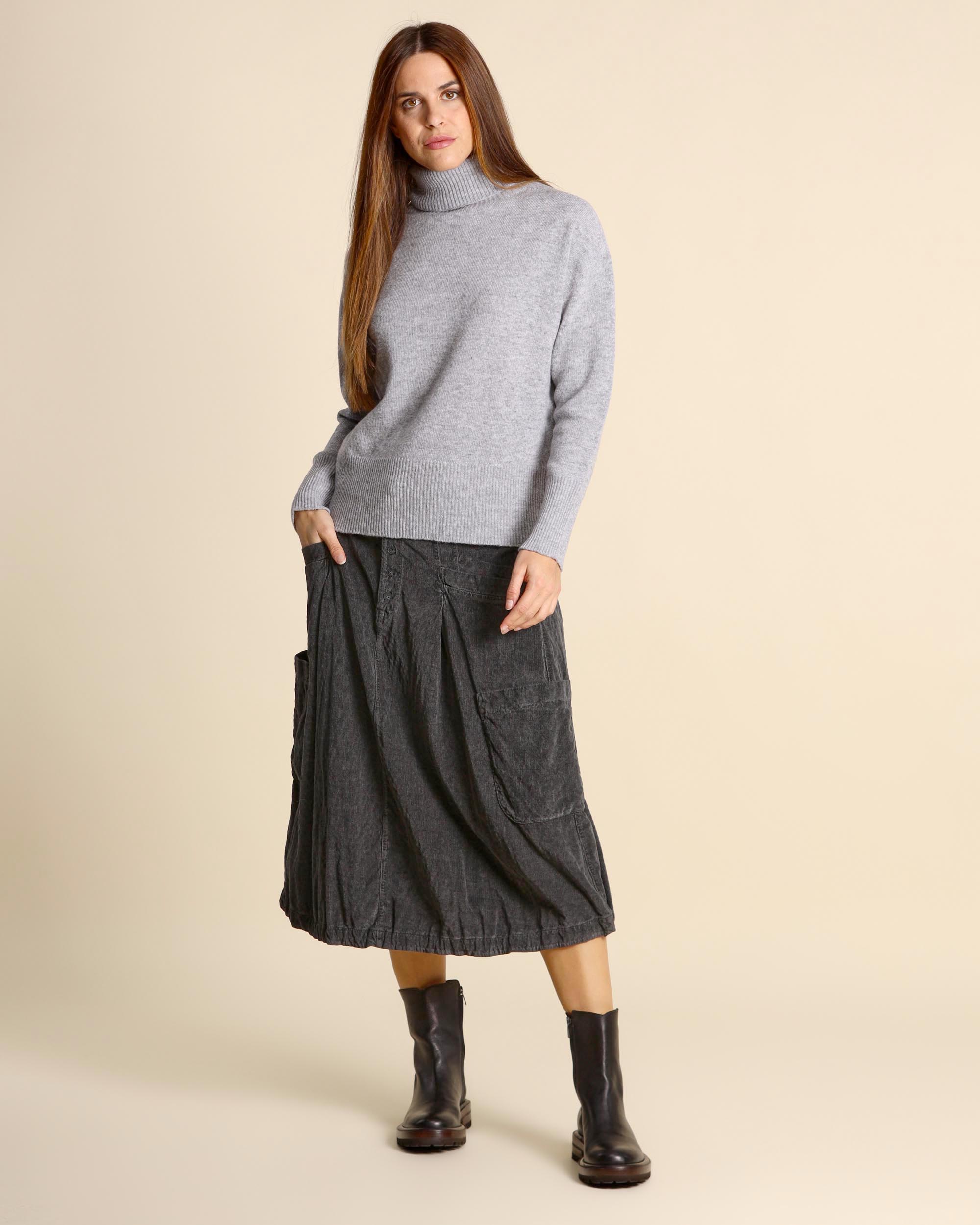 Maglia grigio melange in pura lana vergine, collo alto, maniche lunghe, giro sceso, linea dritta, made in Italy, la modella indossa una tg.S, la modella ha le seguenti misure: altezza 179, seno 84, vita 63, fianchi 94, collezione donna Maidamila Autunno Inverno 2025/26