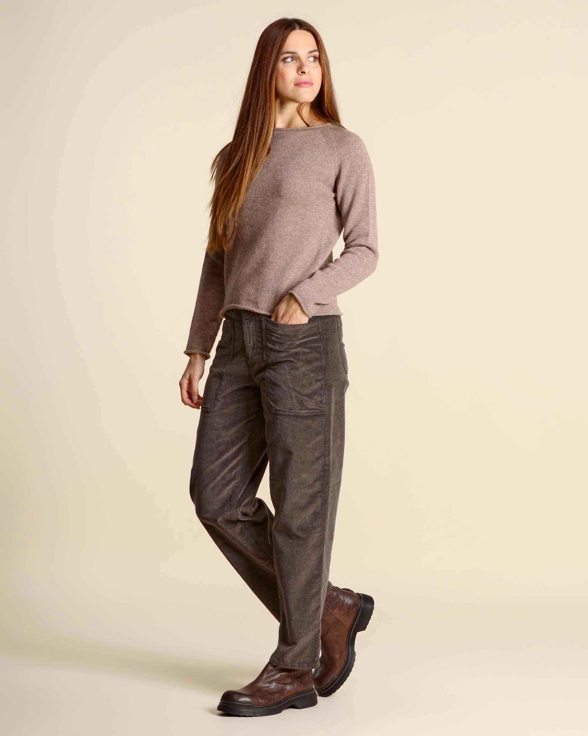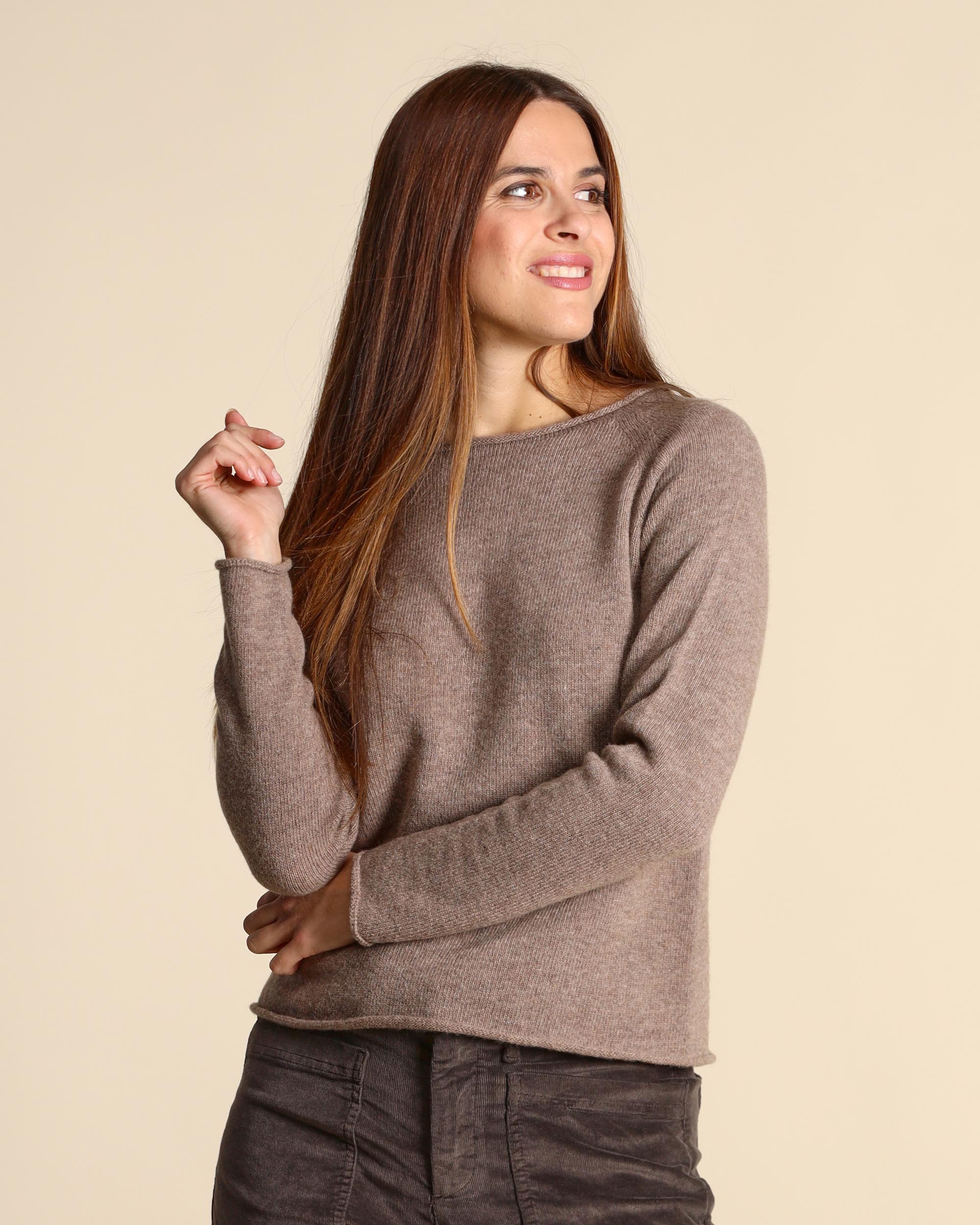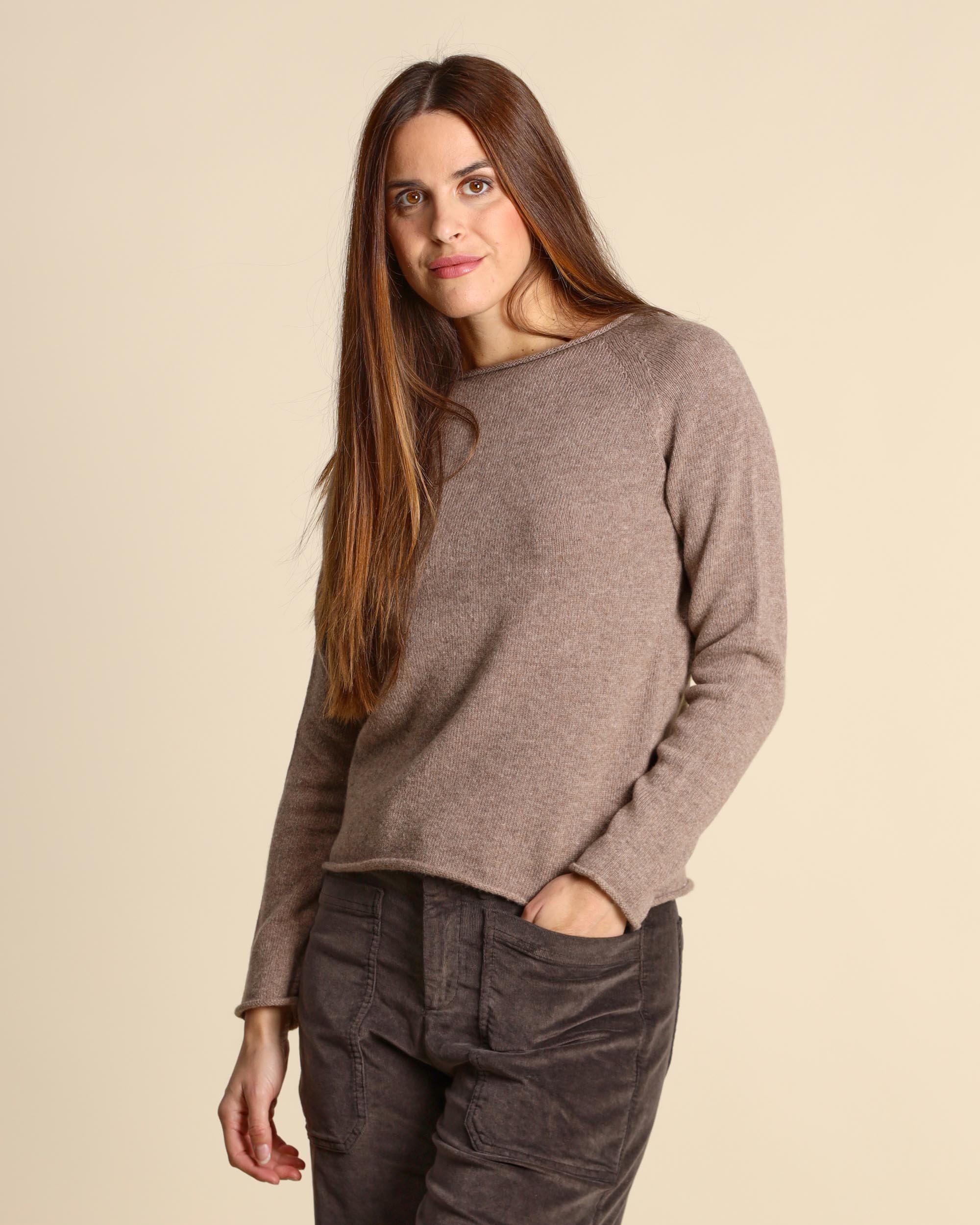 Maglia color greige in pura lana vergine, scollo a barchetta, maniche lunghe raglan, linea dritta, made in Italy, la modella indossa una tg.S, la modella ha le seguenti misure: altezza 179, seno 84, vita 63, fianchi 94, collezione donna Maidamila Autunno Inverno 2025/26
