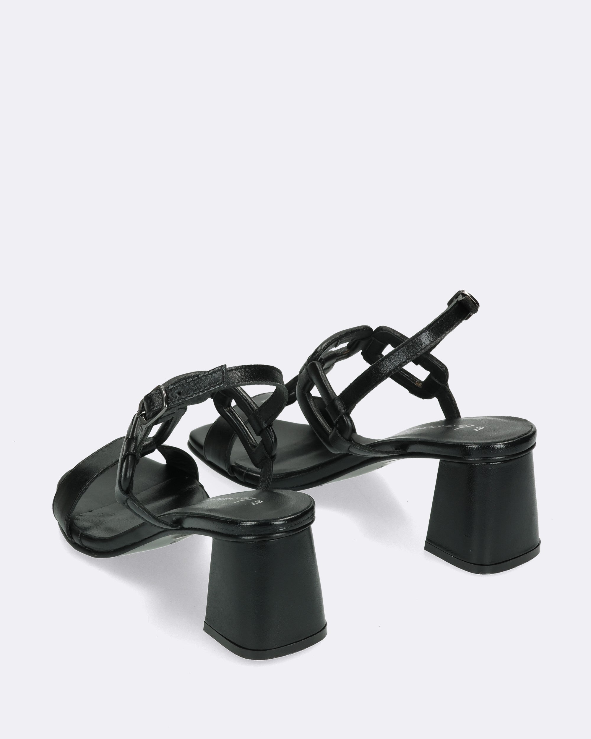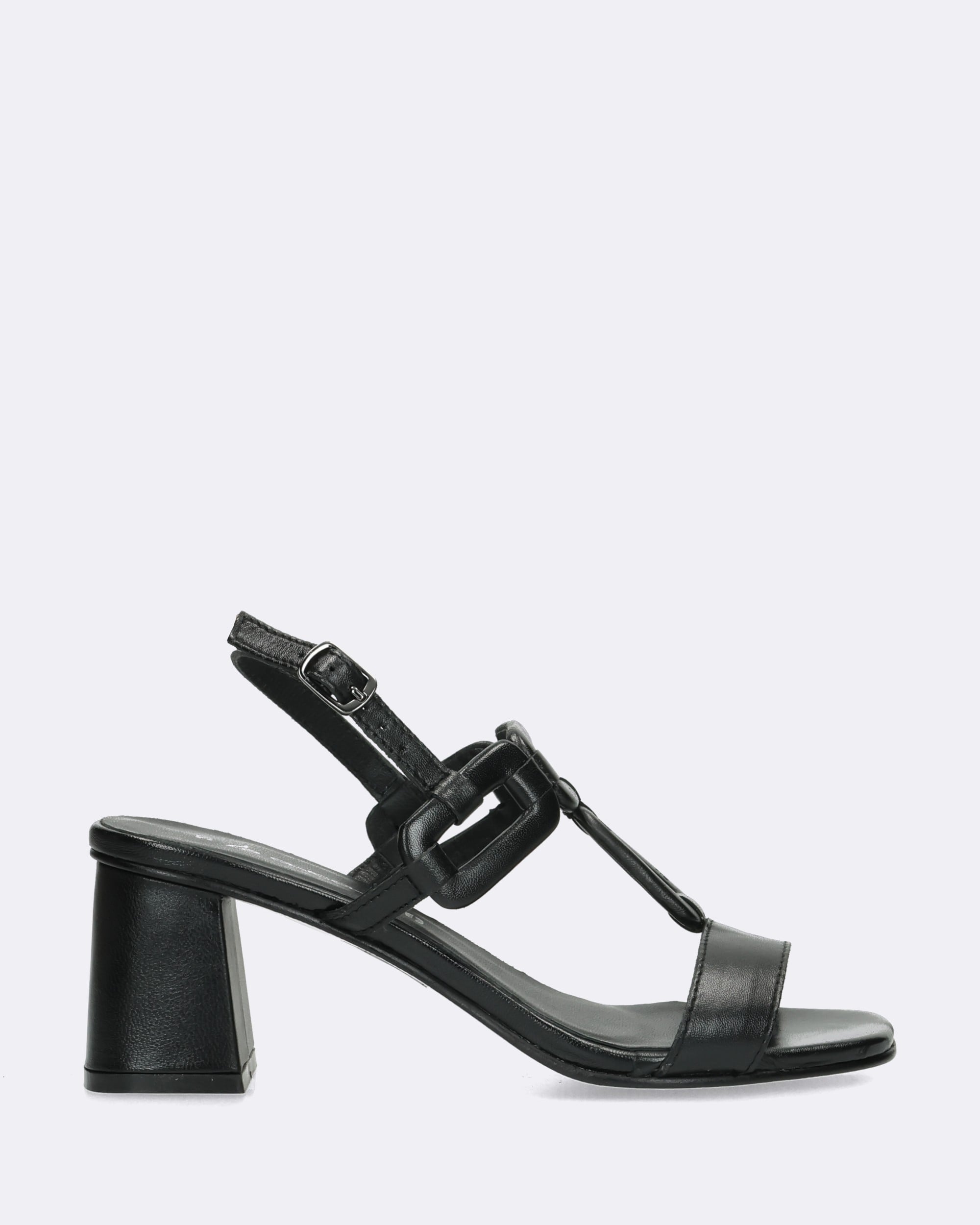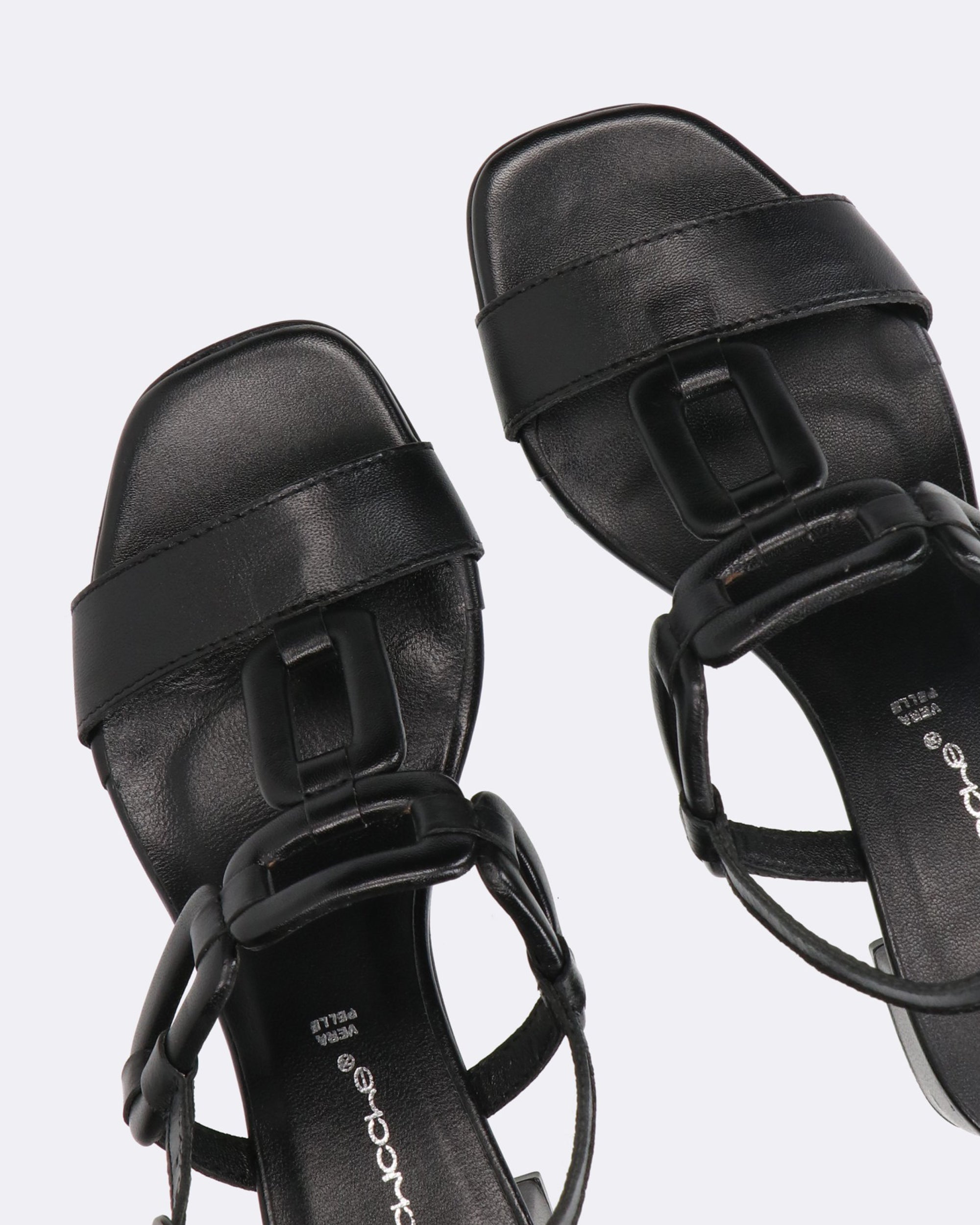 Sandali con tacco in pelle nera, tacco ricoperto 70mm, sottopiede in pelle, suola in cuoio, cinturino regolabile con fibbia, punta squadrata, collezione Le Chicche Primavera estate 2025