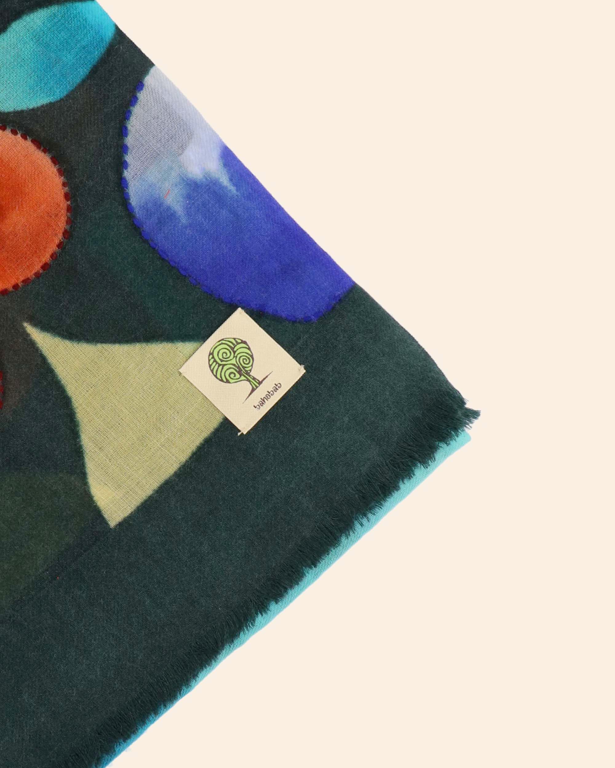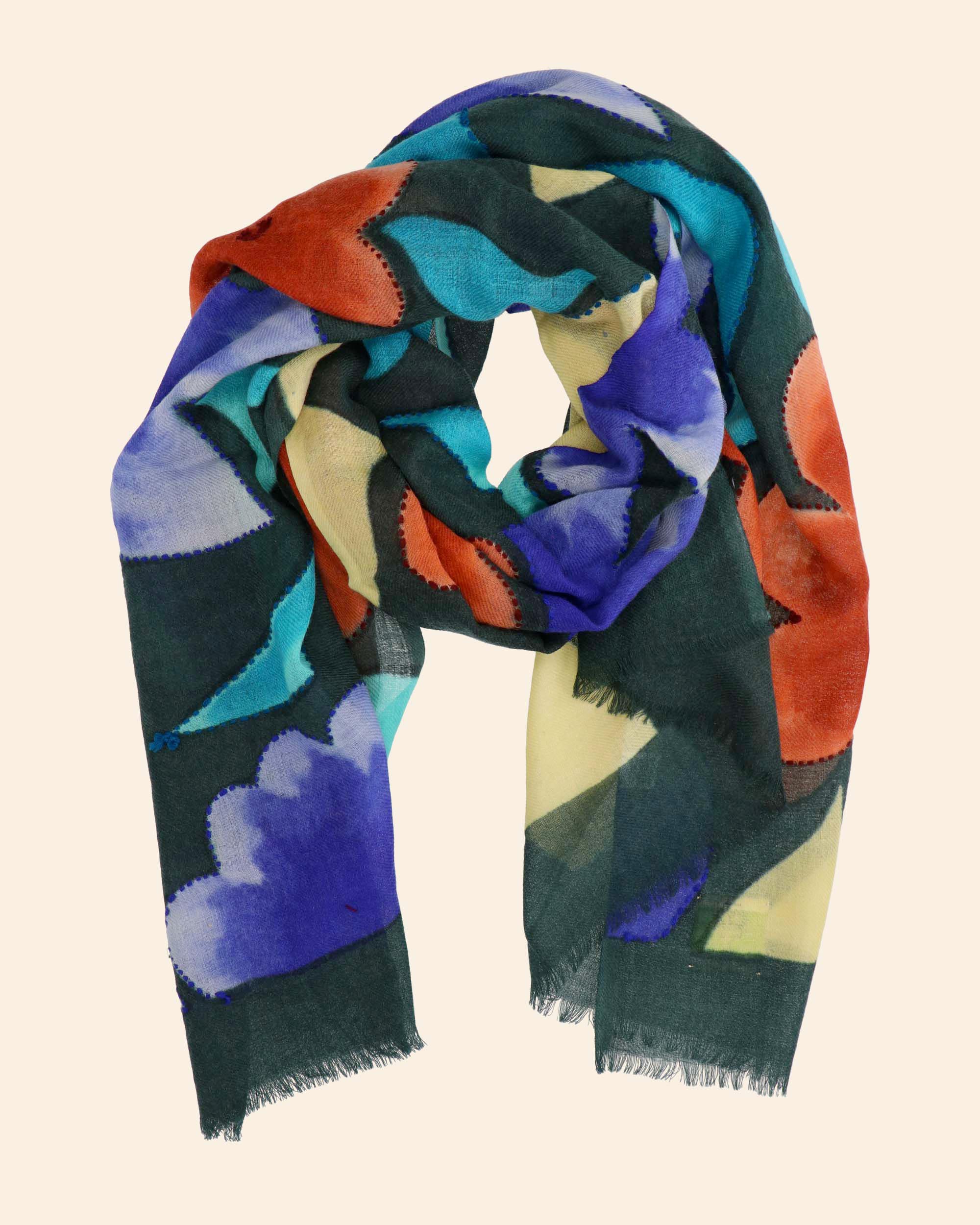 Stola in 100% lana, misura 180 x 70, fantasia multicolor, dettagli ricamati a contrasto, collezione autunno inverno BAHOBAB 2025/2026