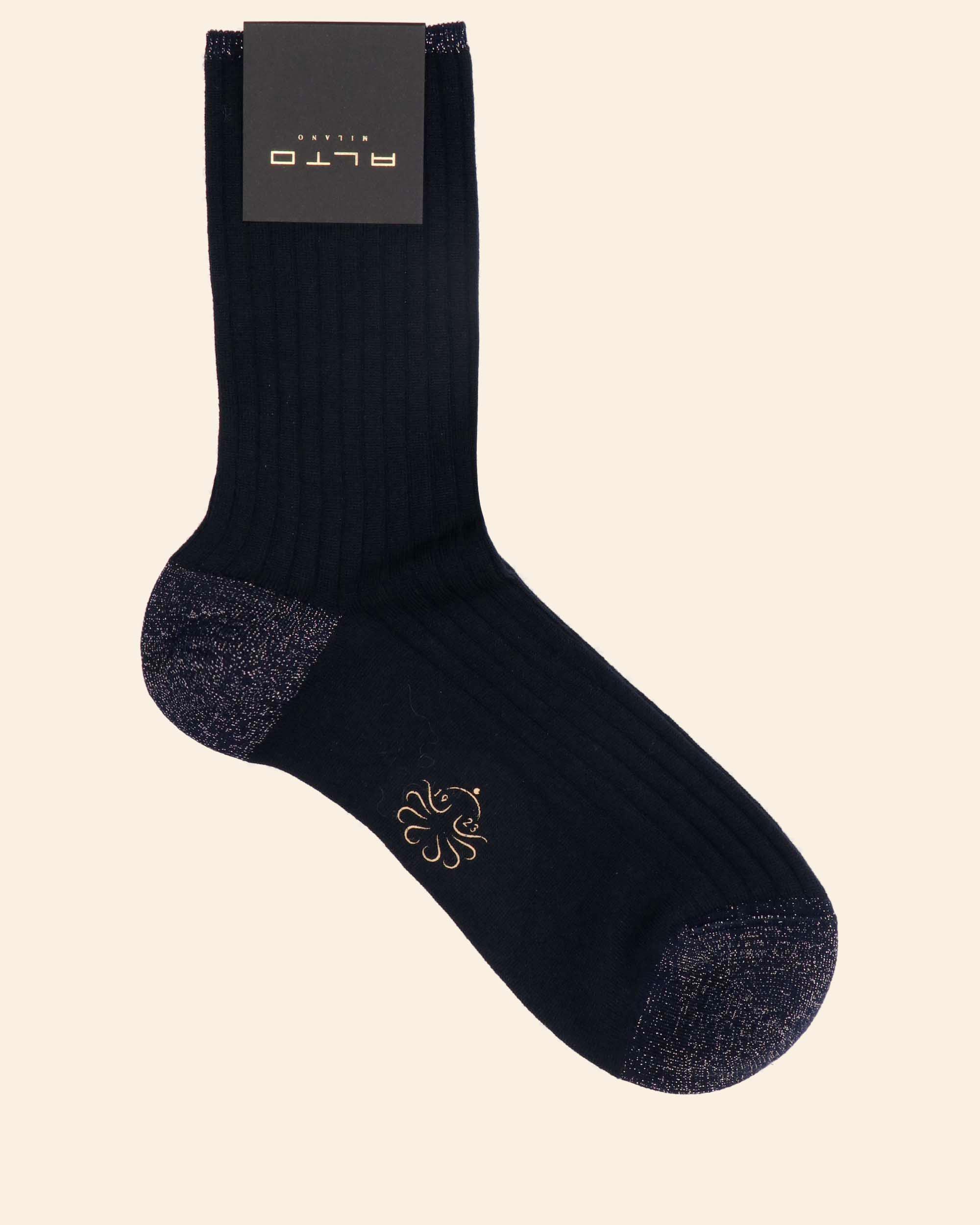Calza corta color blu in misto lana stretch con bordo in lurex, taglia unica, made in Italy, collezione Alto Milano