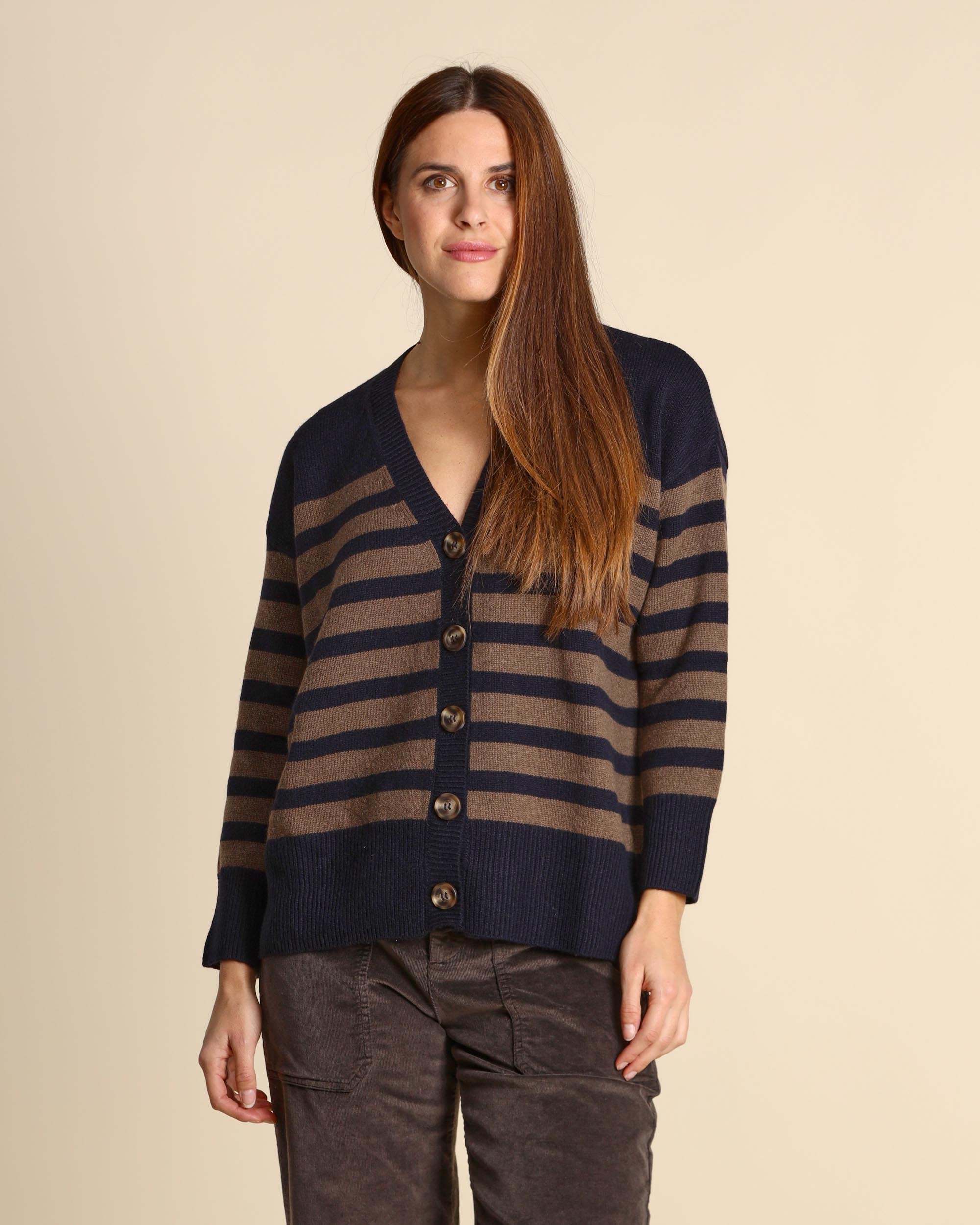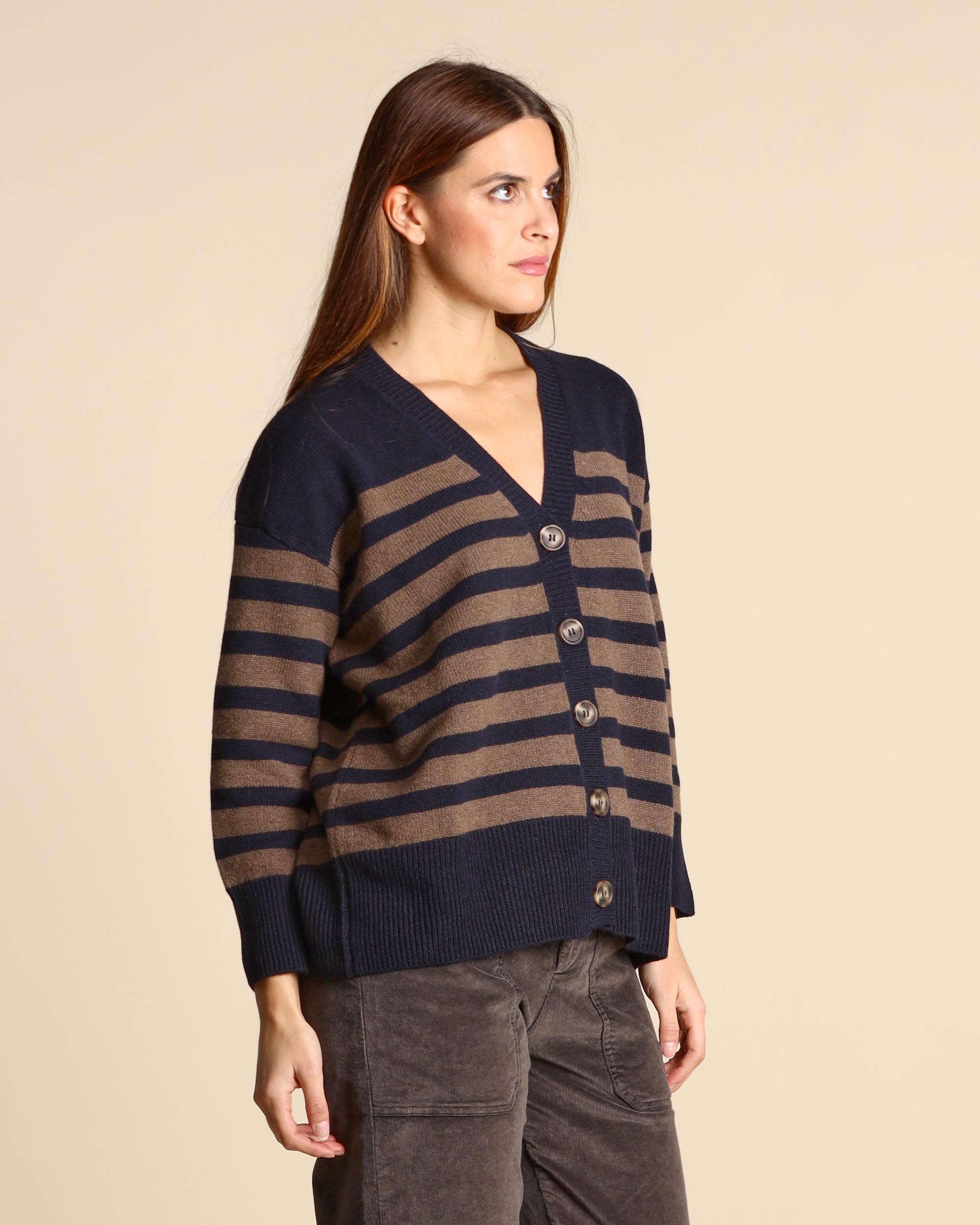 Cardigan blu e tabacco a righe in cashmere con lavorazione a due fili, gr.315, maniche lunghe, scollo a V, chiusura con bottoni, linea morbida, la modella indossa una tg.S, la modella ha le seguenti misure: altezza 179, seno 84, vita 63, fianchi 94, collezione donna Be You Autunno Inverno 2025/26
