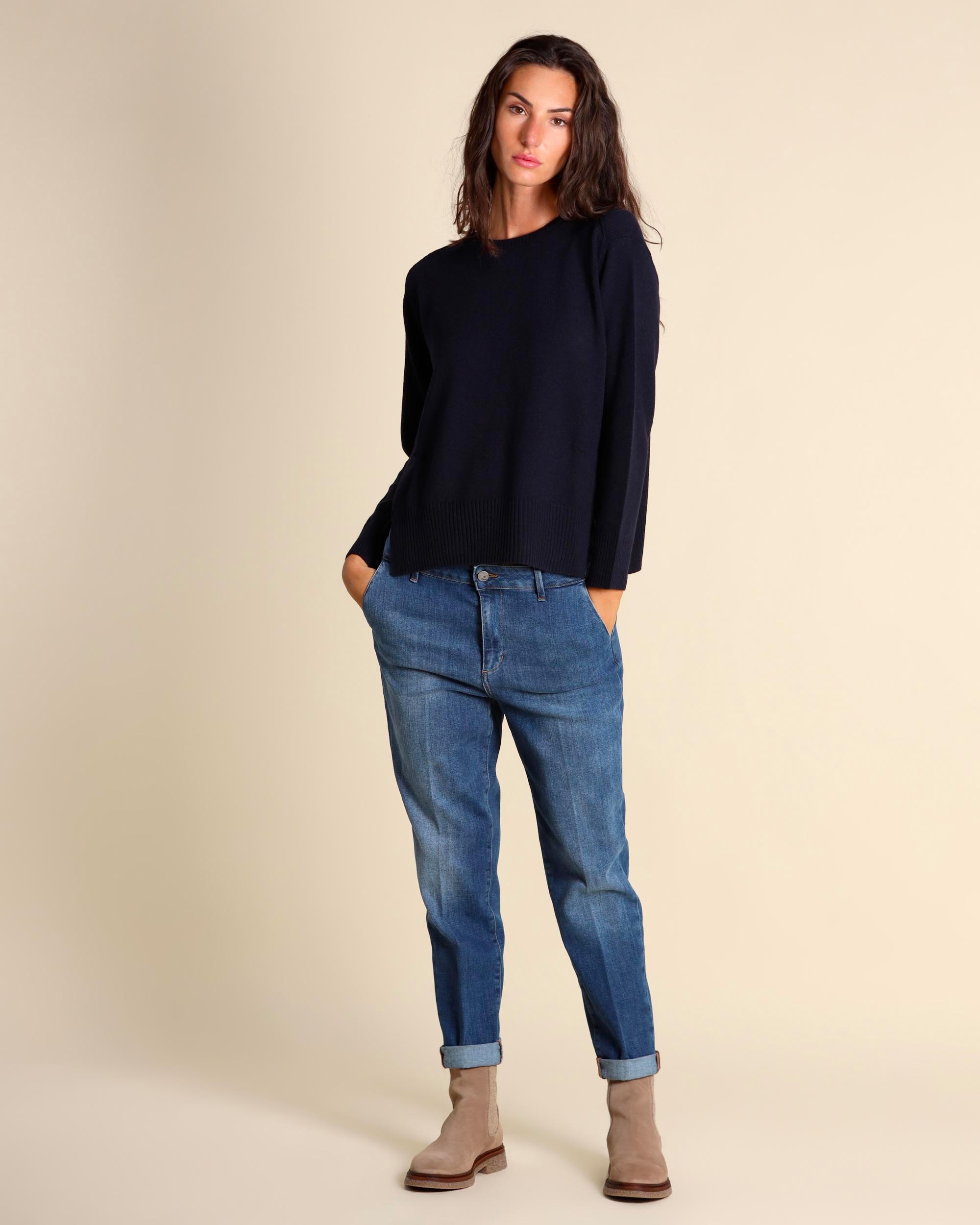 Jeans blu chino in denim di cotone stretch, chiusura con bottone a chiodo e zip nascosta, tasche alla francese sul davanti e tasche a filetto sul dietro, linea dritta, piega sturata, lavaggio cinque anni, made in Italy, la modella indossa una tg.28, la modella ha le seguenti misure: altezza 178, seno 86,vita 65, fianchi 93, collezione donna Cigala's Autunno Inverno 2025/26