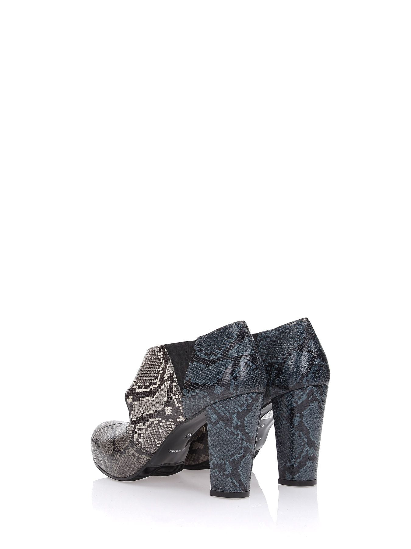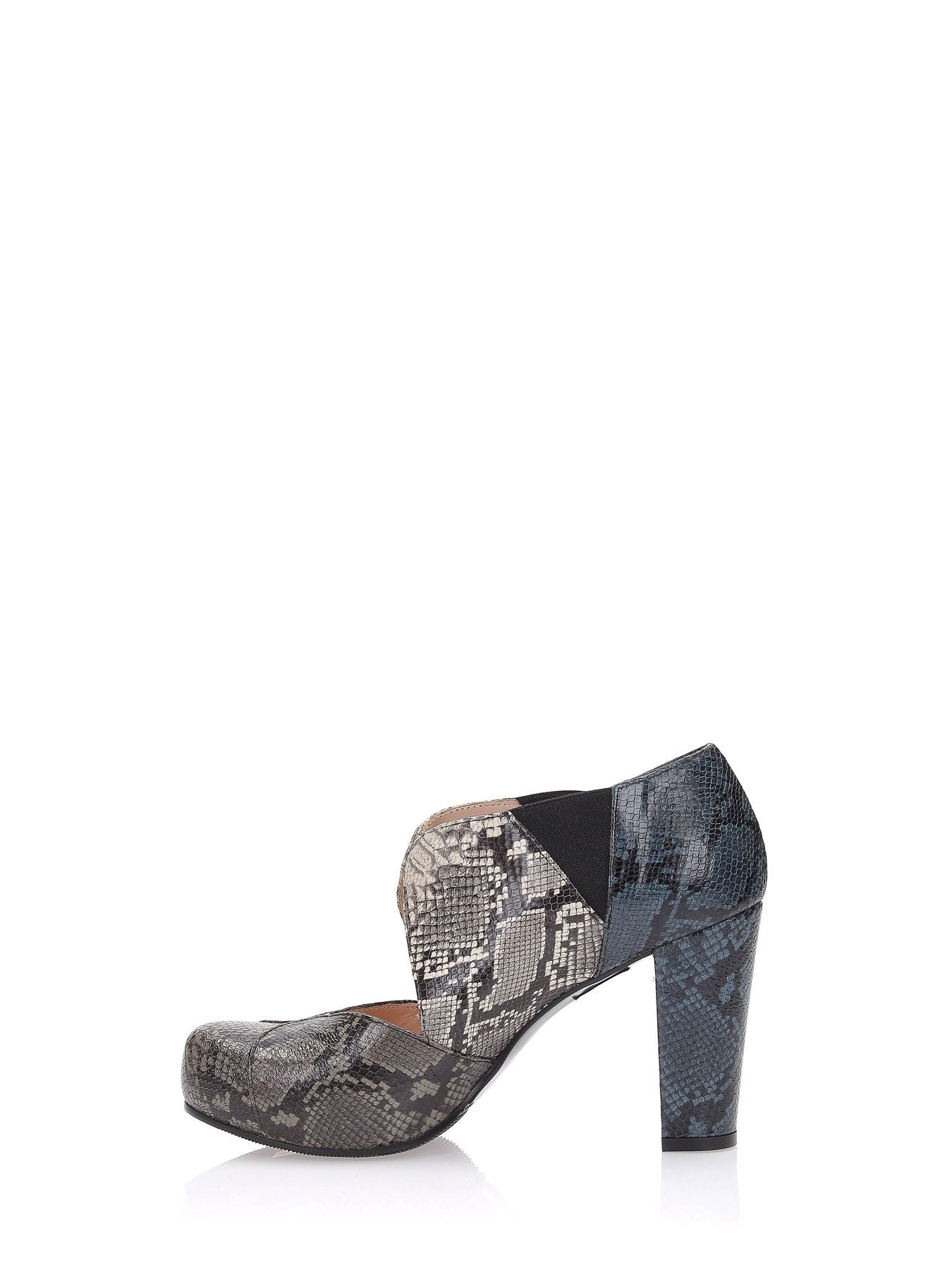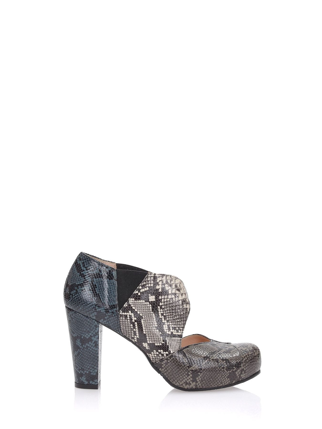 Decolletè in mix di pelle stampata pitone blu, naturale e tortora, elastici laterali, fodera in pelle, suola in gomma, plateau interno 20mm, tacco ricoperto in pelle 95mm, punta tonda, sottopiede in pelle, made in Italy, lavorazione artigianale, collezione donna I Am Autunno Inverno 2019