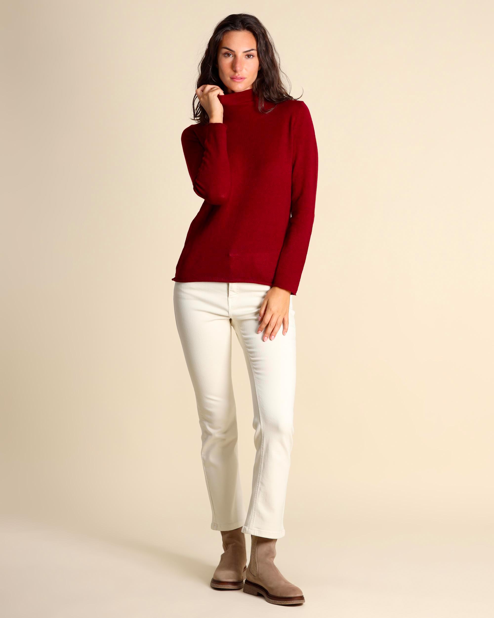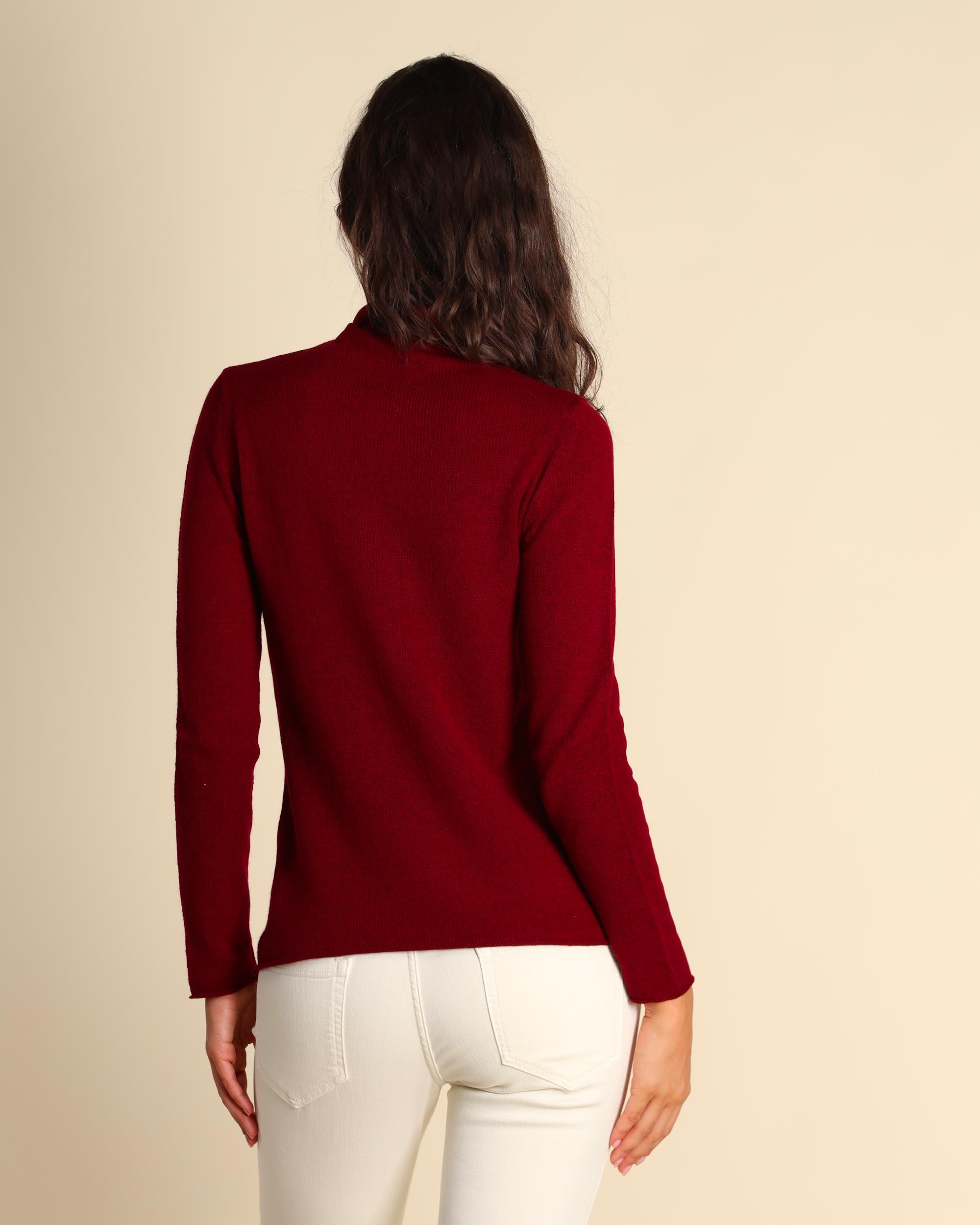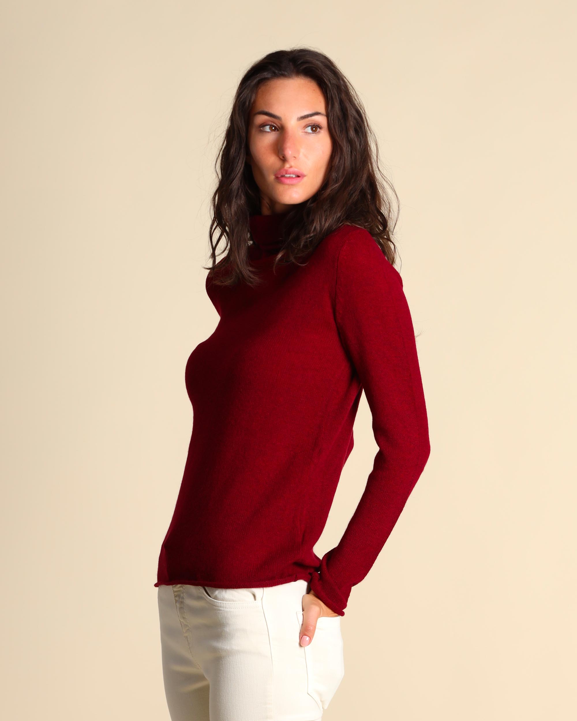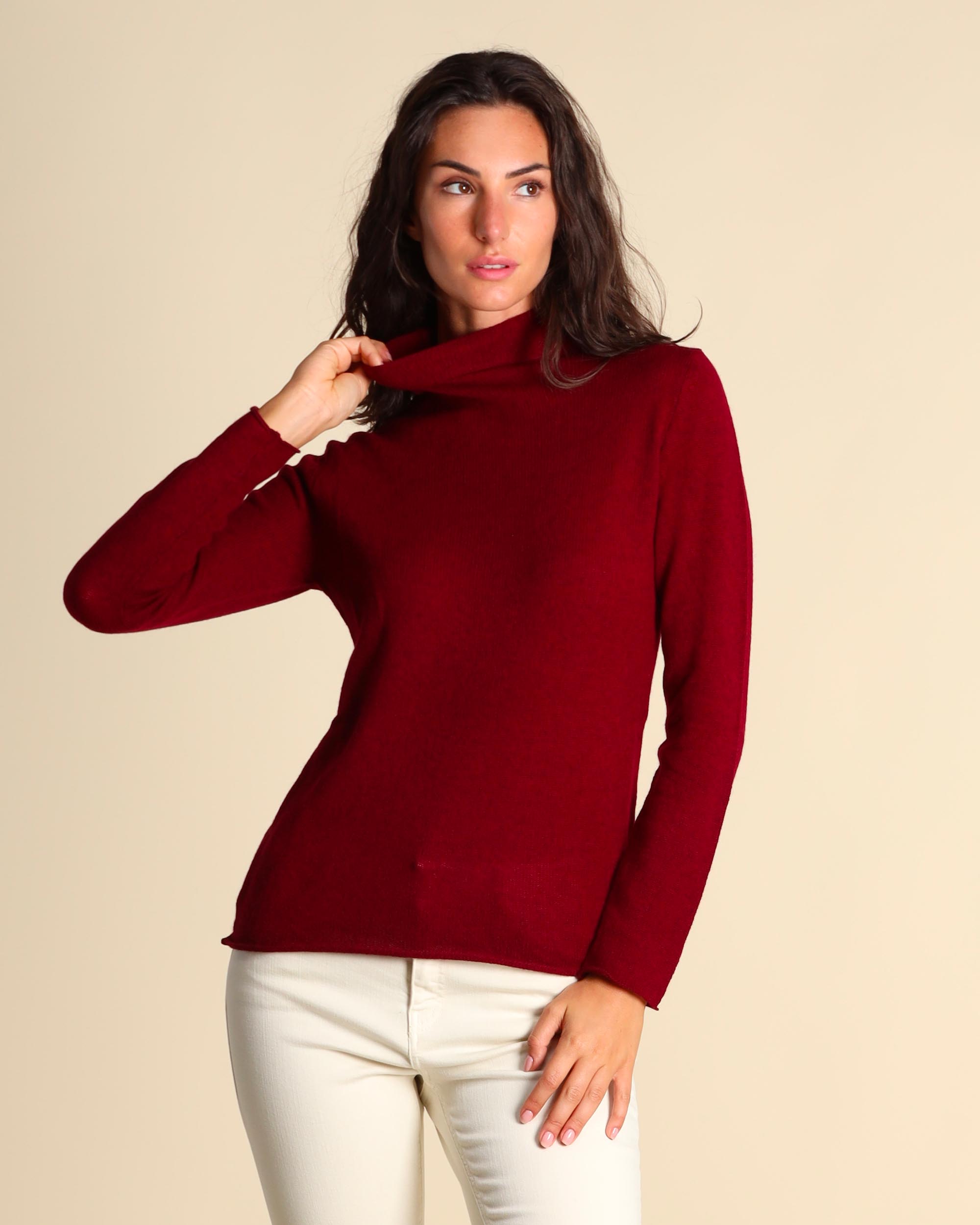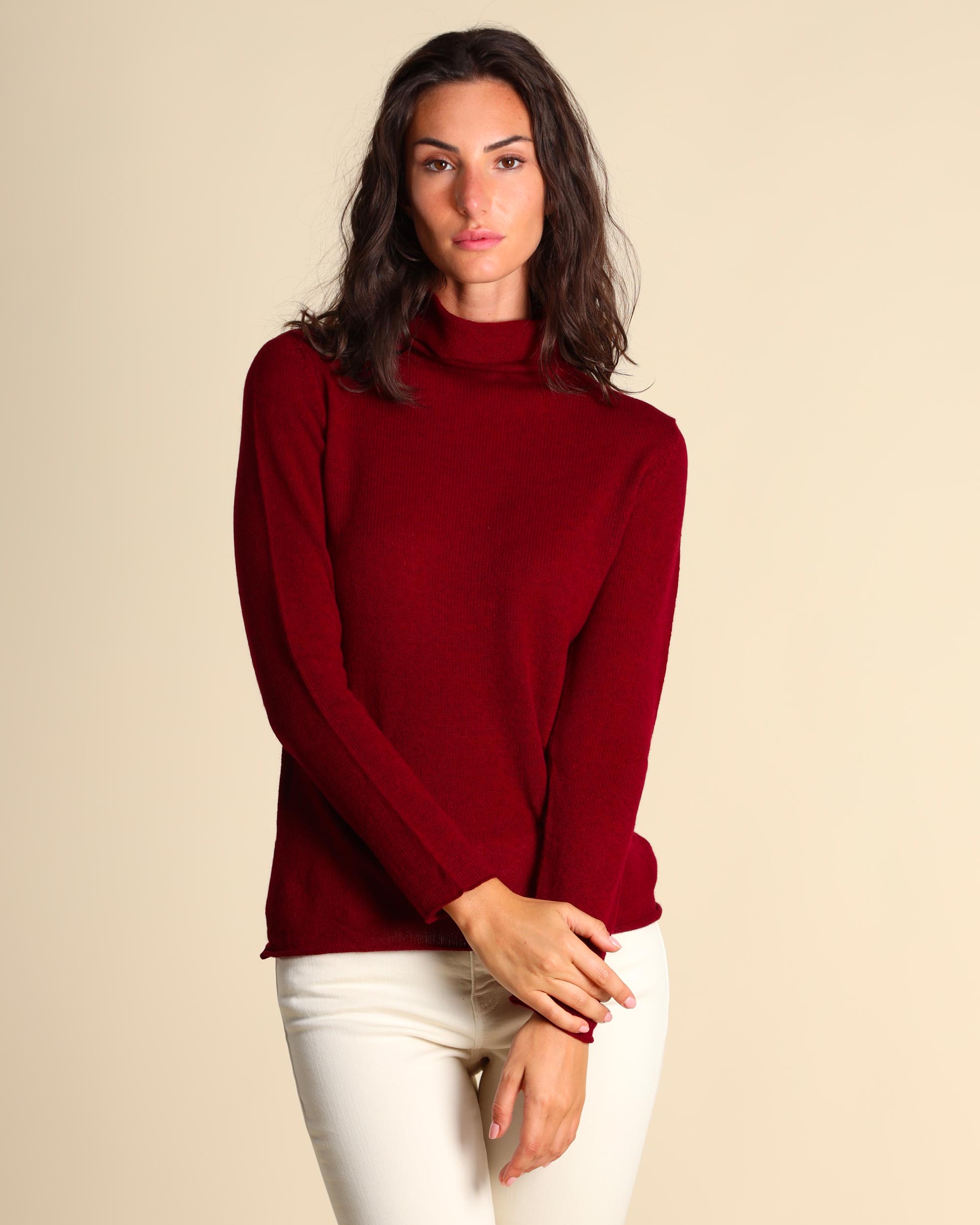 Maglia bordeaux in cashmere con lavorazione a nuvola, gr.149, maniche lunghe, collo alto, linea semiaderente, la modella indossa una tg.S, la modella ha le seguenti misure: altezza 179, seno 84, vita 63, fianchi 94, collezione donna Be You Autunno Inverno 2025/26
