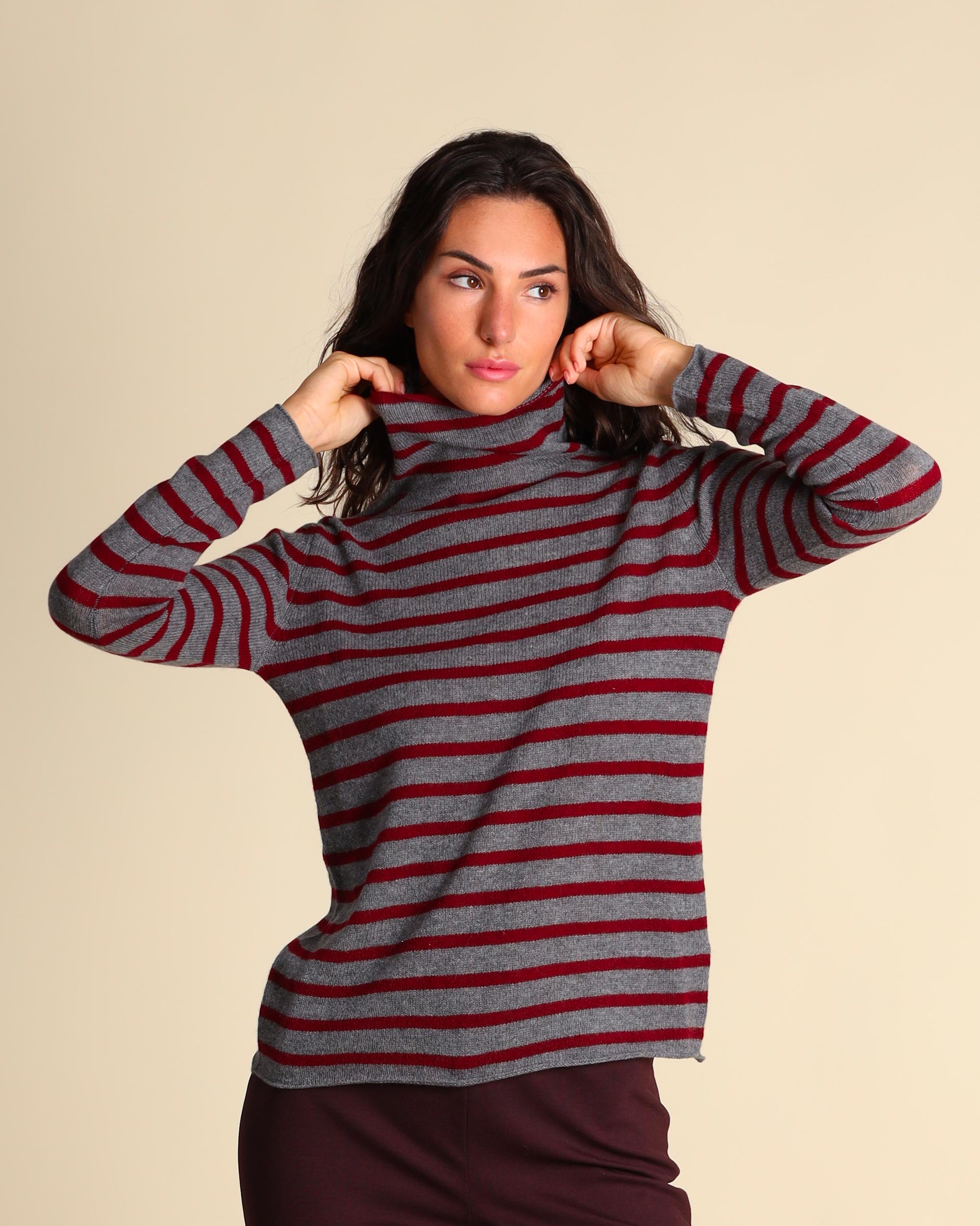 Maglia grigia a righe bordeaux in cashmere con lavorazione a nuvola, gr.149, maniche lunghe, collo alto, linea semiaderente, la modella indossa una tg.S, la modella ha le seguenti misure: altezza 179, seno 84, vita 63, fianchi 94, collezione donna Be You Autunno Inverno 2025/26