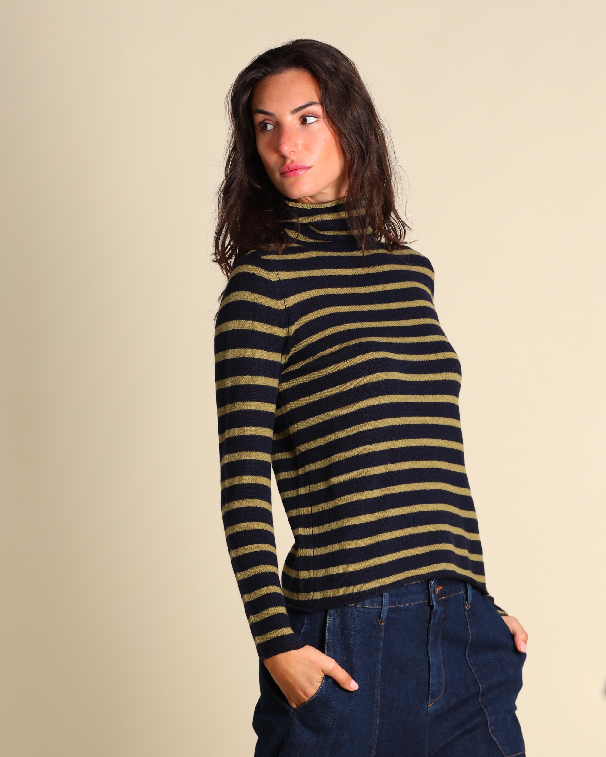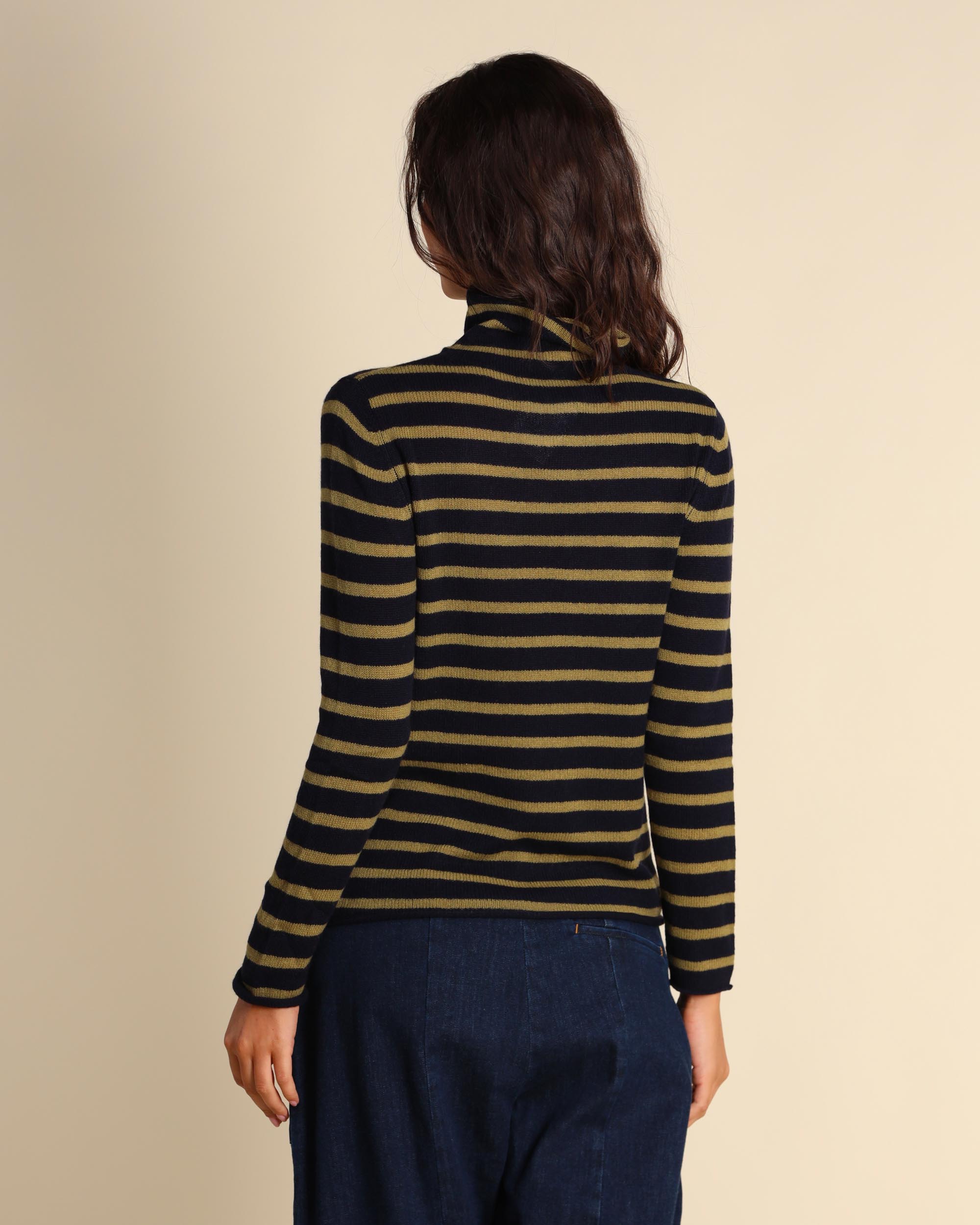Maglia blu e verde acido a righe in cashmere con lavorazione a nuvola, gr.149, maniche lunghe, collo alto, linea semiaderente, la modella indossa una tg.S, la modella ha le seguenti misure: altezza 179, seno 84, vita 63, fianchi 94, collezione donna Be You Autunno Inverno 2025/26