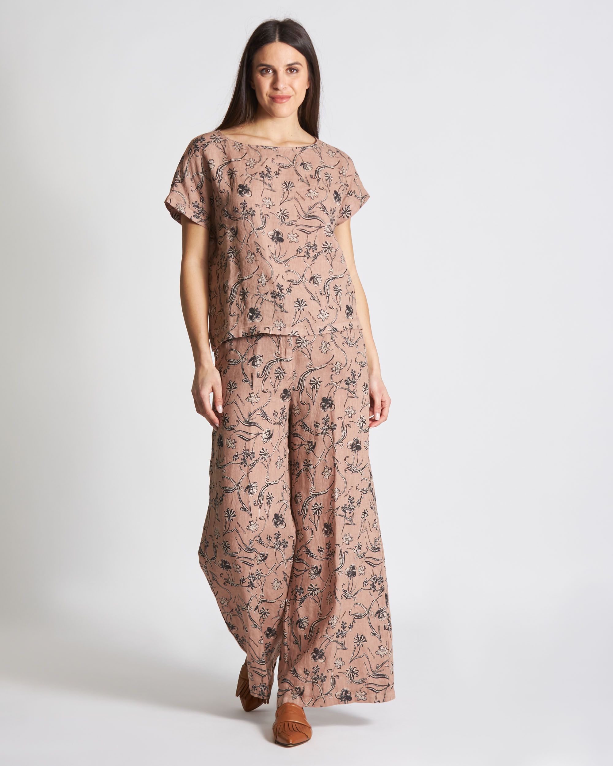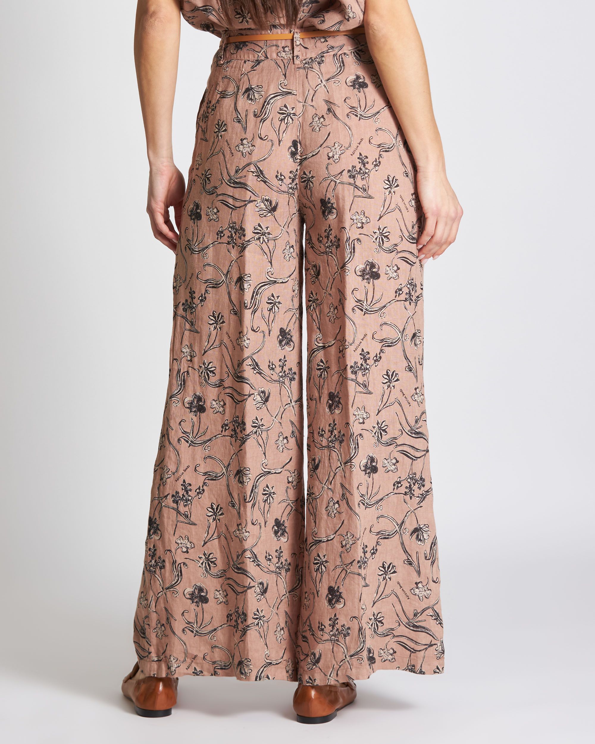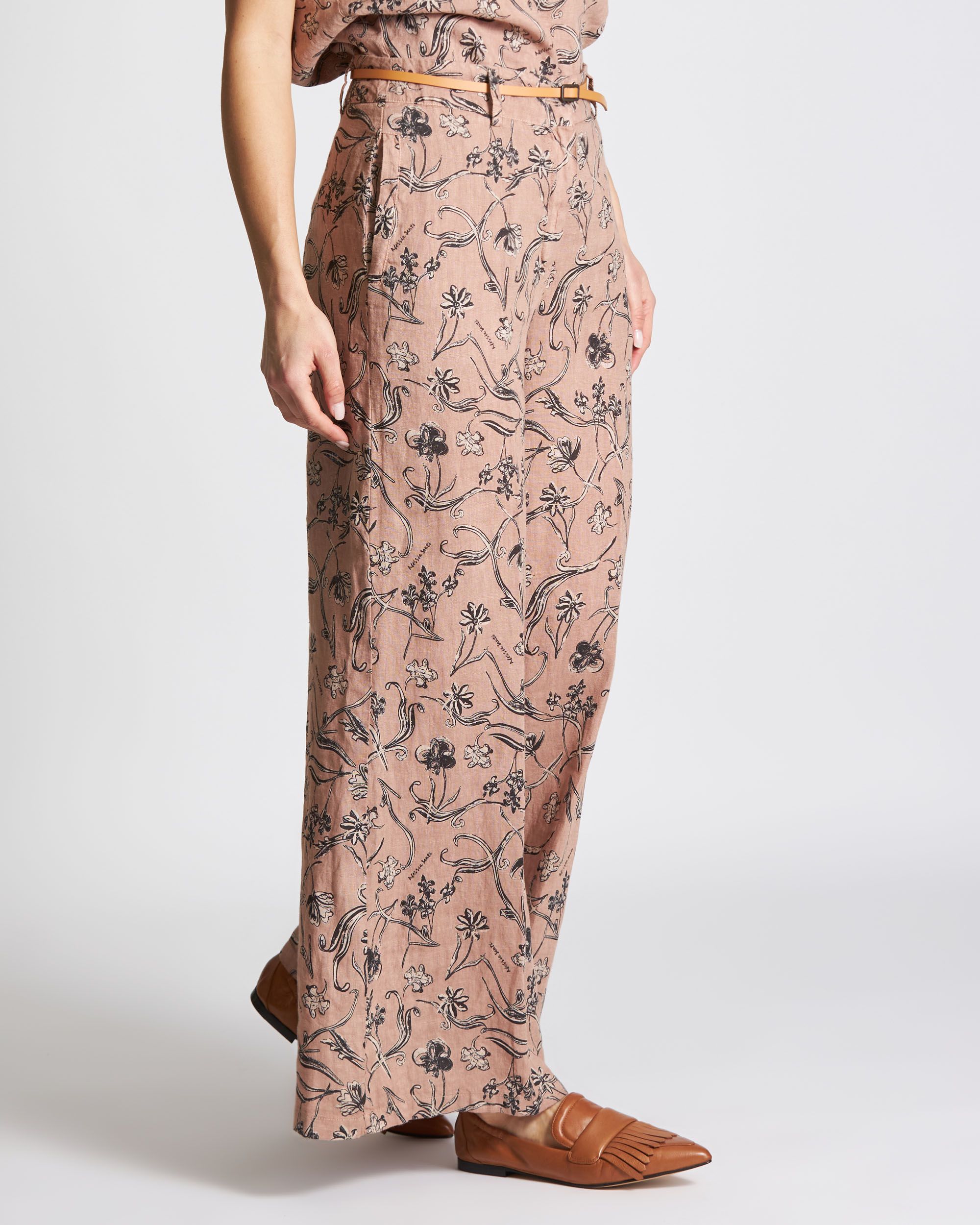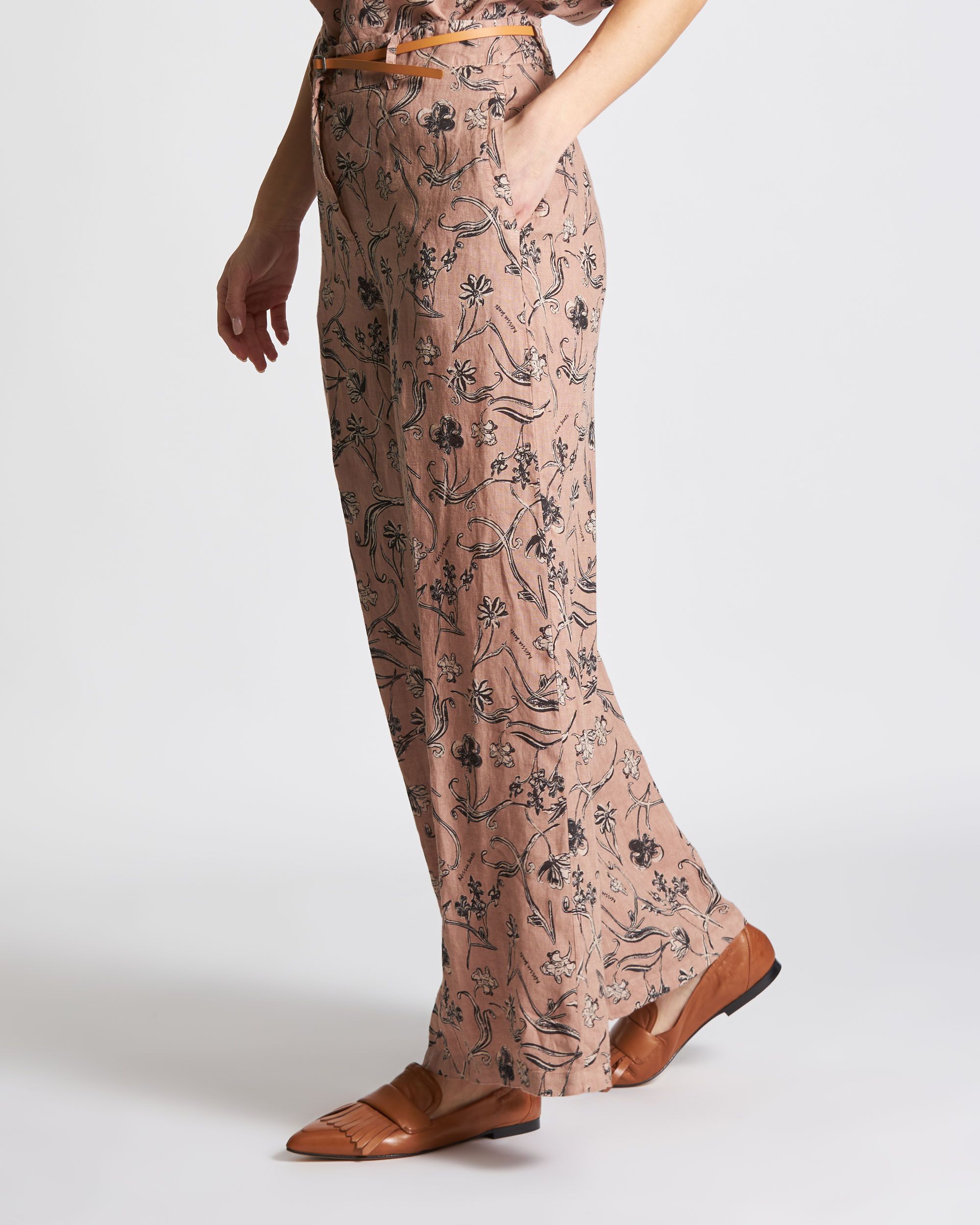 Pantaloni in lino color biscotto a fantasia, chiusura con bottone e zip nascosta, tasche inserite sul fianco, linea ampia, made in Italy, Veronica indossa una tg.42, Veronica ha le seguenti misure: altezza 177, seno 87,vita 65, fianchi 93, collezione donna Alessia Santi Primavera Estate 2024
