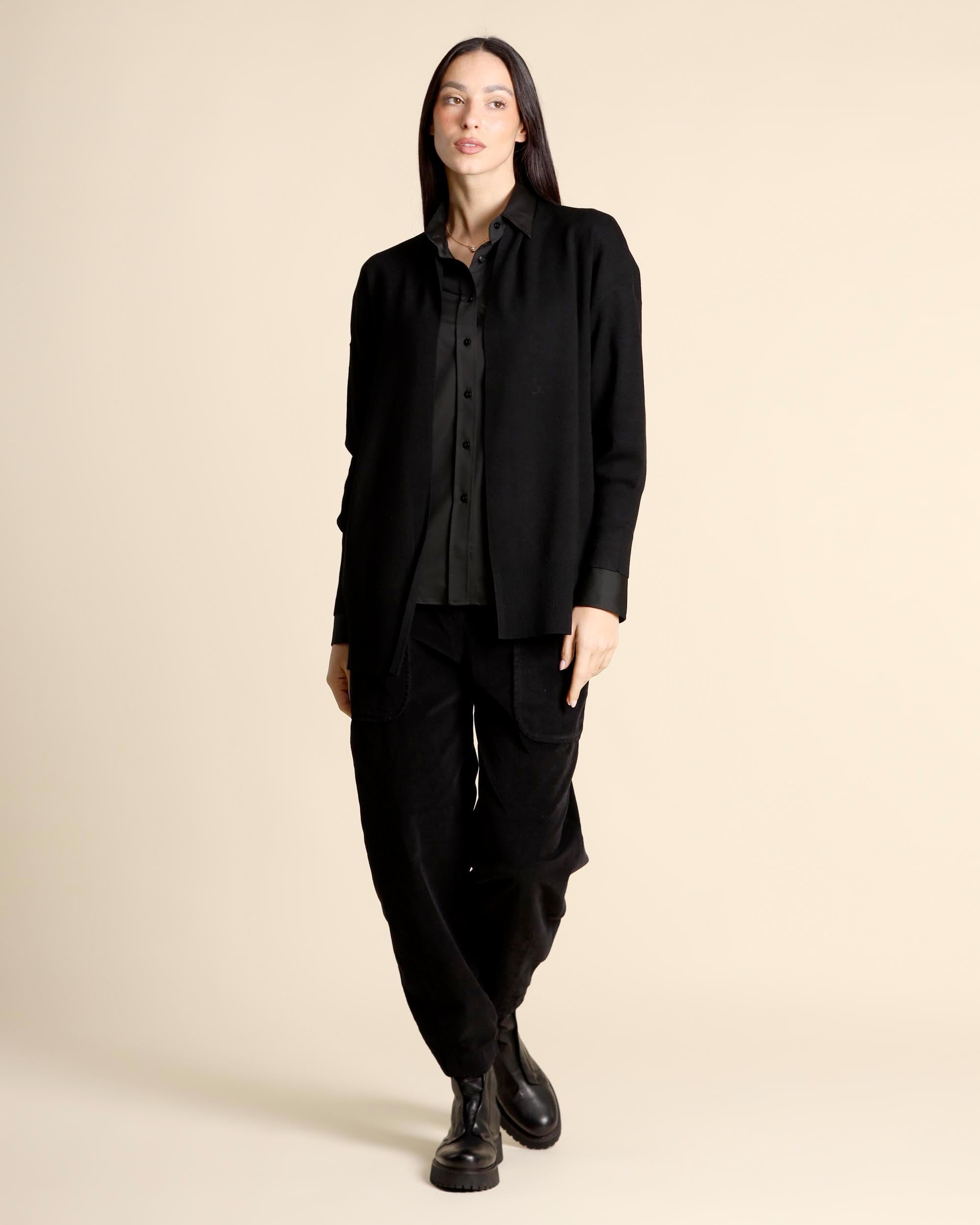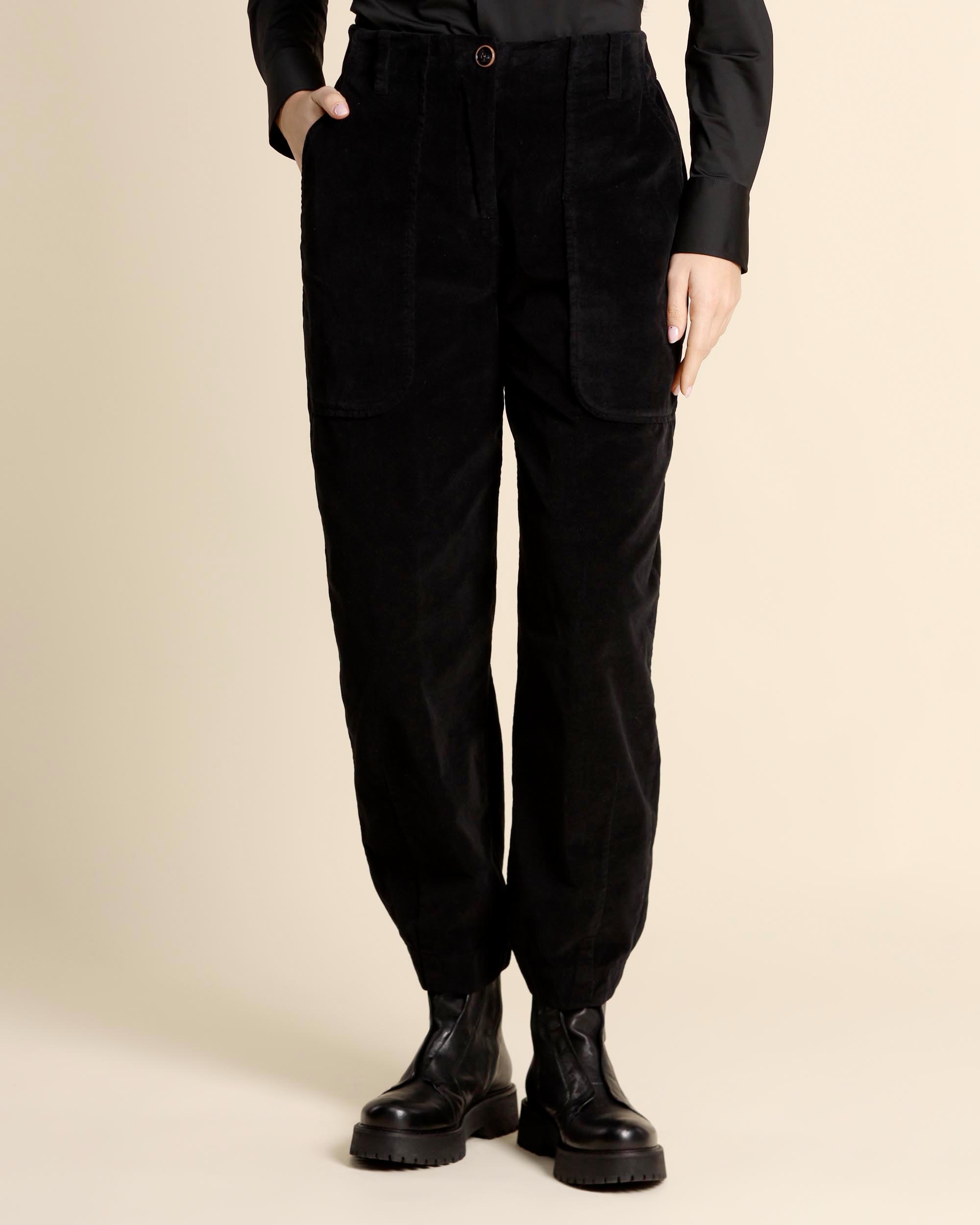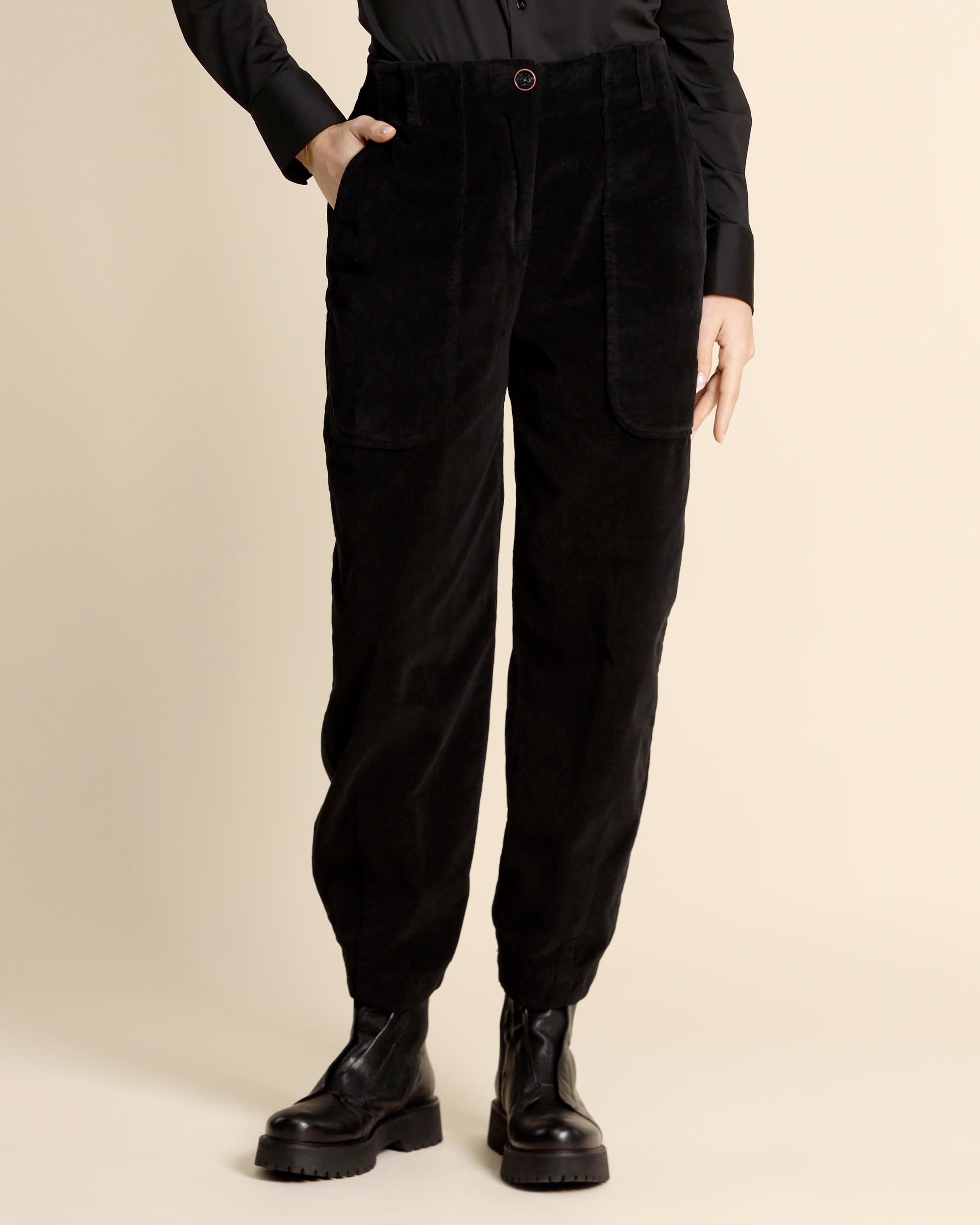 Pantaloni neri in velluto di cotone stretch, chiusura con bottone e zip nascosta, tasche applicate sul davanti e tasche applicate con bottone sul dietro, linea morbida leggermente più stretta sul fondo, made in Italy, la modella indossa una tg.42, la modella ha le seguenti misure: altezza 175, seno 86,vita 65, fianchi 93, collezione donna Alessia Santi Autunno Inverno 2025/26