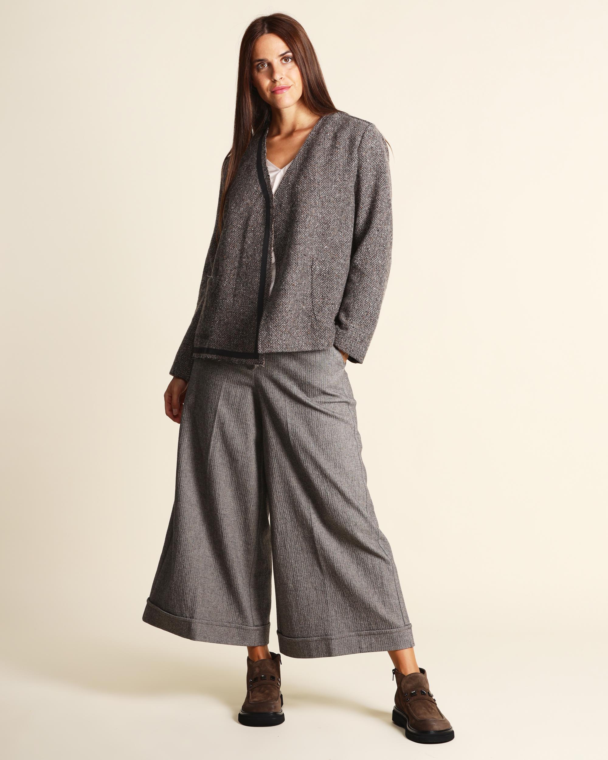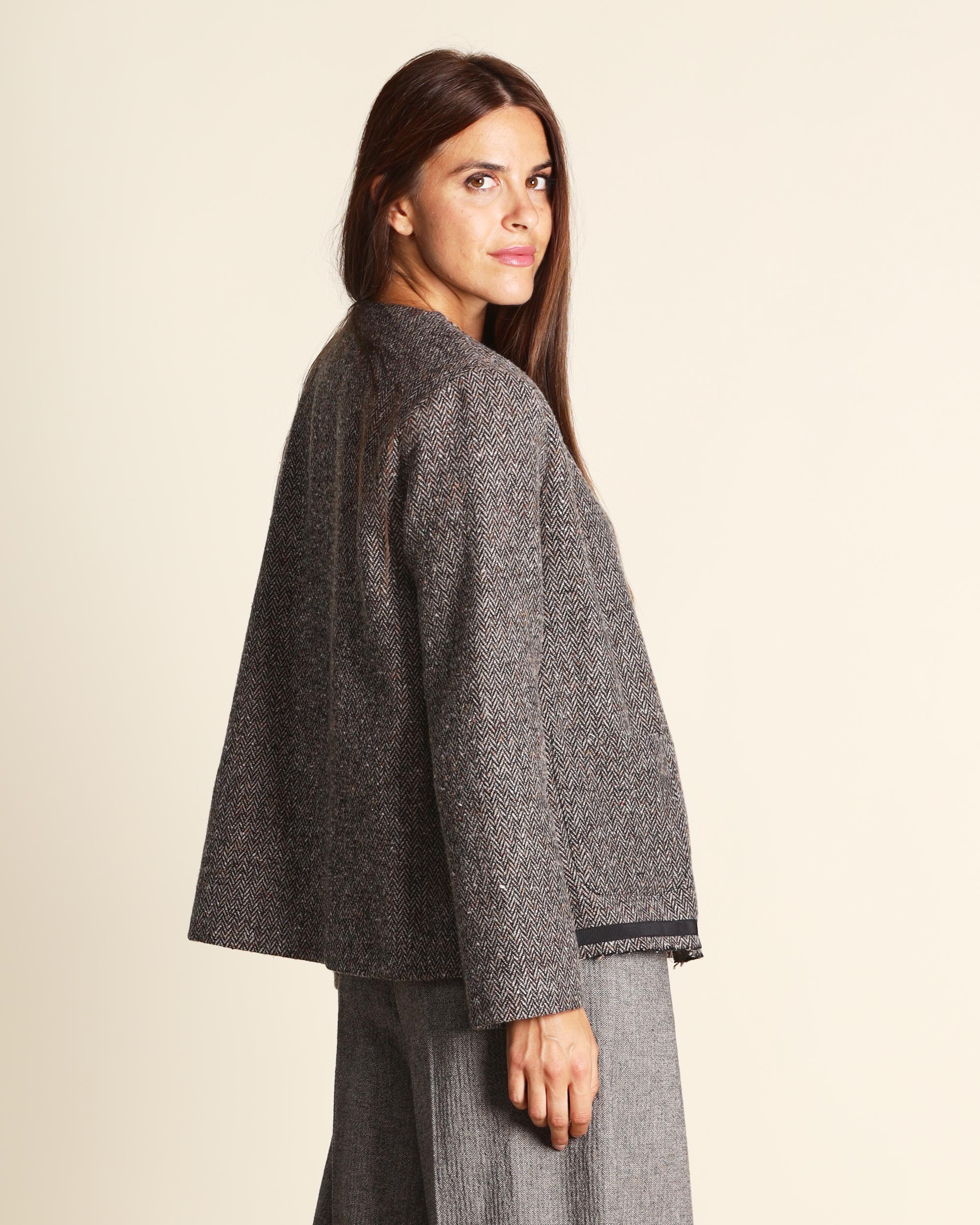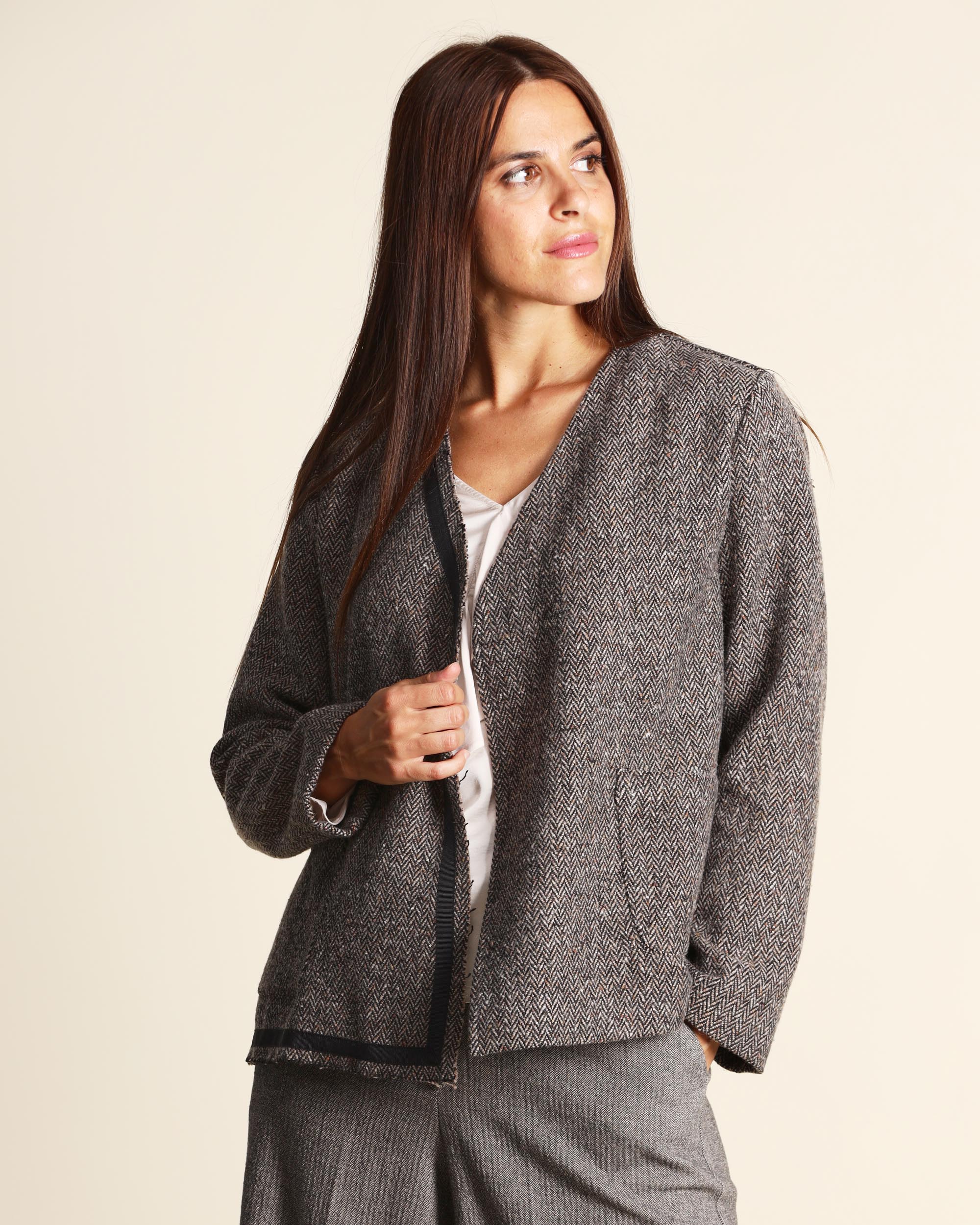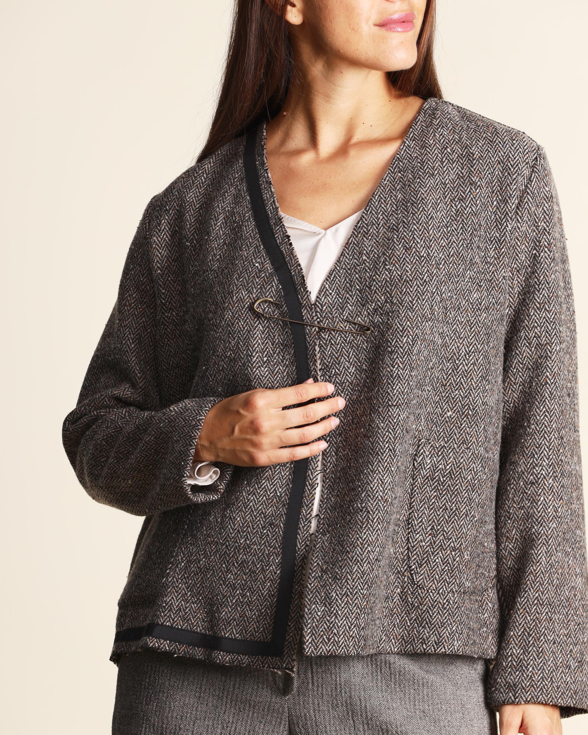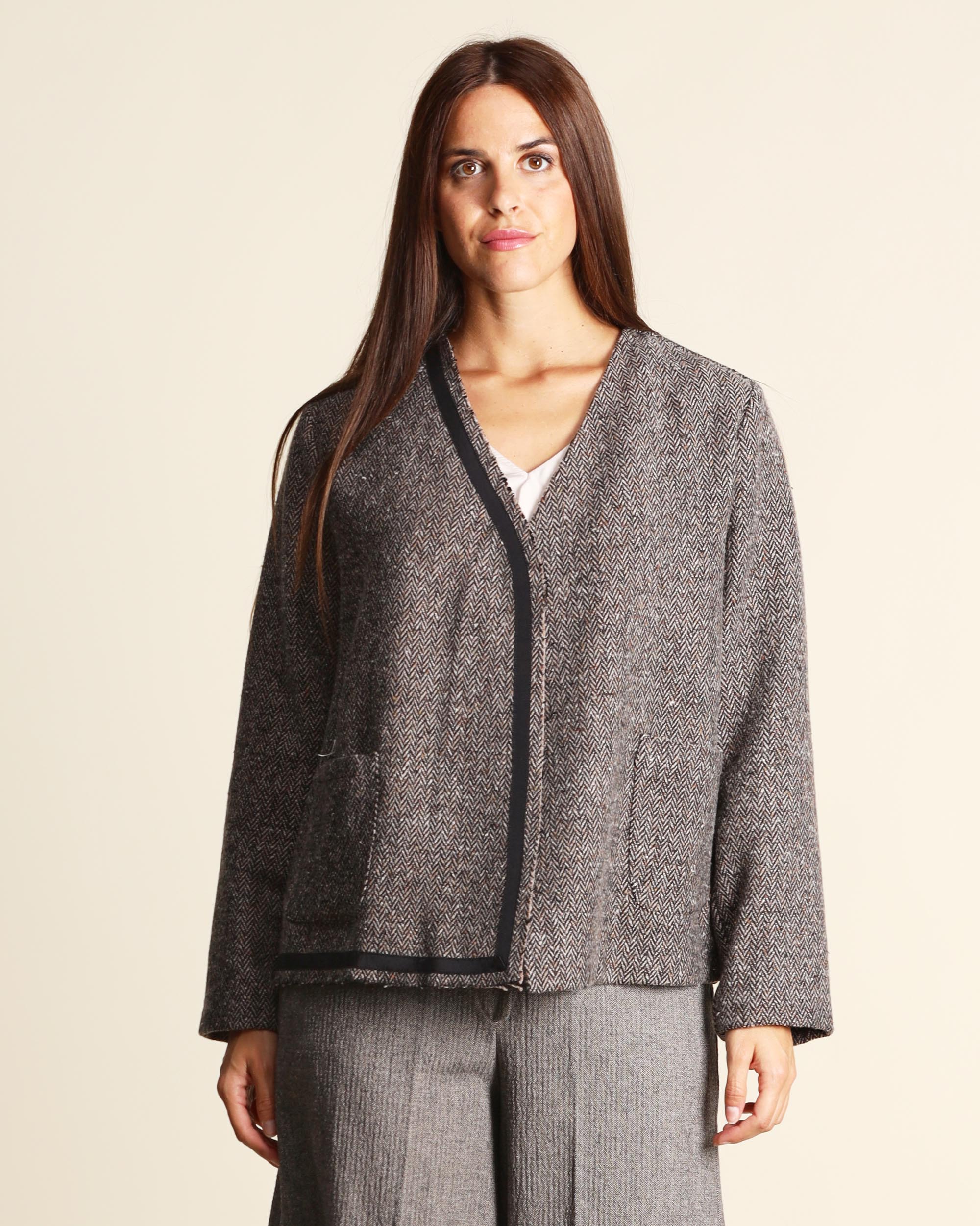 Giacca marrone spinata in misto lana e seta, scollo a V, maniche lunghe, senza bottoni, dettaglio di spilla per chiusura, tasche applicate, linea dritta, sfoderata, profilo in gros grain marrone, made in Italy, la modella indossa una tg.42, la modella ha le seguenti misure: altezza 178, seno 86,vita 65, fianchi 93, collezione donna Alessia Santi Autunno Inverno 2025/26