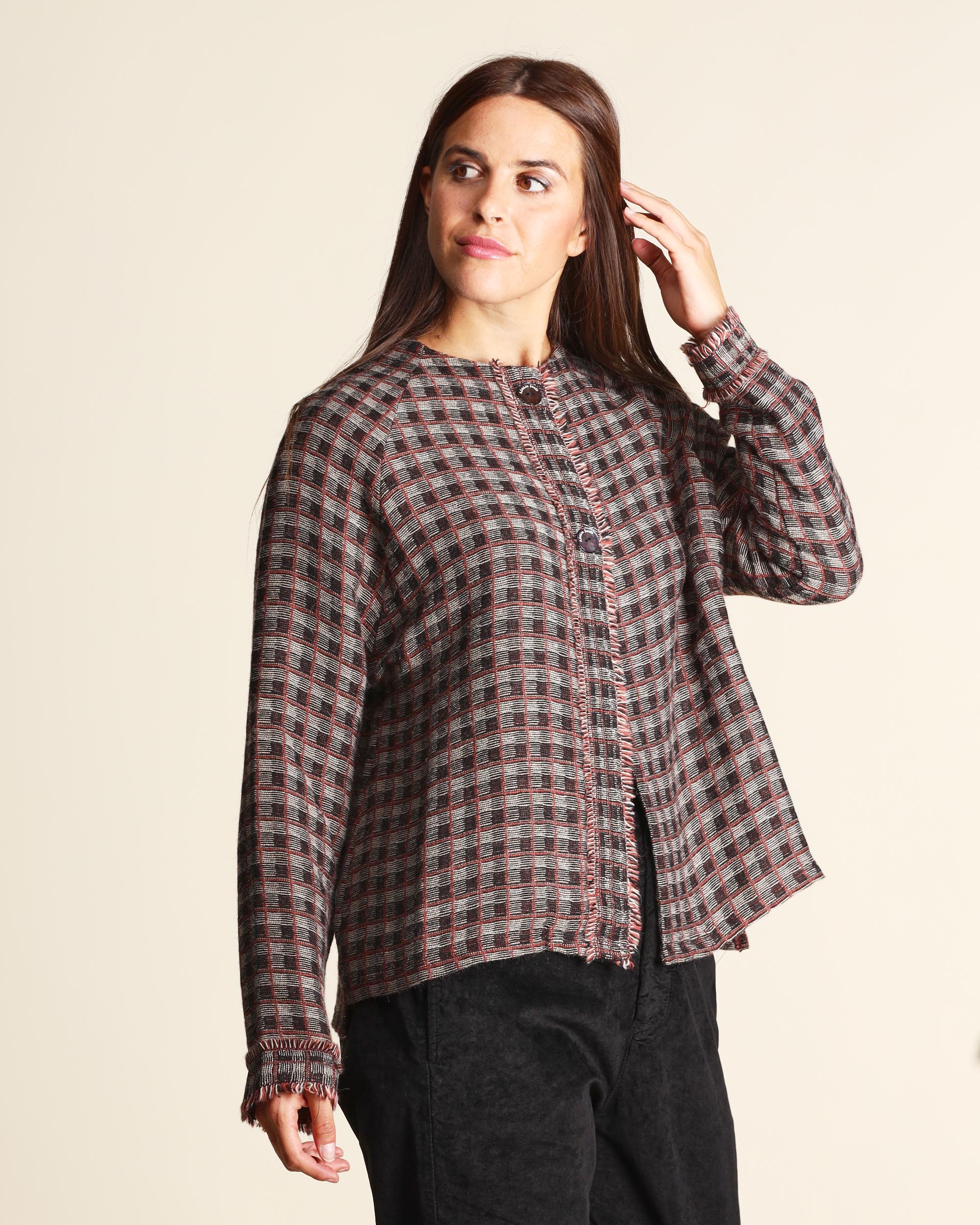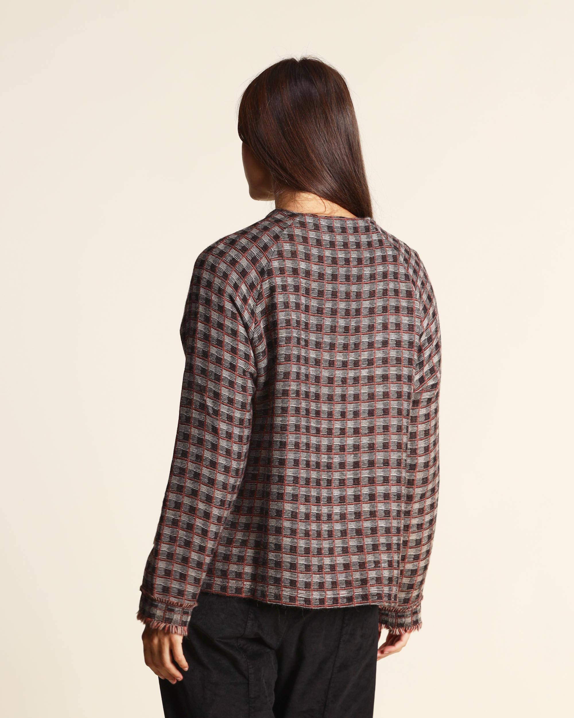 Giacca jacquard in maglia di misto modal, lana e alpaca, scollo tondo, linea morbida, chiusura con bottoni, maniche lunghe, foderata, profili con frangia, made in Italy, la modella indossa una tg.S, la modella ha le seguenti misure: altezza 178, seno 86,vita 65, fianchi 93, collezione donna Alessia Santi Autunno Inverno 2025/26