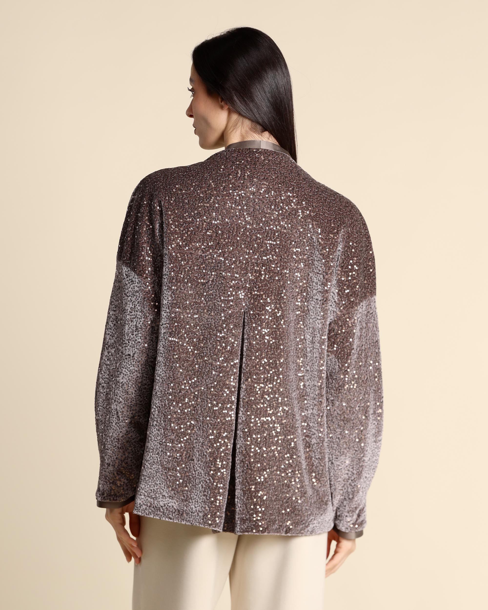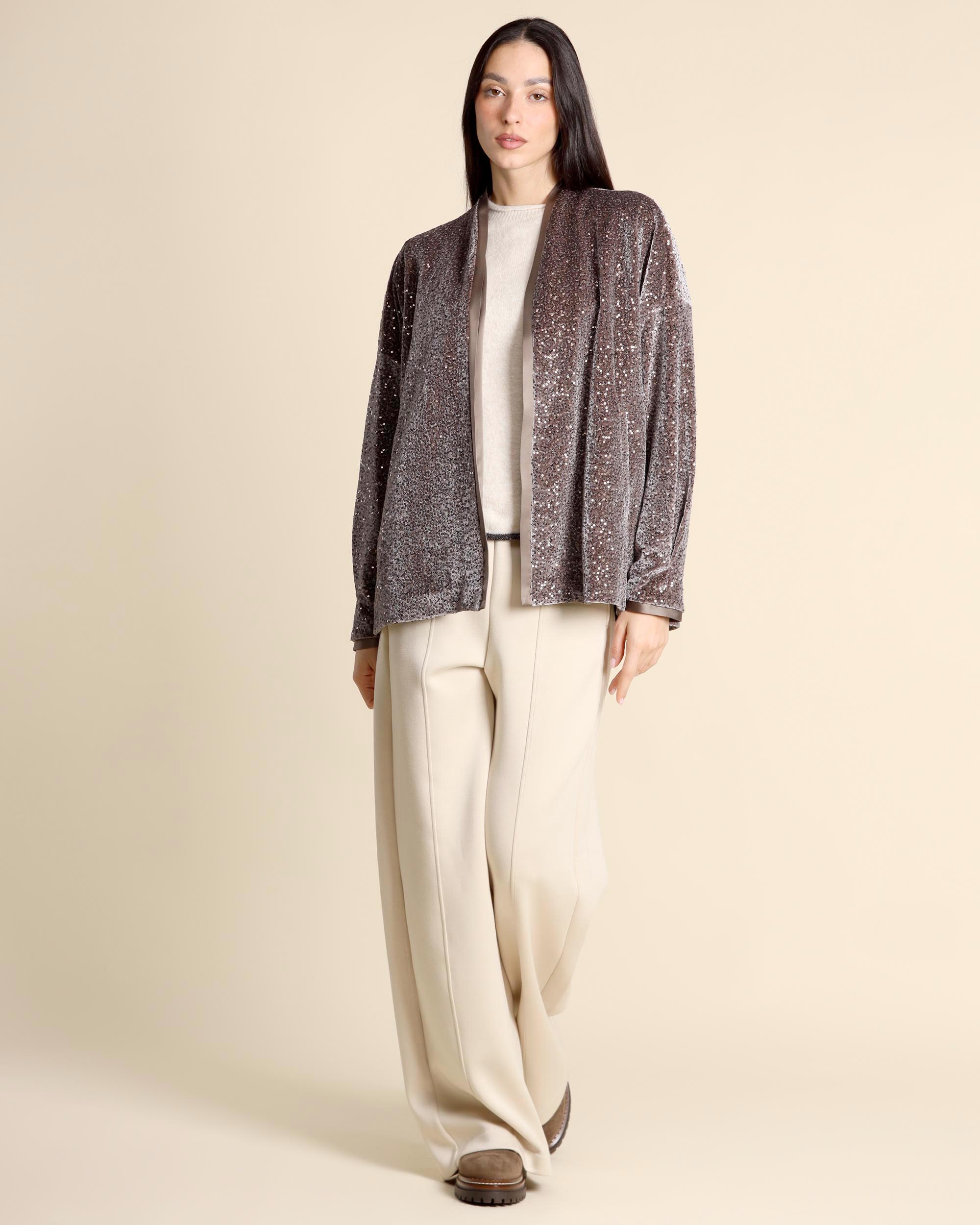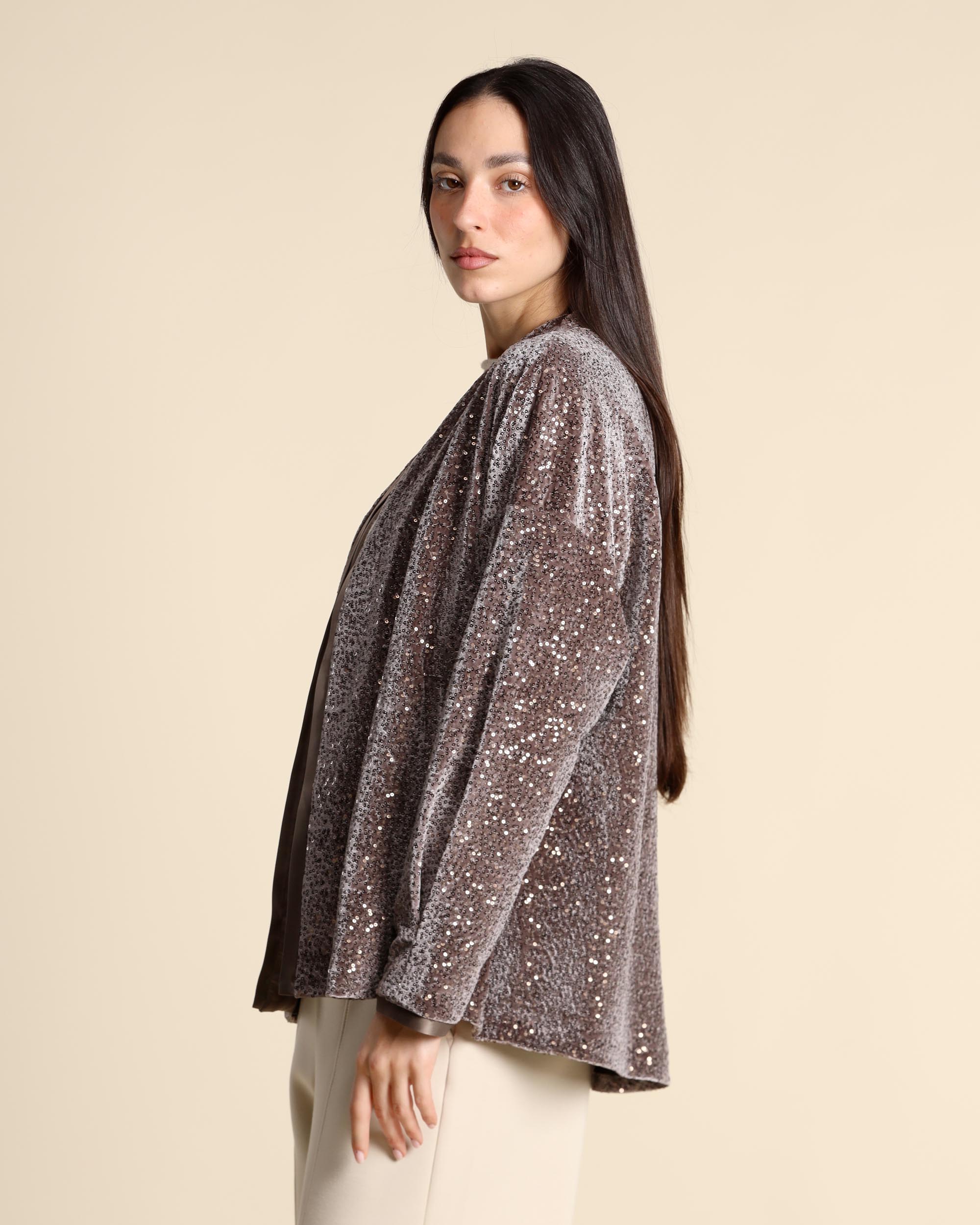 Giacca grigia in jersey con paillettes, linea morbida, senza bottoni, maniche lunghe, giro sceso, foderata, profili in raso, made in Italy, la modella indossa una tg.S, la modella ha le seguenti misure: altezza 178, seno 86,vita 65, fianchi 93, collezione donna Alessia Santi Autunno Inverno 2025/26