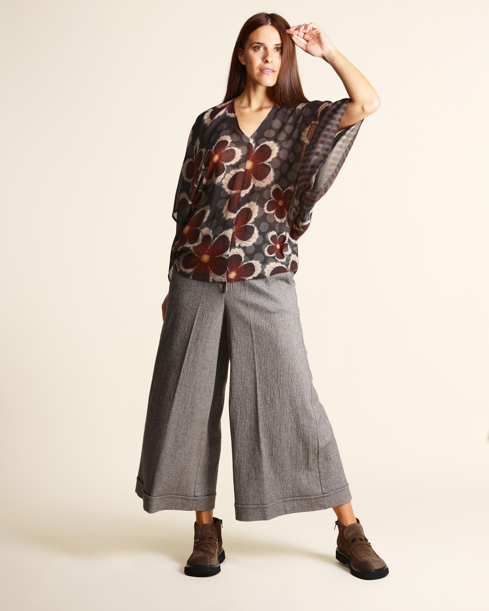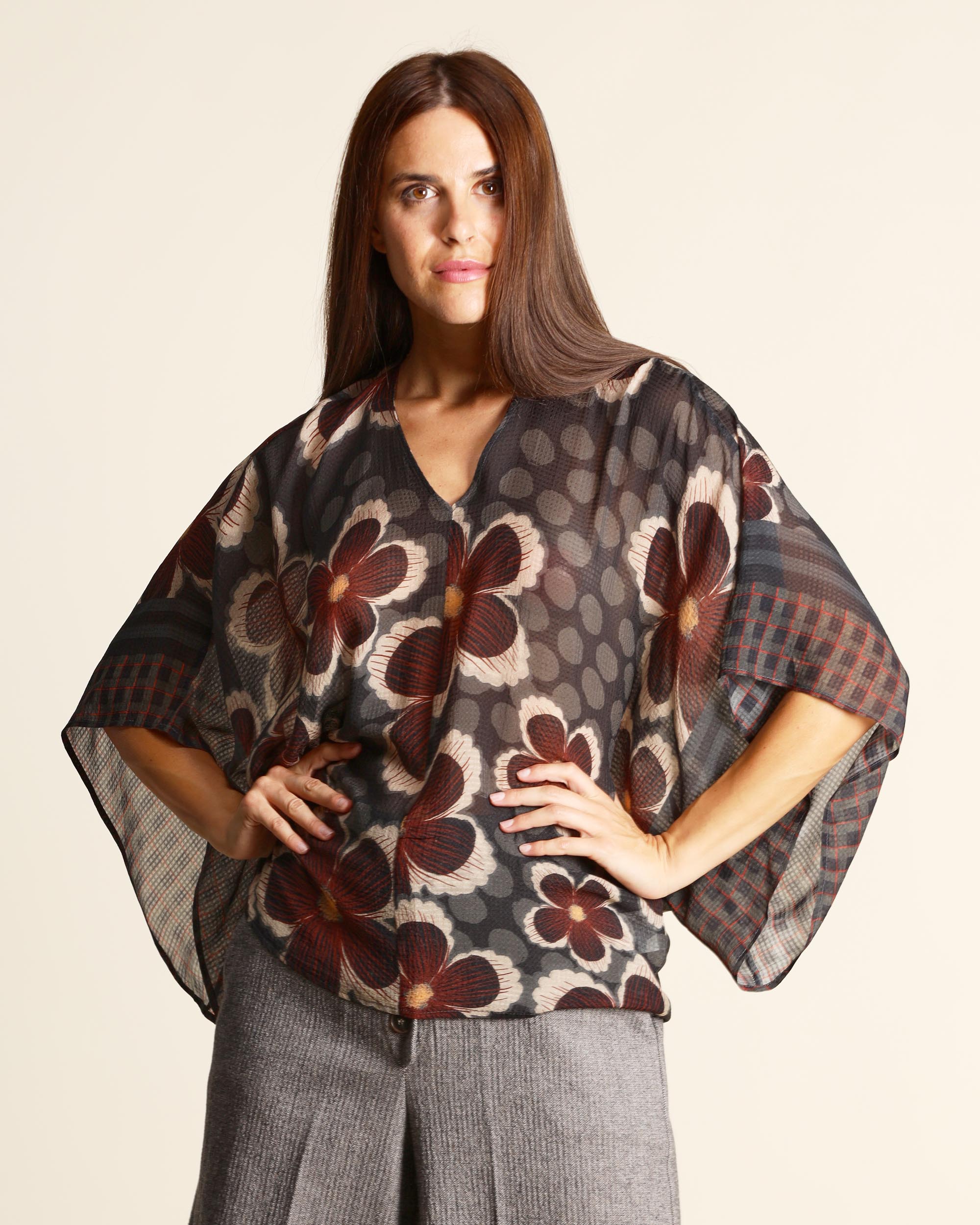 Blusa a fantasia in georgette di seta, scollo a V, linea ampia, maniche kimono, made in Italy, la modella indossa una tg.42, la modella ha le seguenti misure: altezza 178, seno 86,vita 65, fianchi 93, collezione donna Alessia Santi Autunno Inverno 2025/26