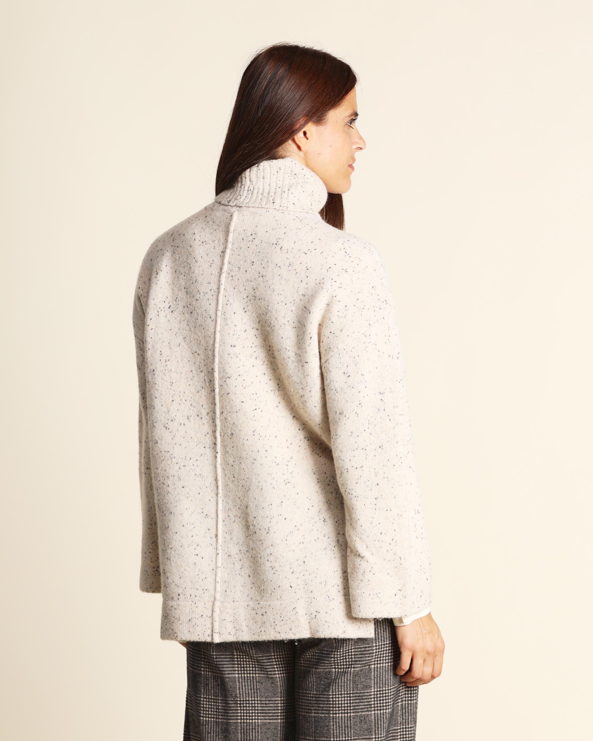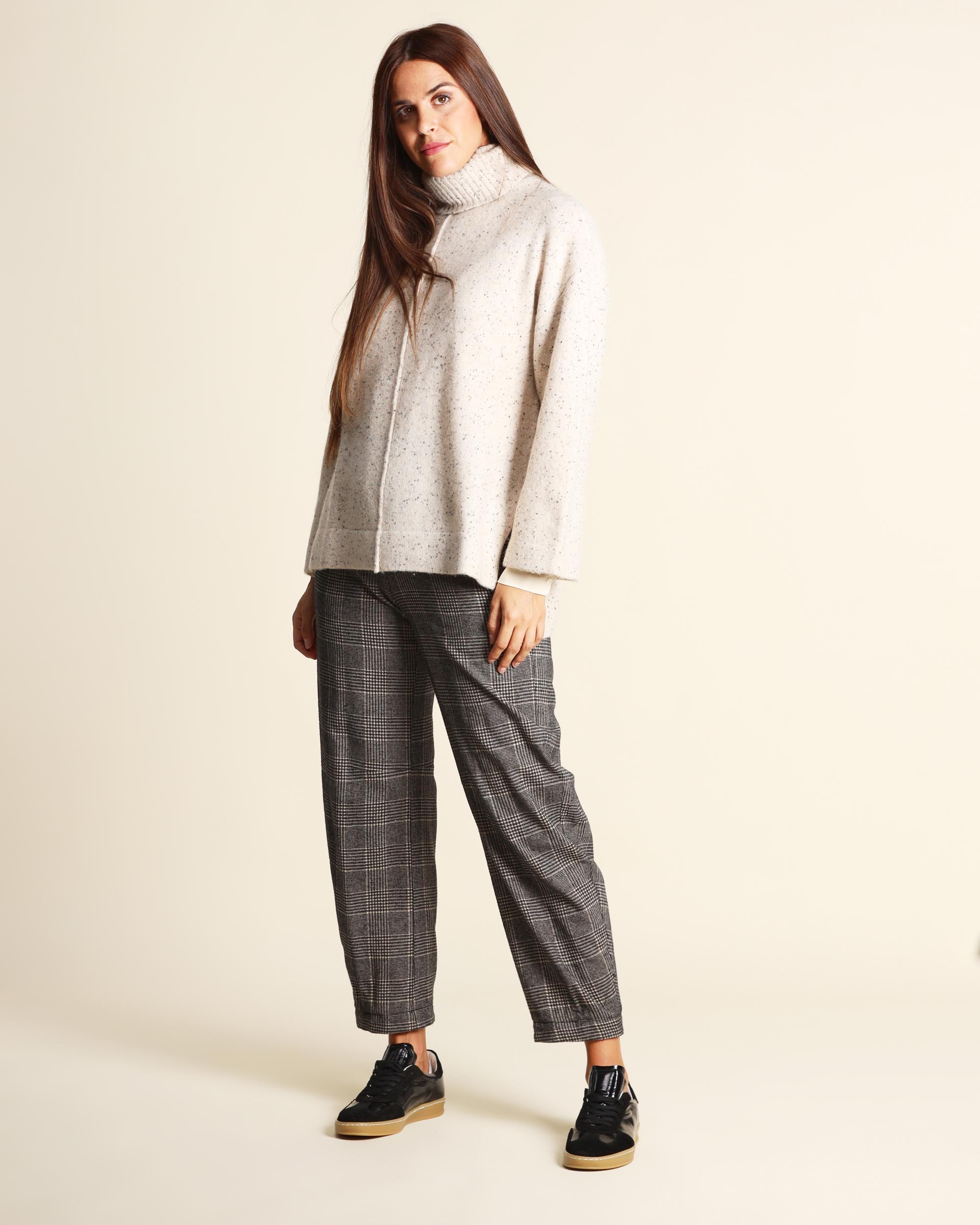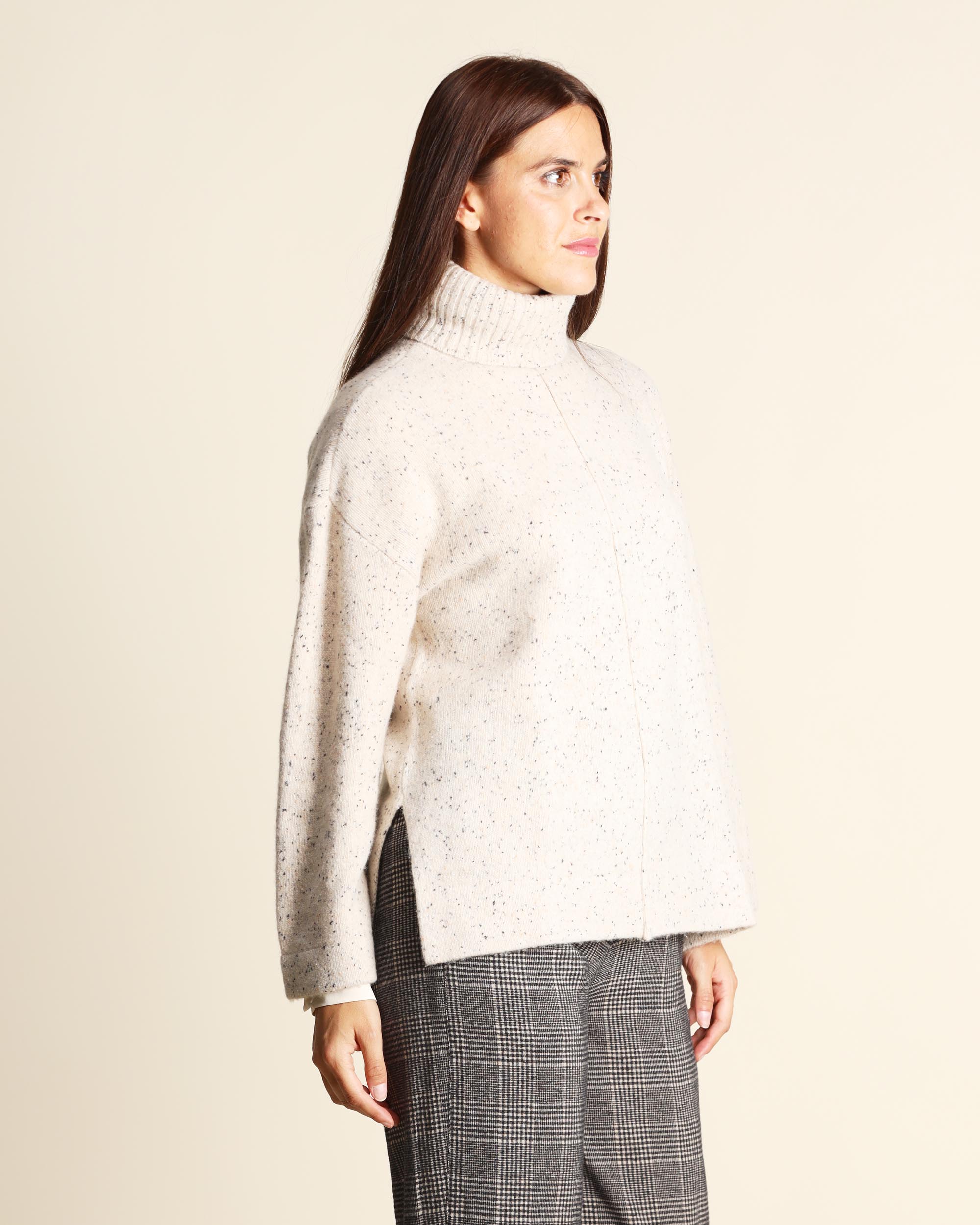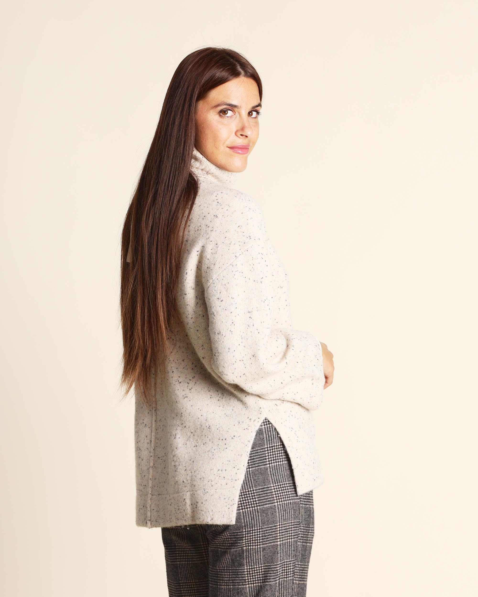 Maglia beige melange in lana, collo alto, giro sceso, linea morbida, maniche tre quarti, spacchi laterali, fondo più lungo dietro, la modella indossa una tg.S, la modella ha le seguenti misure: altezza 178, seno 86,vita 65, fianchi 93, collezione donna Alessia Santi Autunno Inverno 2025/26