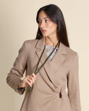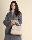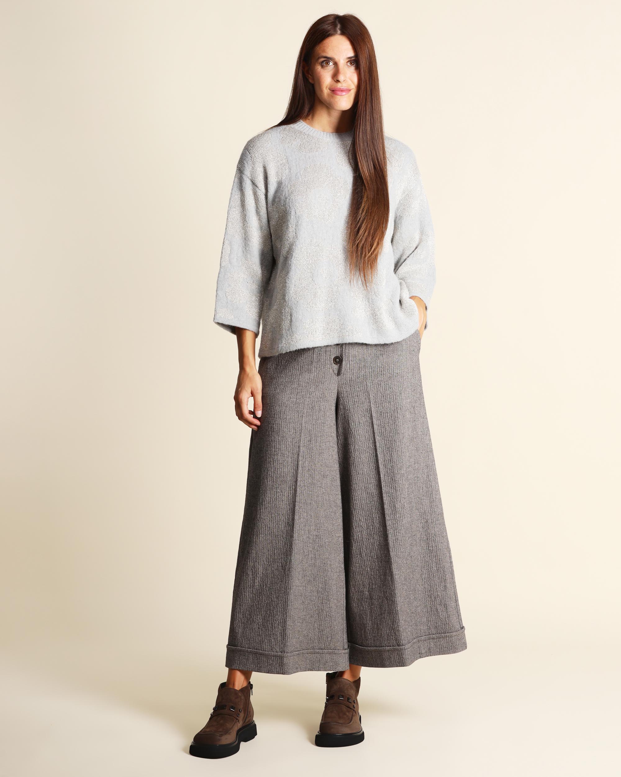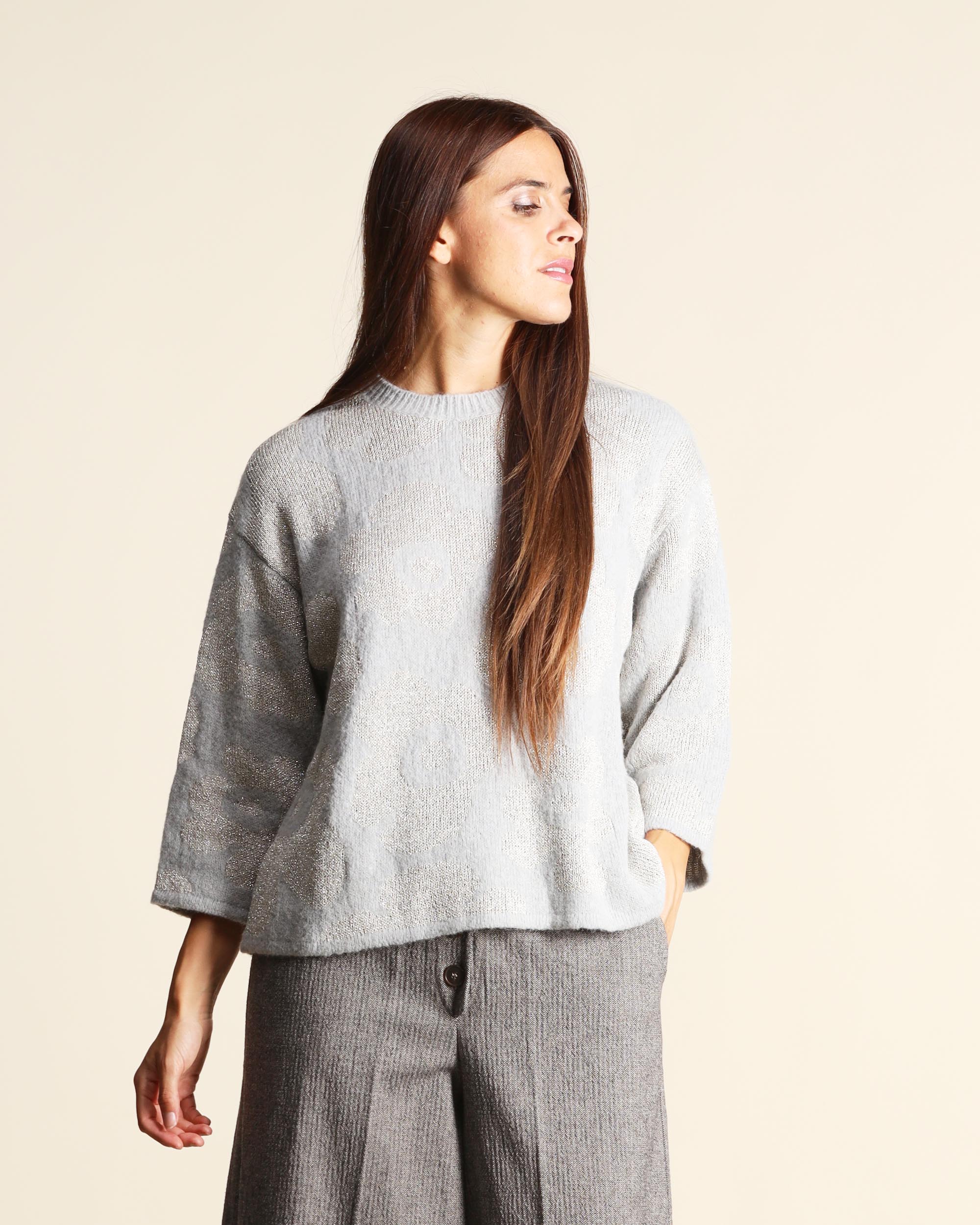 Maglia grigio beige jacquard in misto viscosa, alpaca e lana con lurex, scollo tondo, giro sceso, linea morbida, maniche tre quarti, made in Italy, la modella indossa una tg.S, la modella ha le seguenti misure: altezza 178, seno 86,vita 65, fianchi 93, collezione donna Alessia Santi Autunno Inverno 2025/26
