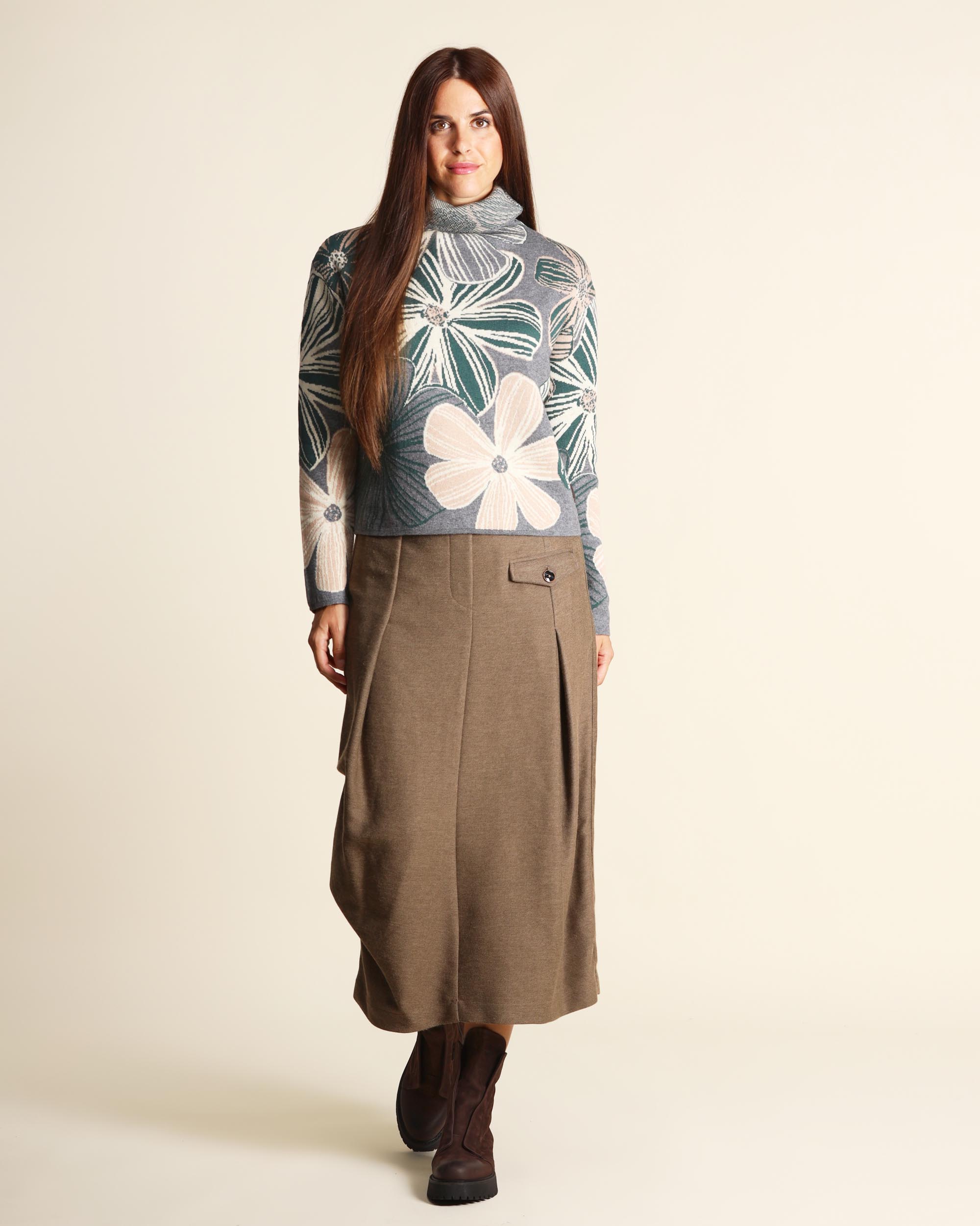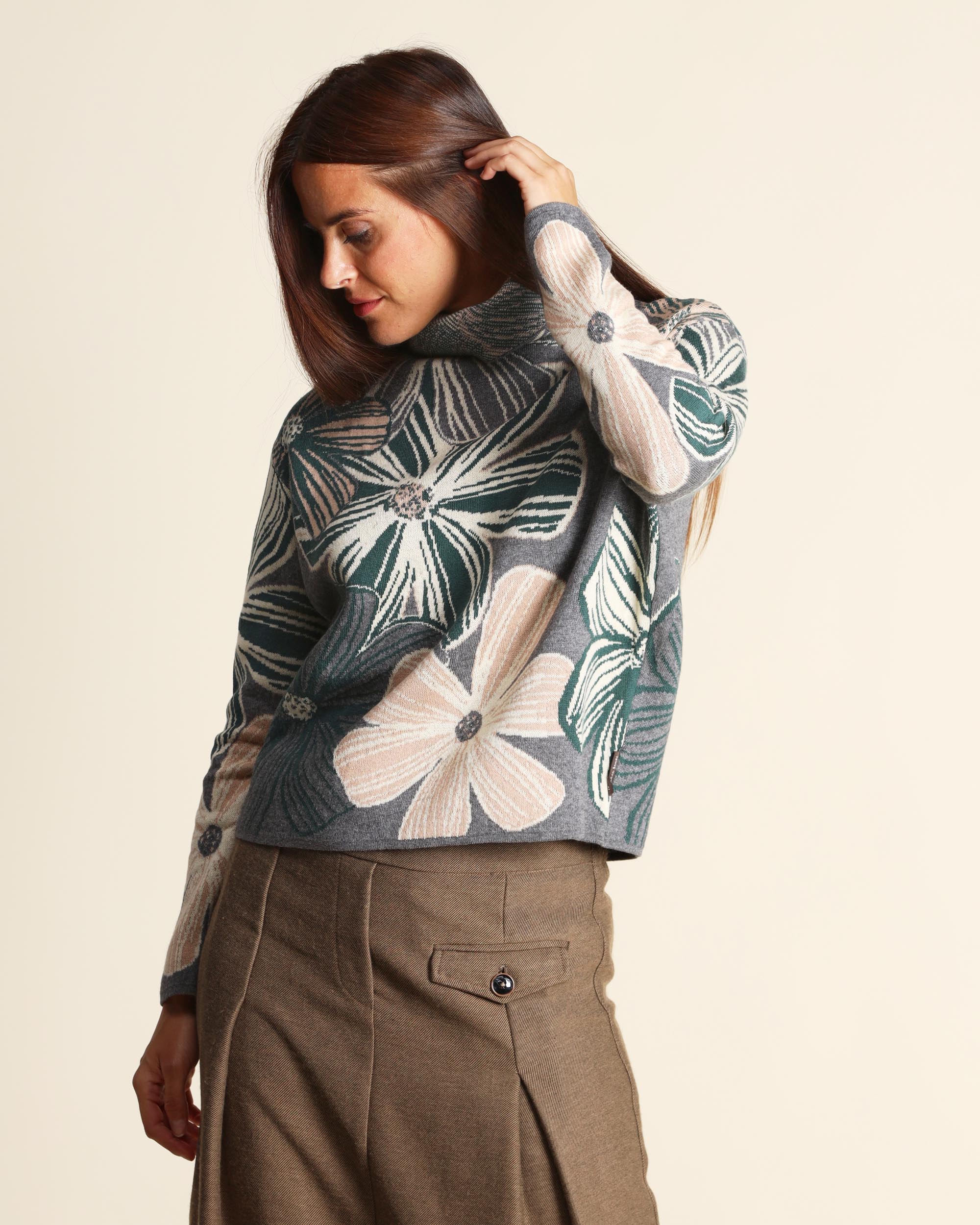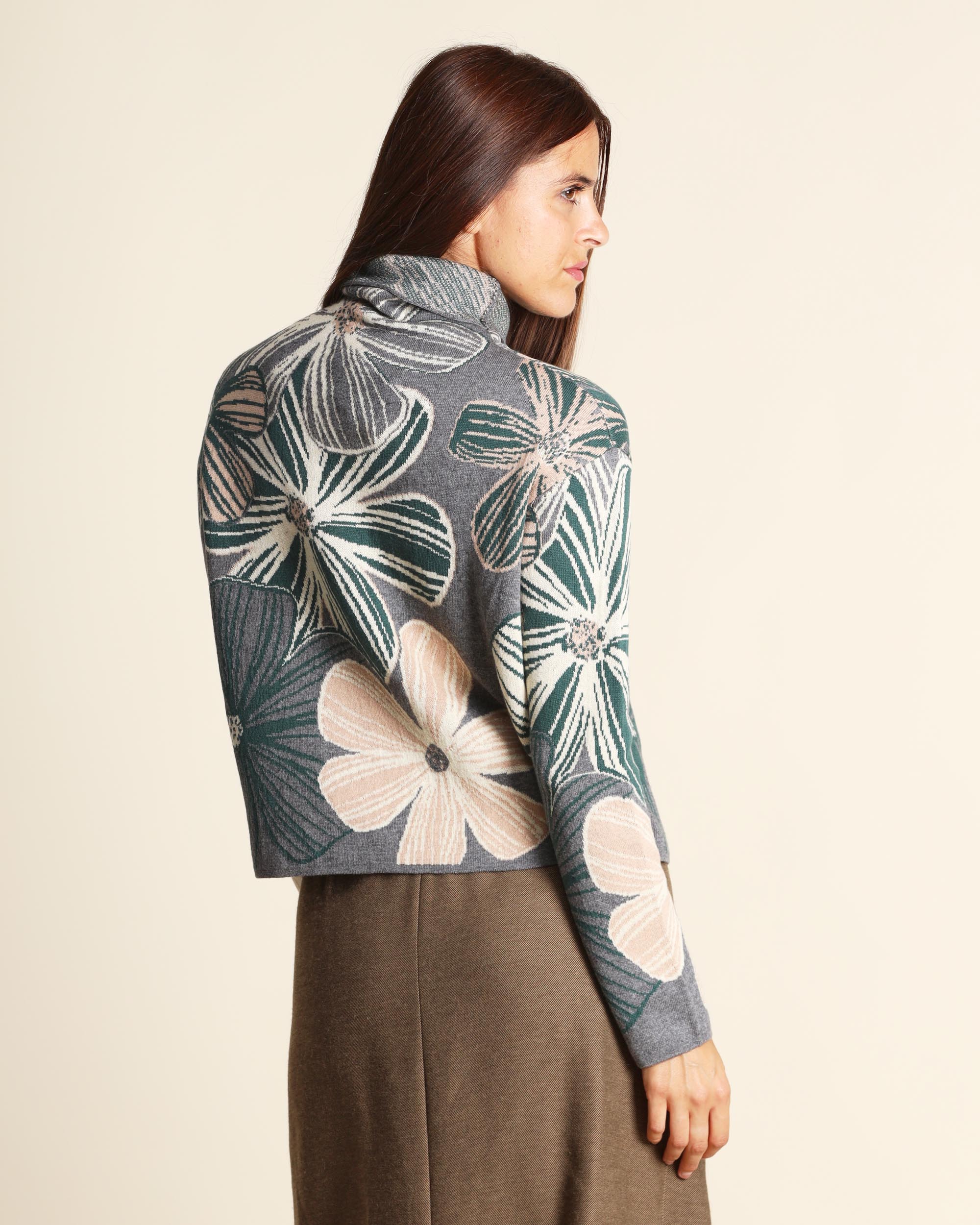 Maglia grigio verde jacquard in cotone e lana, collo alto, giro sceso, linea morbida, maniche lunghe, made in Italy, la modella indossa una tg.S, la modella ha le seguenti misure: altezza 178, seno 86,vita 65, fianchi 93, collezione donna Alessia Santi Autunno Inverno 2025/26