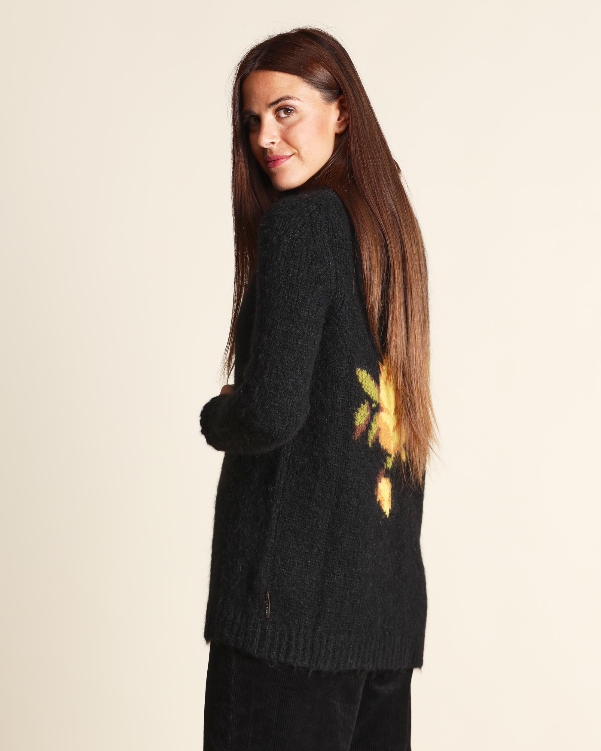 Cardigan nero in misto alpaca con intarsio sul dietro, senza bottoni, linea dritta, maniche lunghe, made in Italy, la modella indossa una tg.S, la modella ha le seguenti misure: altezza 178, seno 86,vita 65, fianchi 93, collezione donna Alessia Santi Autunno Inverno 2025/26