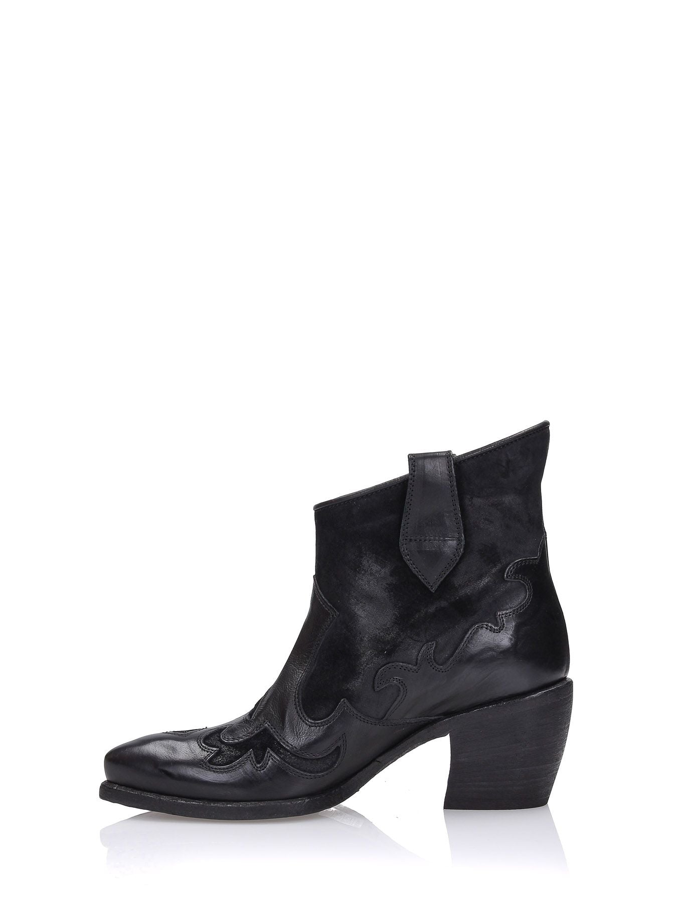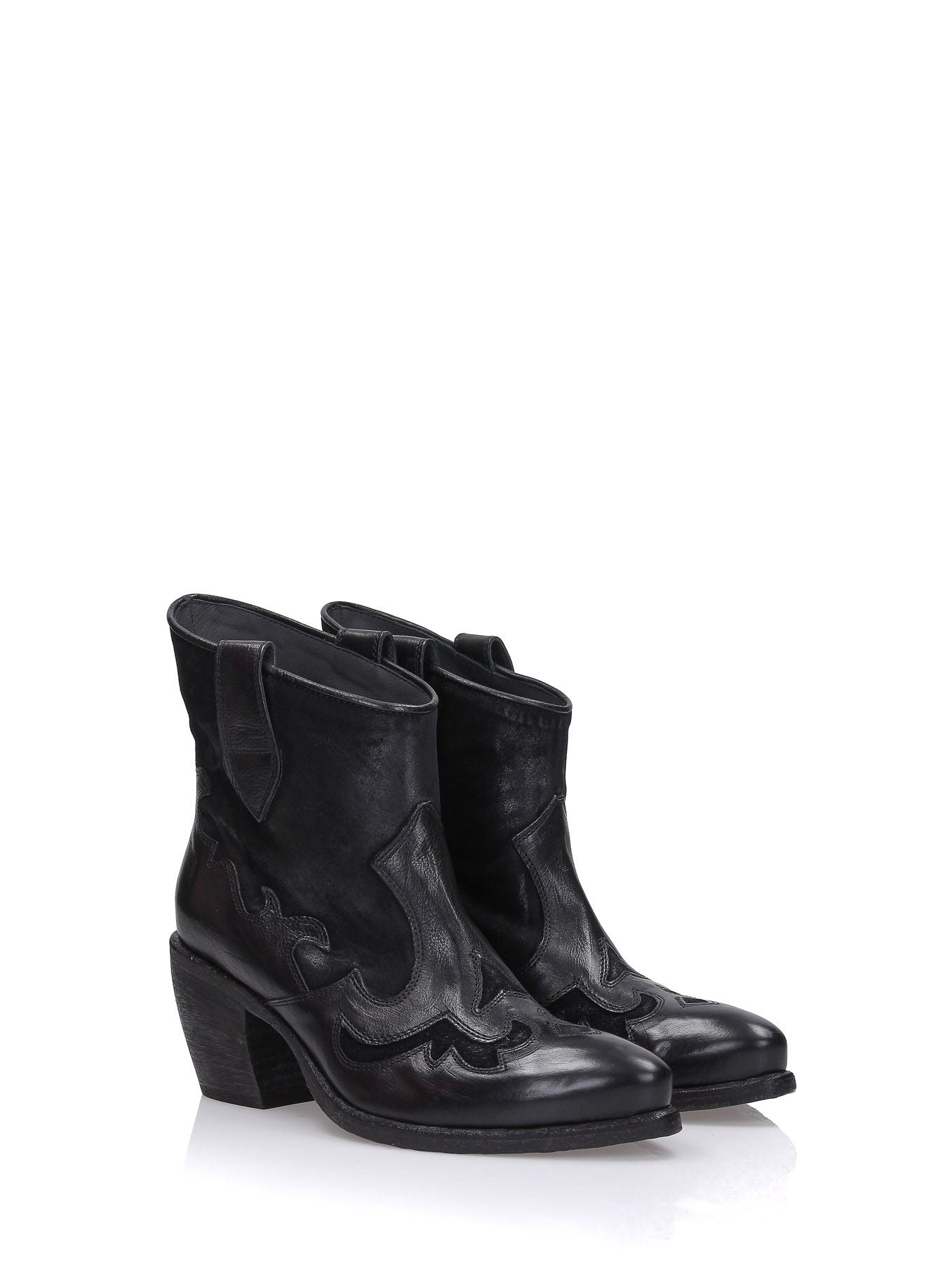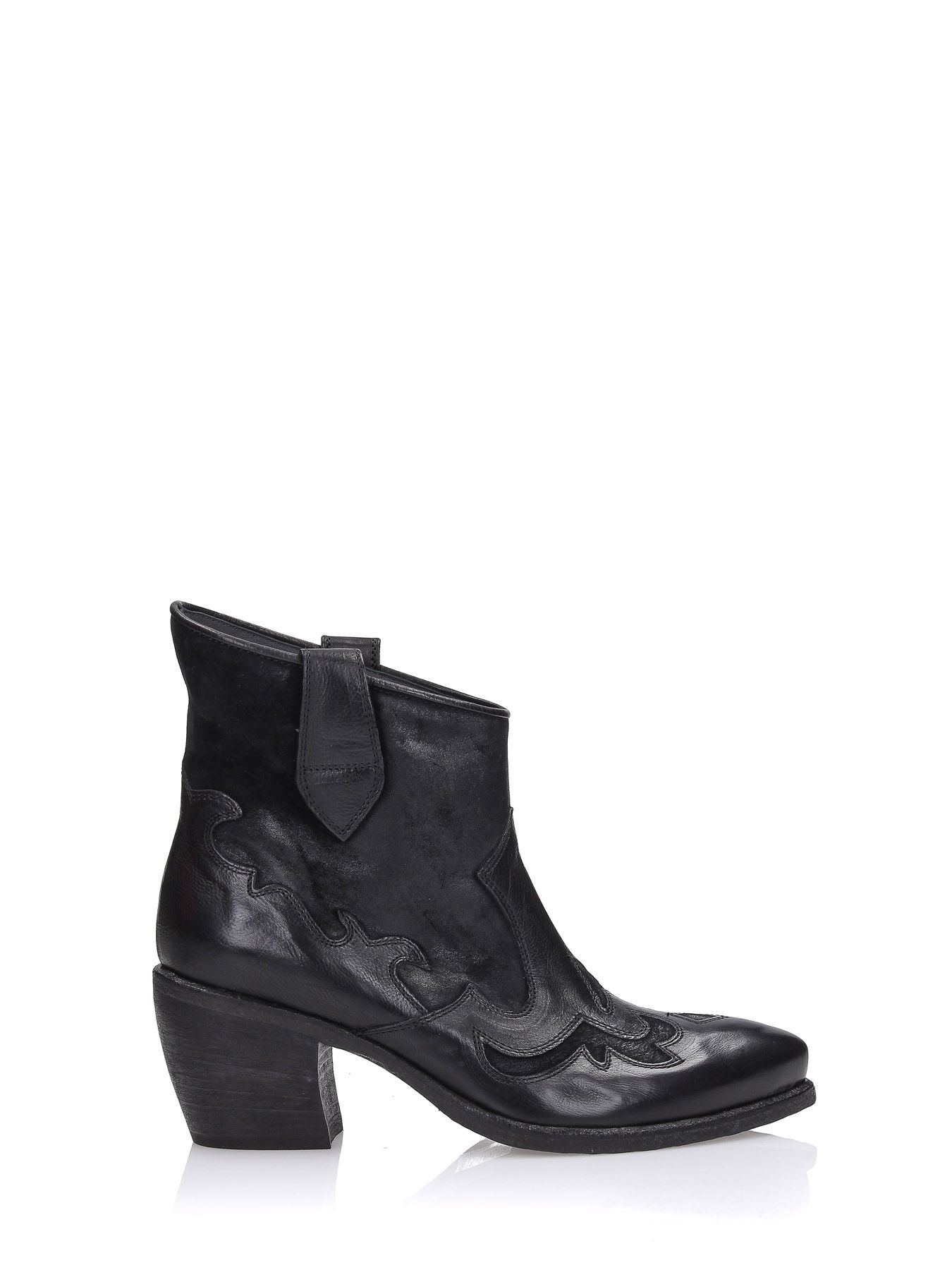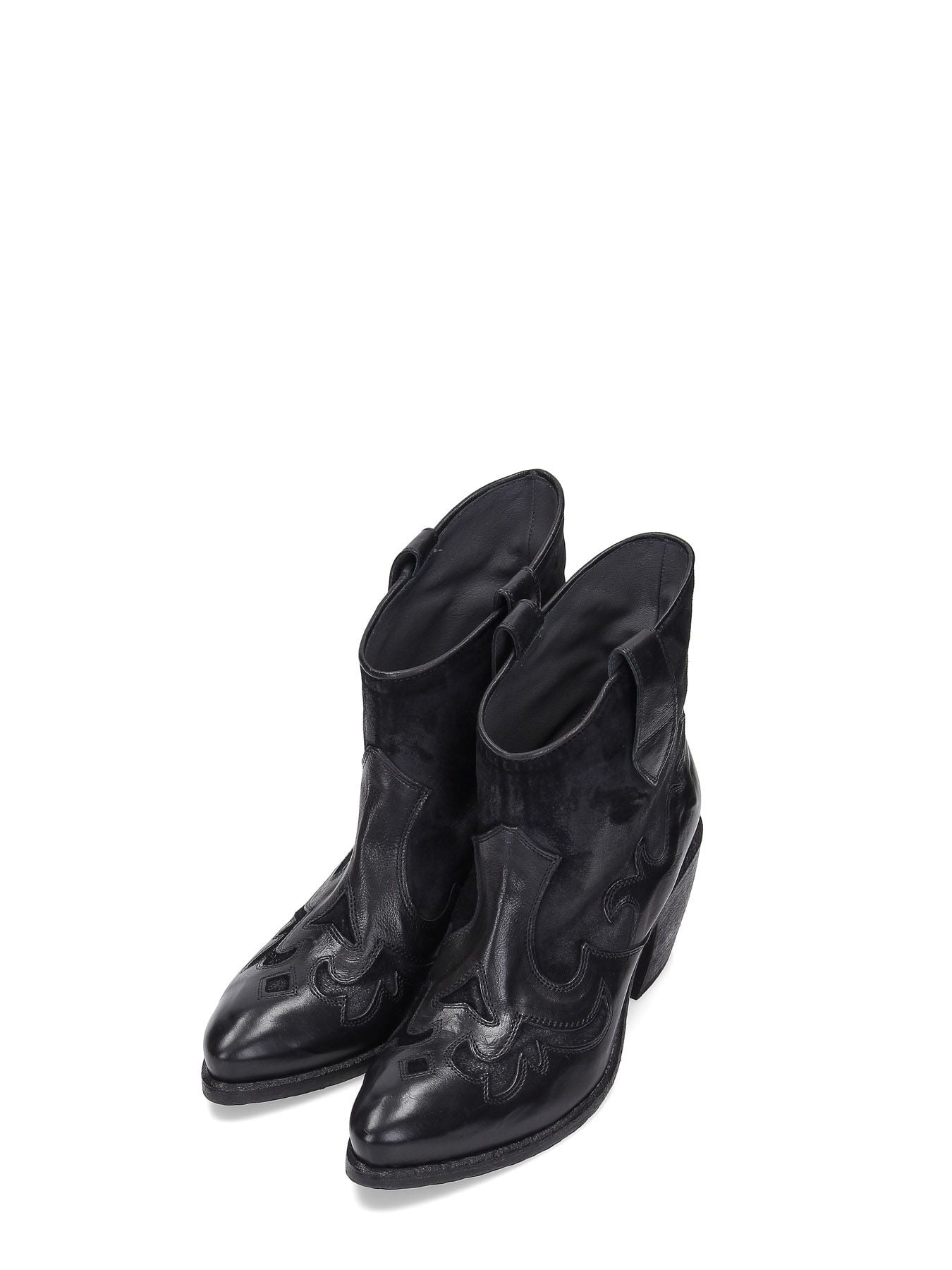 Stivaletti texani in pelle nera, doppia tipologia di pellame che mette in risalto la lavorazione e i ricami,, fodera in pelle, suola in cuoio, tacco in cuoio 70mm, a punta, sottopiede in pelle, tiranti laterali in pelle, lavorazione artigianale, made in Italy, collezione donna Fruit Autunno Inverno 2019/2020