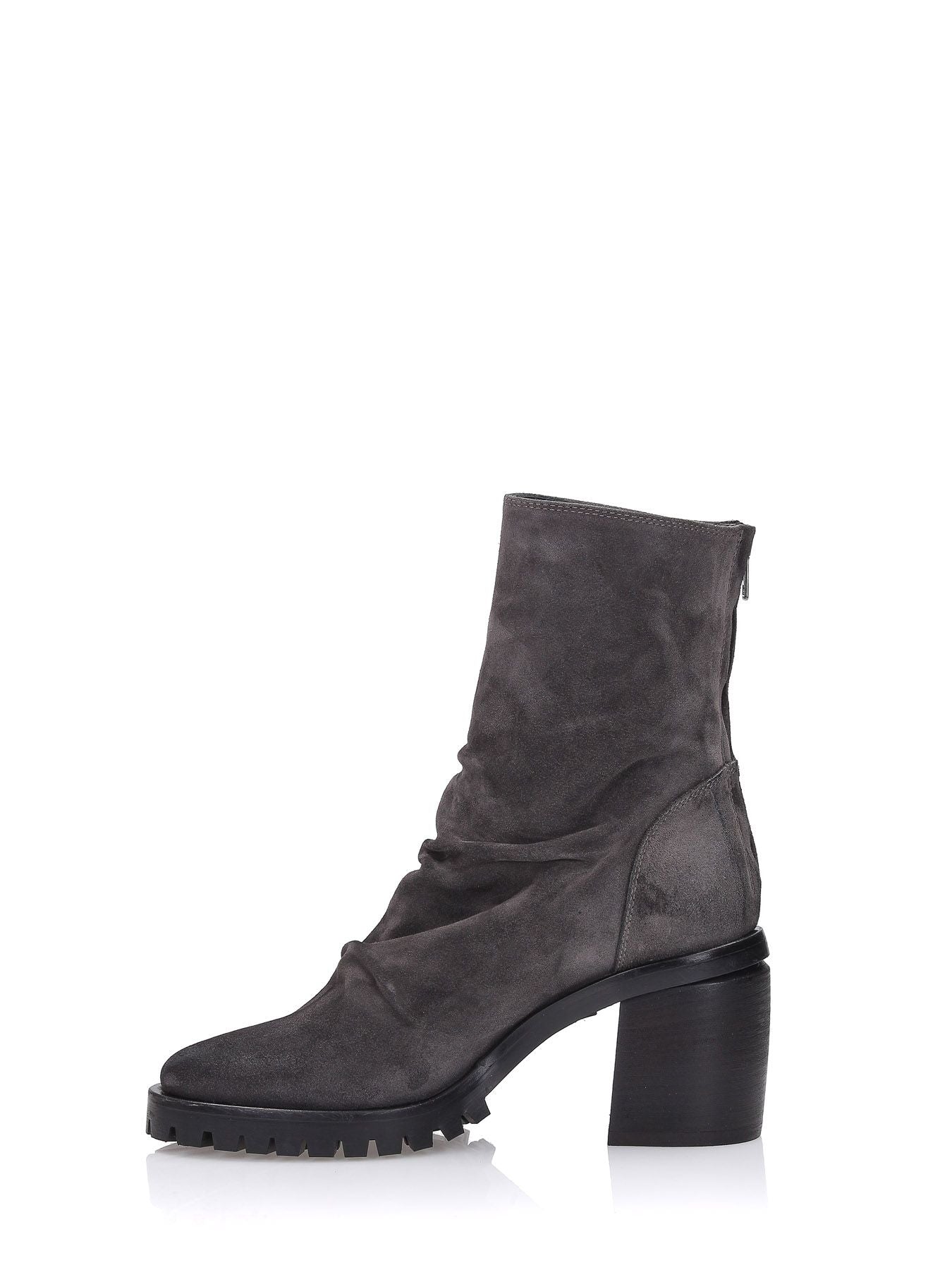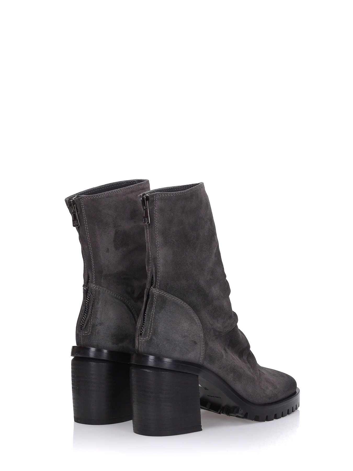 Stivaletti in velour tamponato grigio lavagna, chiusura con zip posteriore, dettaglio di arricciature sul collo del piede, fodera in pelle, suola in gomma 15mm, tacco 70mm, punta tonda, sottopiede in pelle, lavorazione artigianale, made in Italy, collezione donna Fruit Autunno Inverno 2019/2020