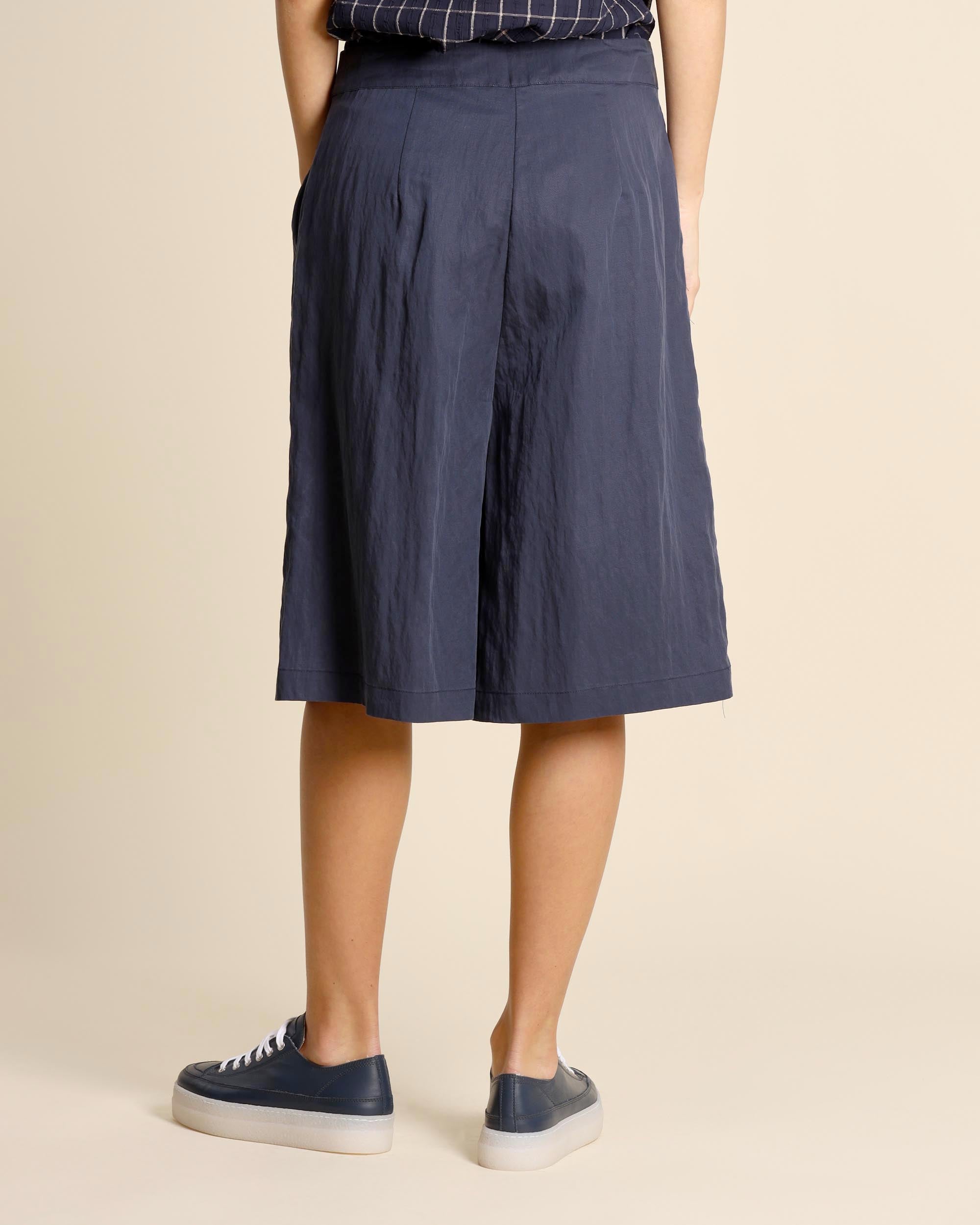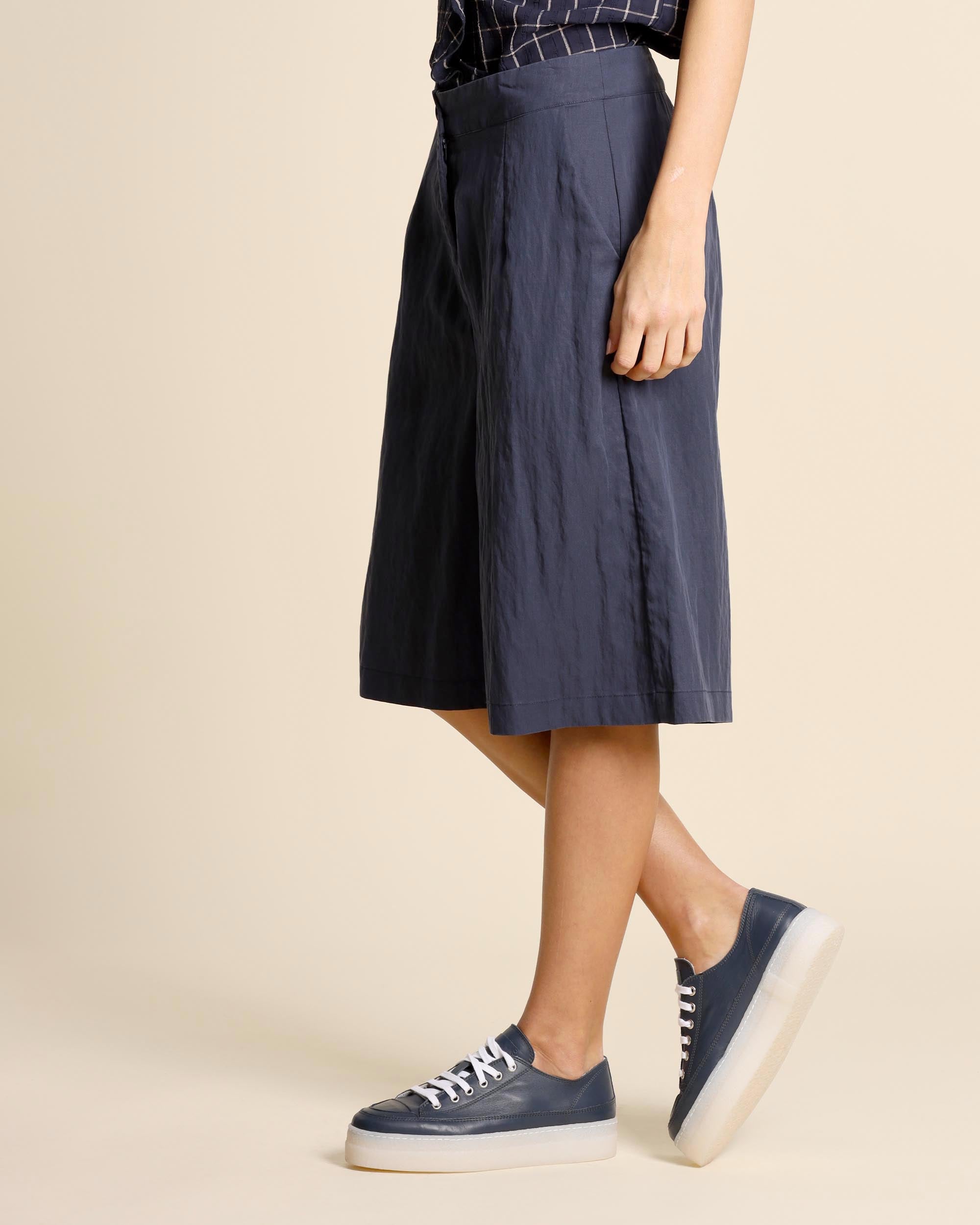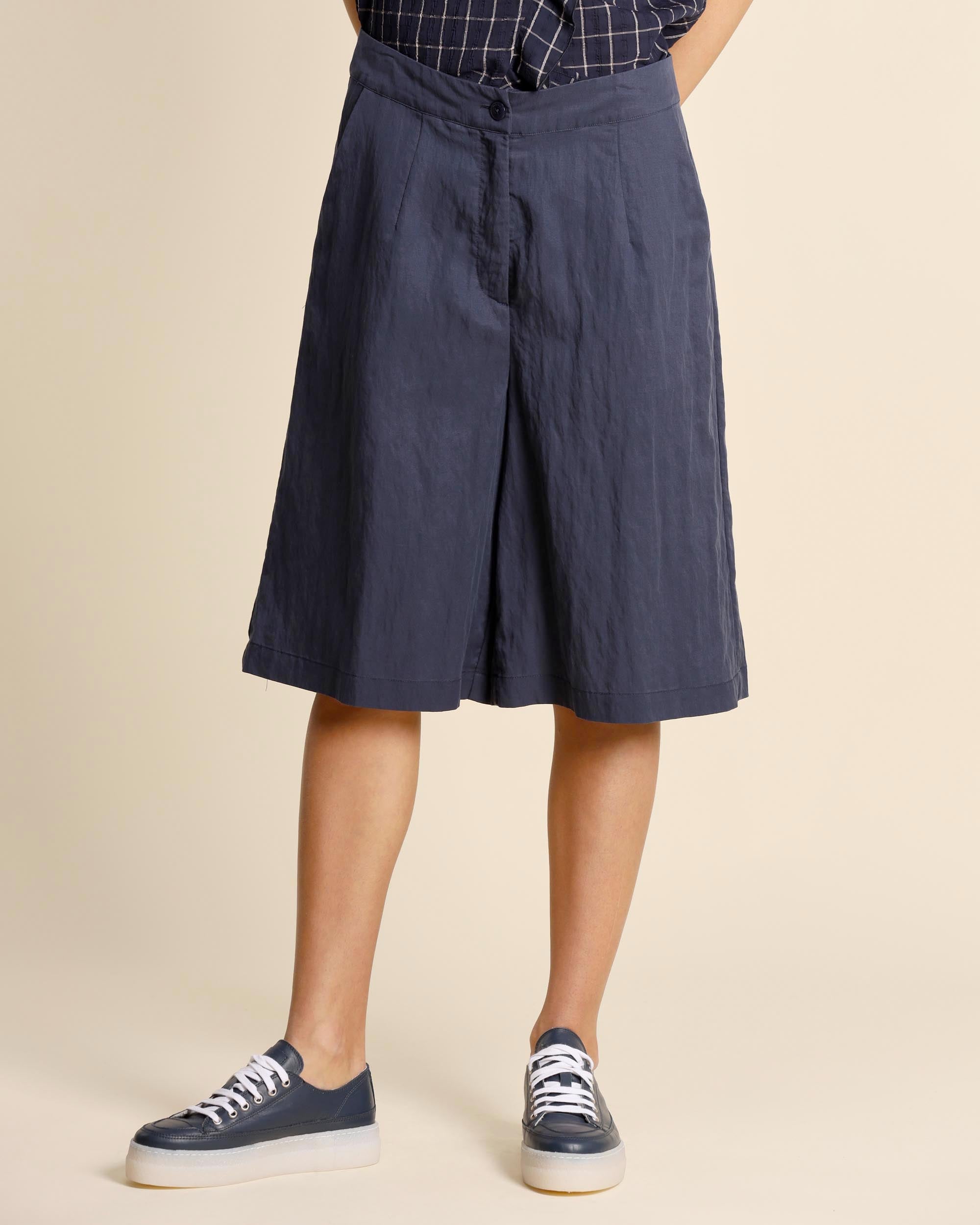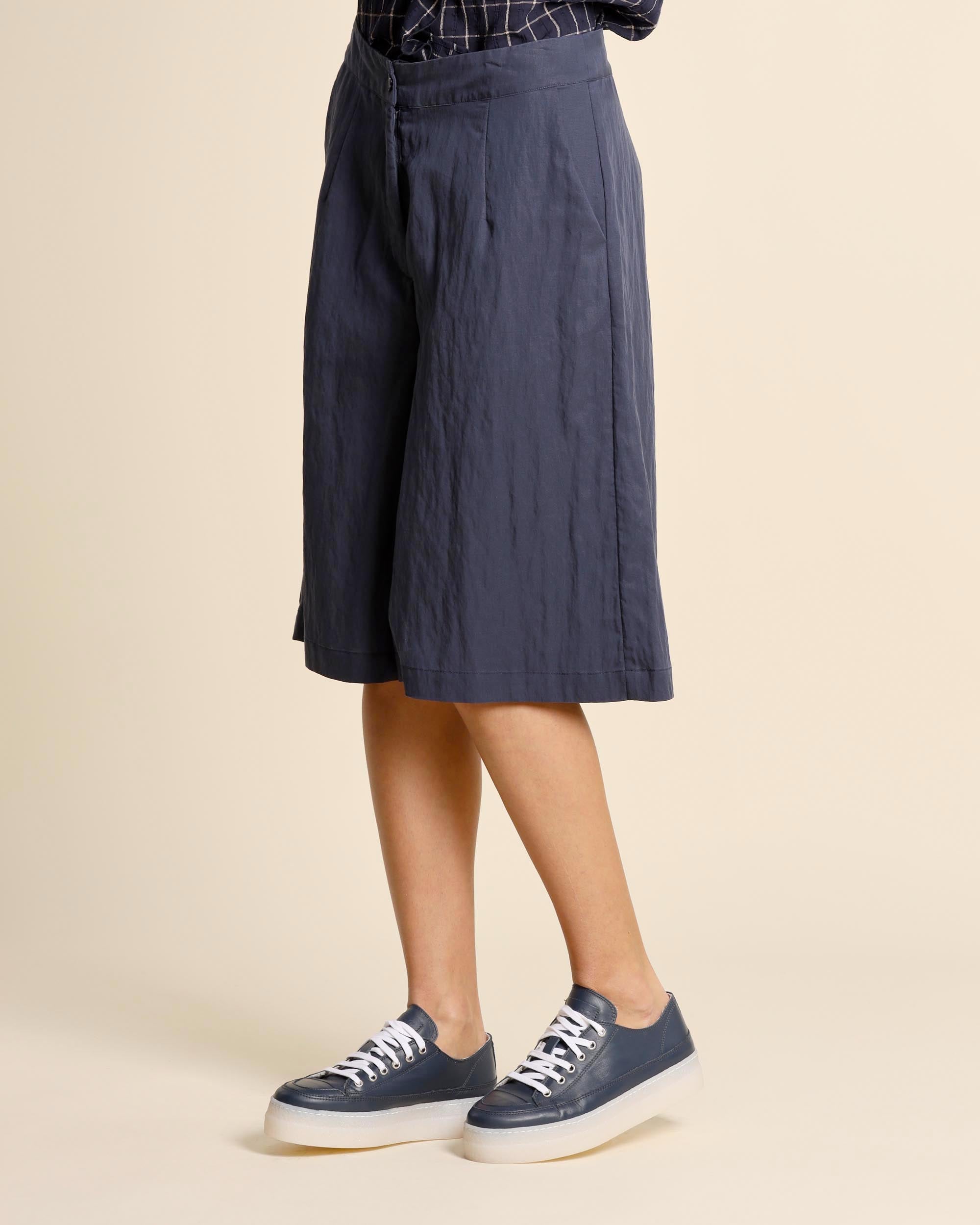 Bermuda blu in lyocell, chiusura con bottone e zip nascosta, tasche alla francese, linea dritta, made in Italy, la modella indossa una tg.42, la modella ha le seguenti misure: altezza 177, seno 86,vita 65, fianchi 93, collezione donna Alessia Santi Primavera Estate 2026