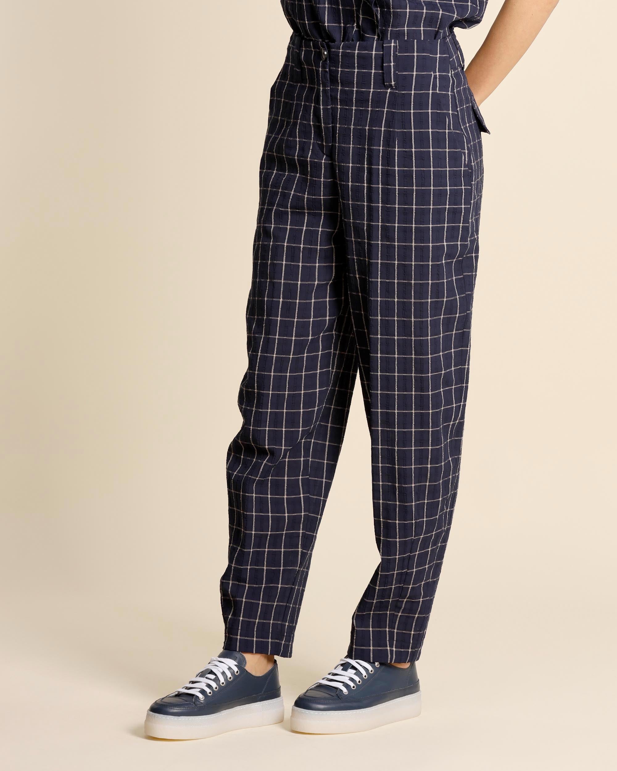 Pantaloni blu in crepe di cotone e viscosa, chiusura con bottone e zip nascosta, tasche alla francese sul davanti e tasche con patta e bottone sul dietro, linea dritta leggermente più stretta sul fondo, made in Italy, la modella indossa una tg.42, la modella ha le seguenti misure: altezza 177, seno 86,vita 65, fianchi 93, collezione donna Alessia Santi Primavera Estate 2026