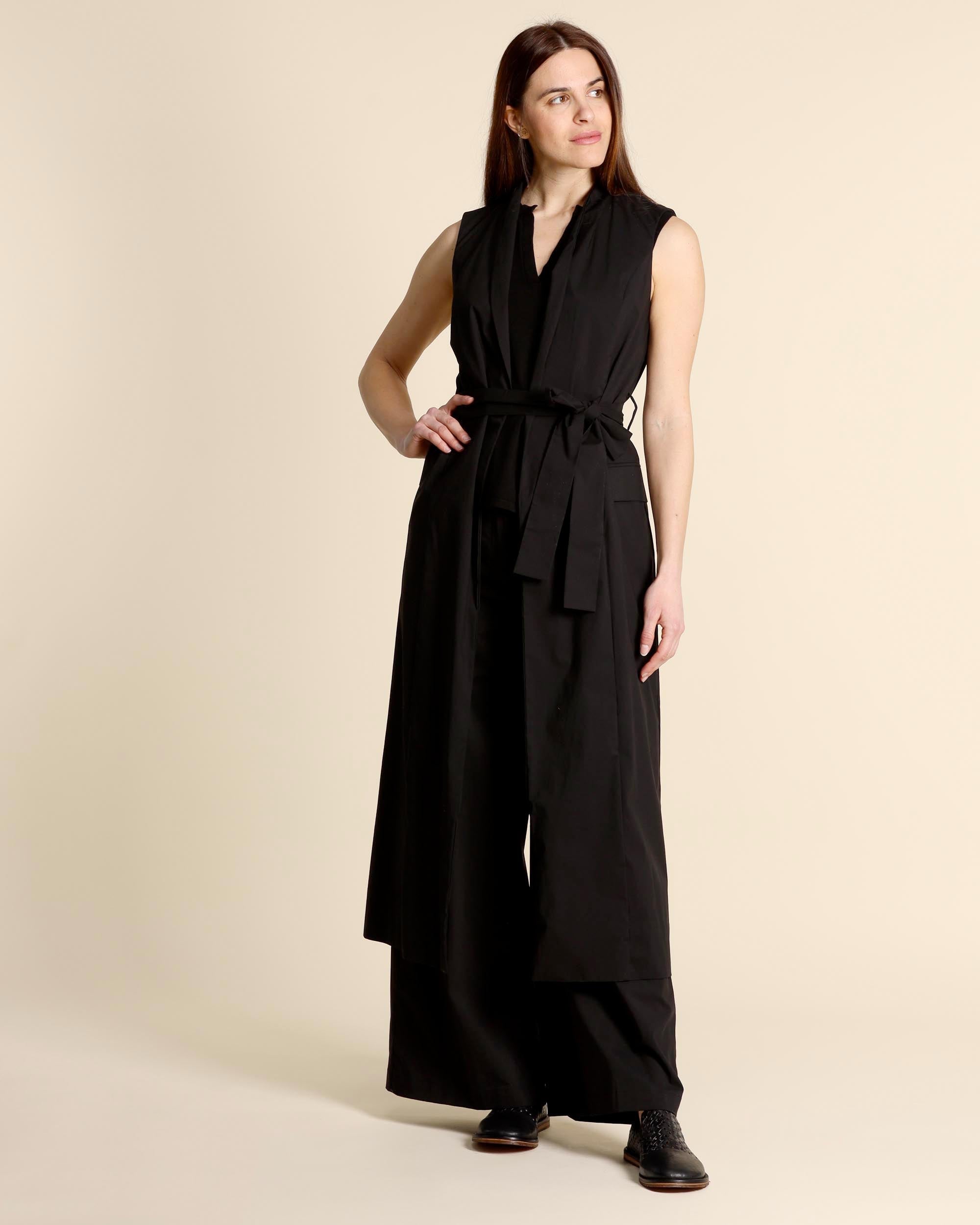 Gilet lungo nero in misto cotone stretch, senza maniche, scollo a V, tasche con patta, linea dritta, senza bottoni, cintura coordinata, sfoderato, spacco centrale sul dietro, made in Italy, la modella indossa una tg.42, la modella ha le seguenti misure: altezza 177, seno 86,vita 65, fianchi 93, collezione donna Alessia Santi Primavera Estate 2026
