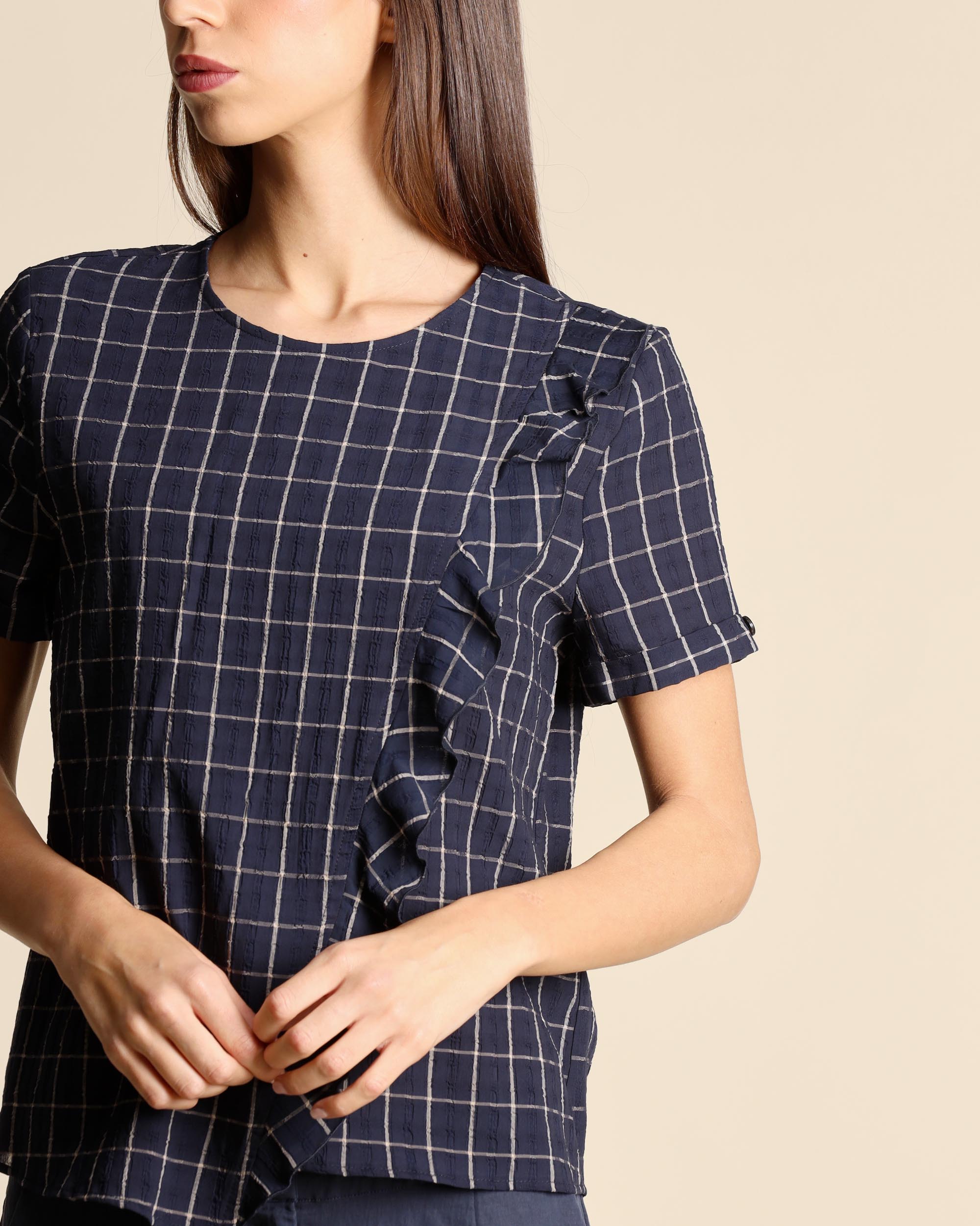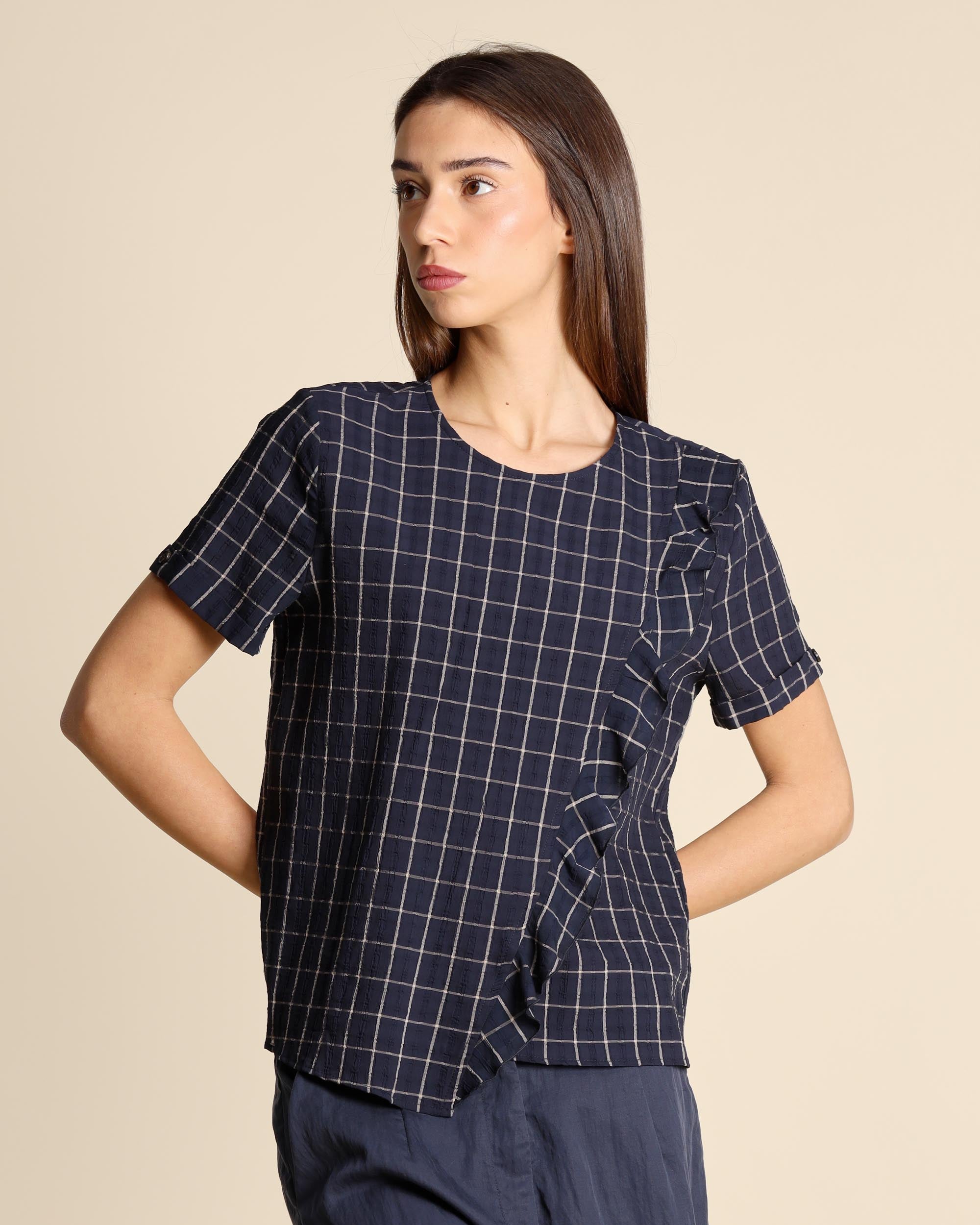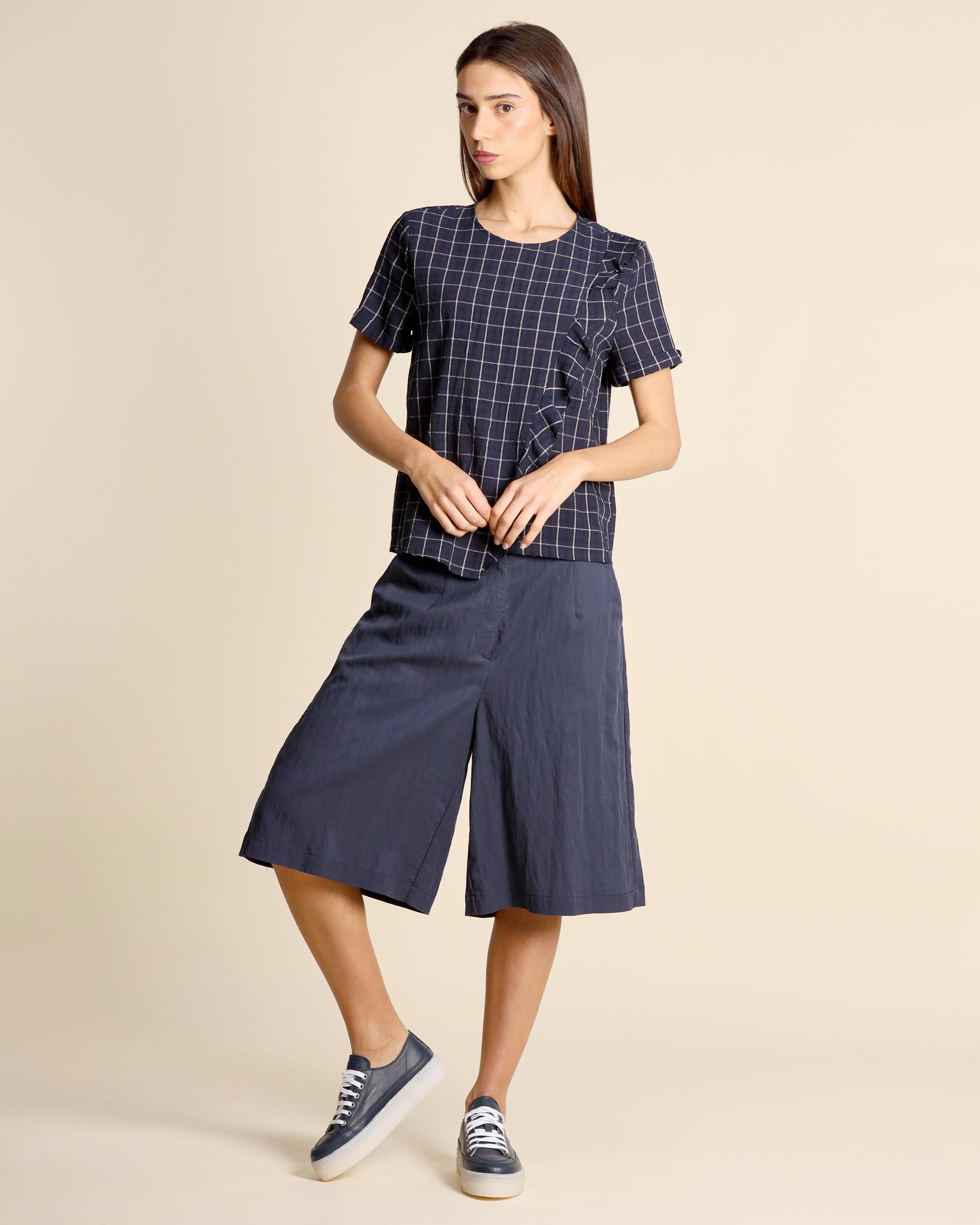 Blusa in crepe di cotone e viscosa blu, maniche corte con risvolto e bottone, scollo tondo con apertura a goccia su dietro, linea dritta, dettaglio di rouche sul davanti, made in Italy, la modella indossa una tg.42, la modella ha le seguenti misure: altezza 177, seno 86,vita 65, fianchi 93, collezione donna Alessia Santi Primavera Estate 2026