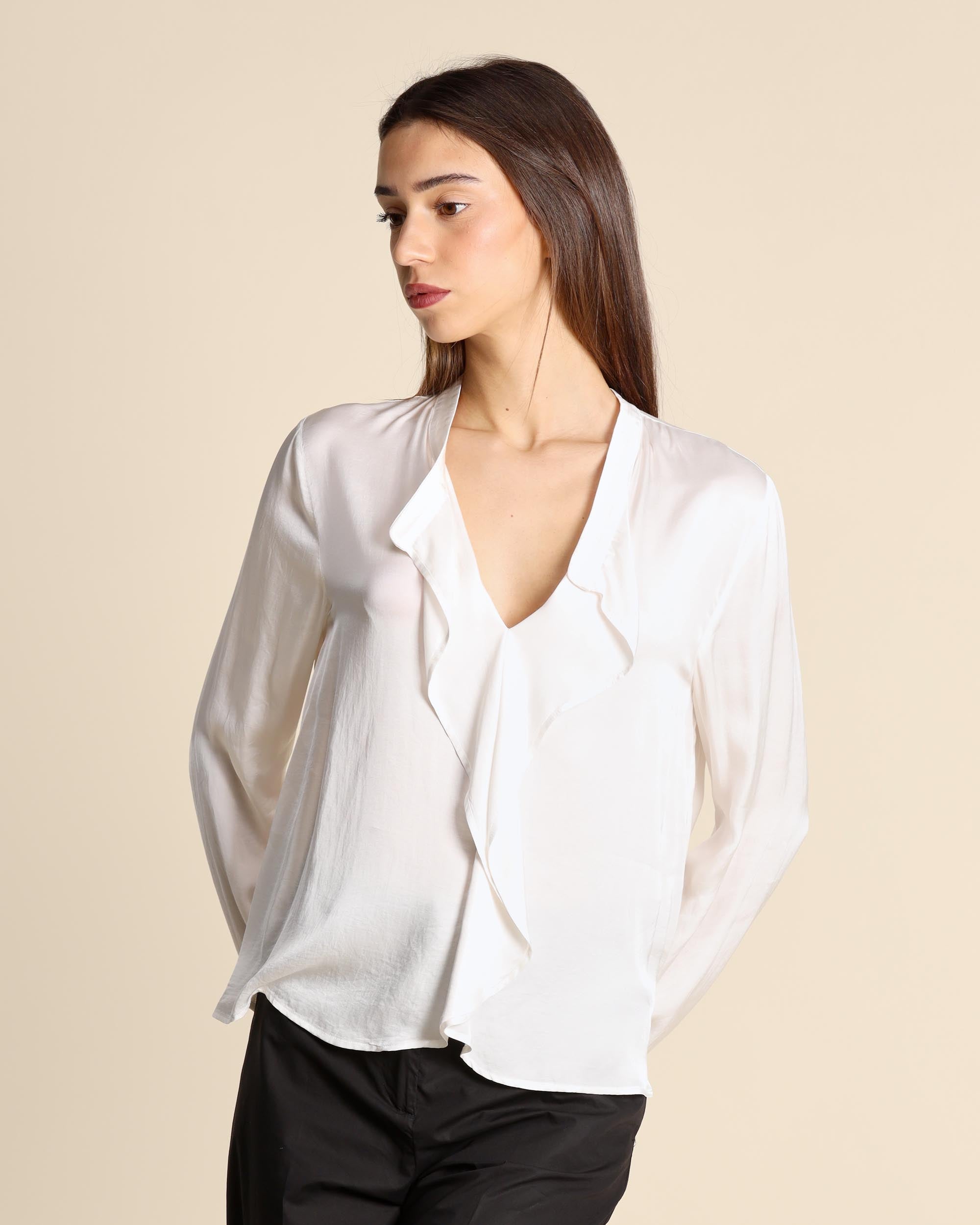 Blusa in raso di viscosa color panna, maniche lunghe, scollo a V, linea morbida, dettaglio di volant sul davanti, made in Italy, la modella indossa una tg.42, la modella ha le seguenti misure: altezza 177, seno 86,vita 65, fianchi 93, collezione donna Alessia Santi Primavera Estate 2026