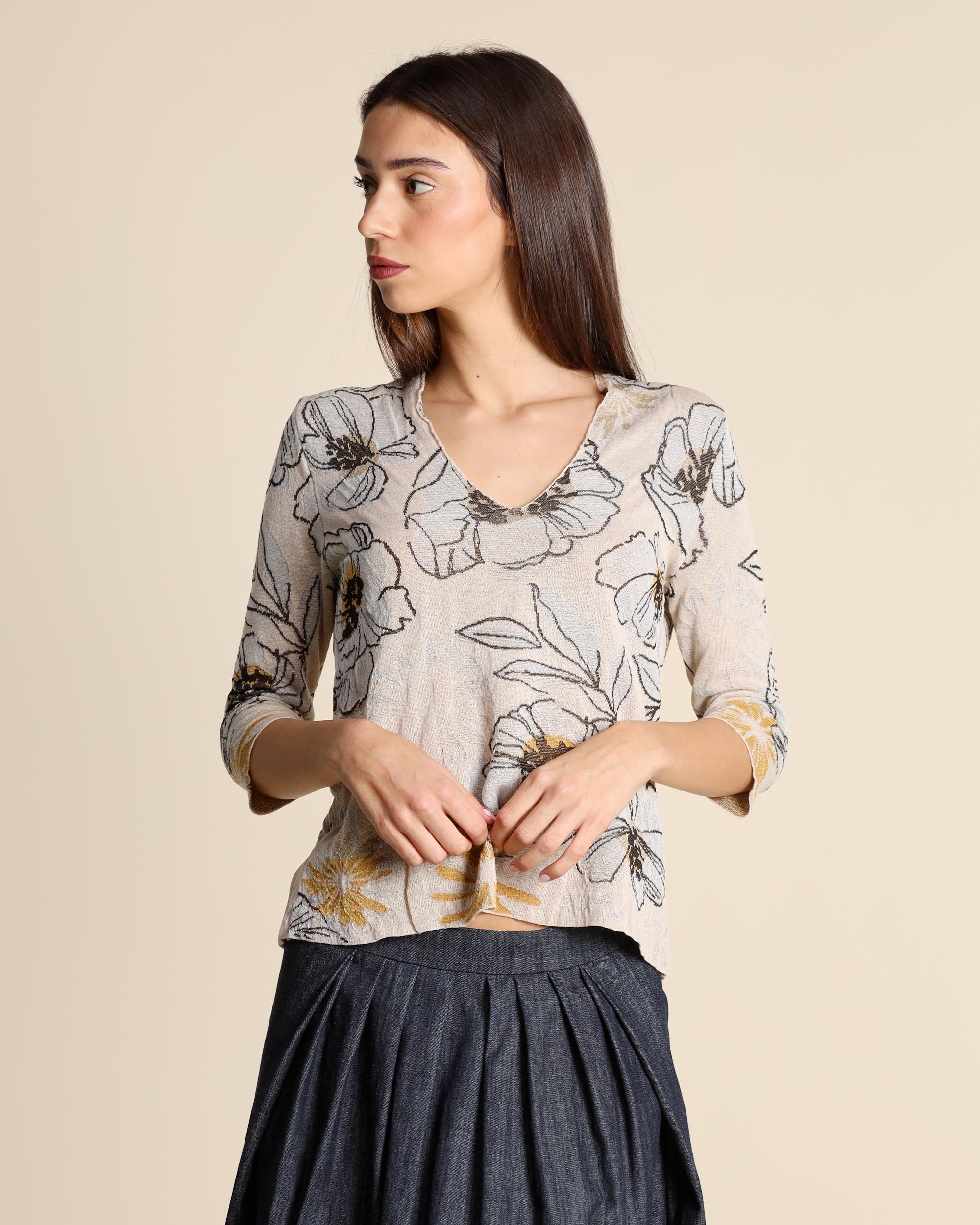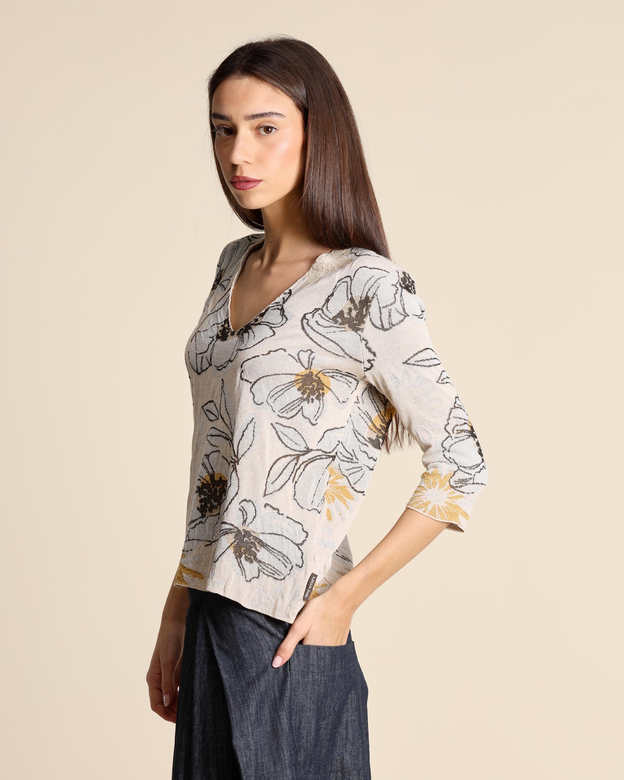 Maglia jacquard beige in misto viscosa con lurex, scollo a V, maniche tre quarti, linea dritta, made in Italy, la modella indossa una tg.S, la modella ha le seguenti misure: altezza 177, seno 86,vita 65, fianchi 93, collezione donna Alessia Santi Primavera Estate 2026