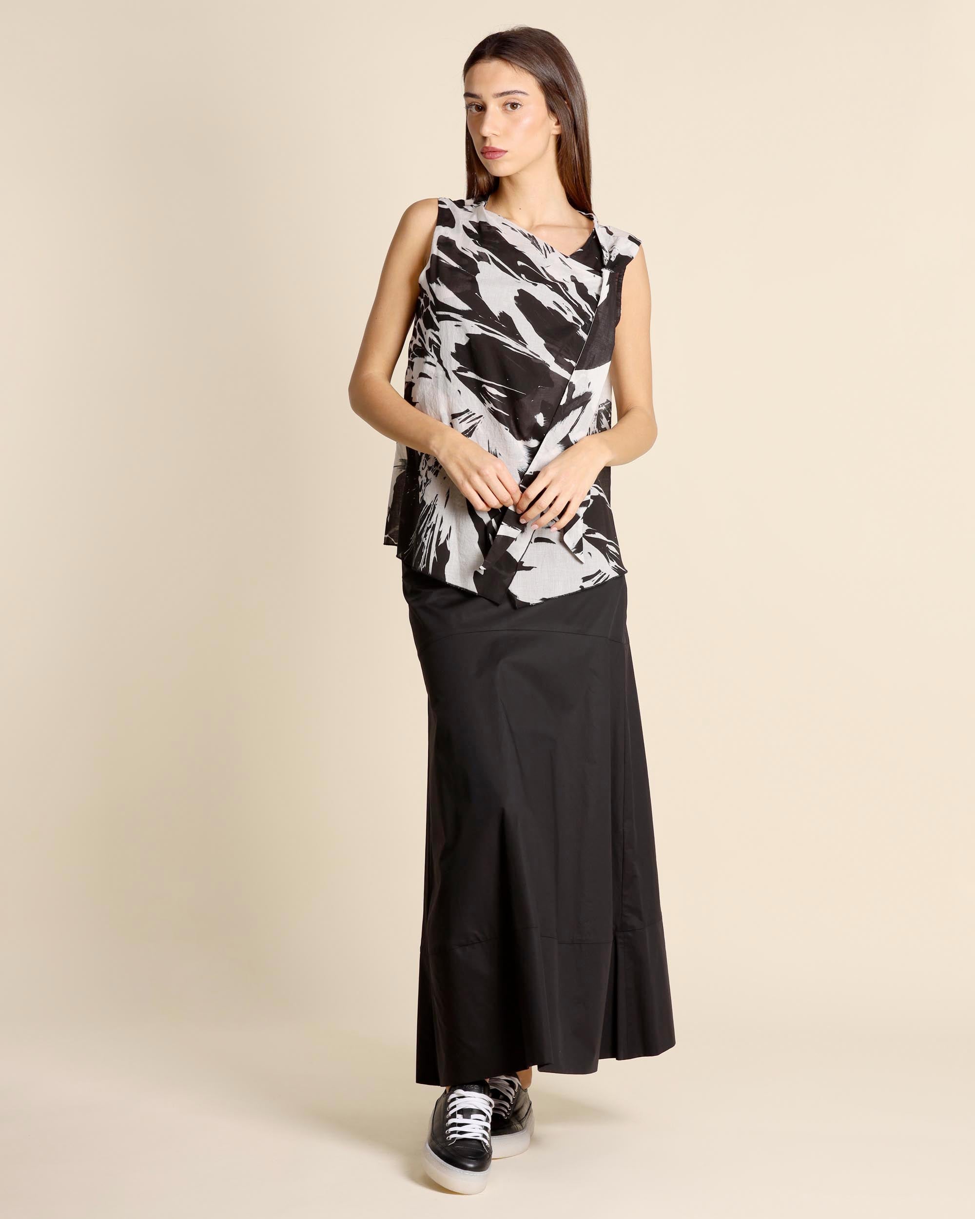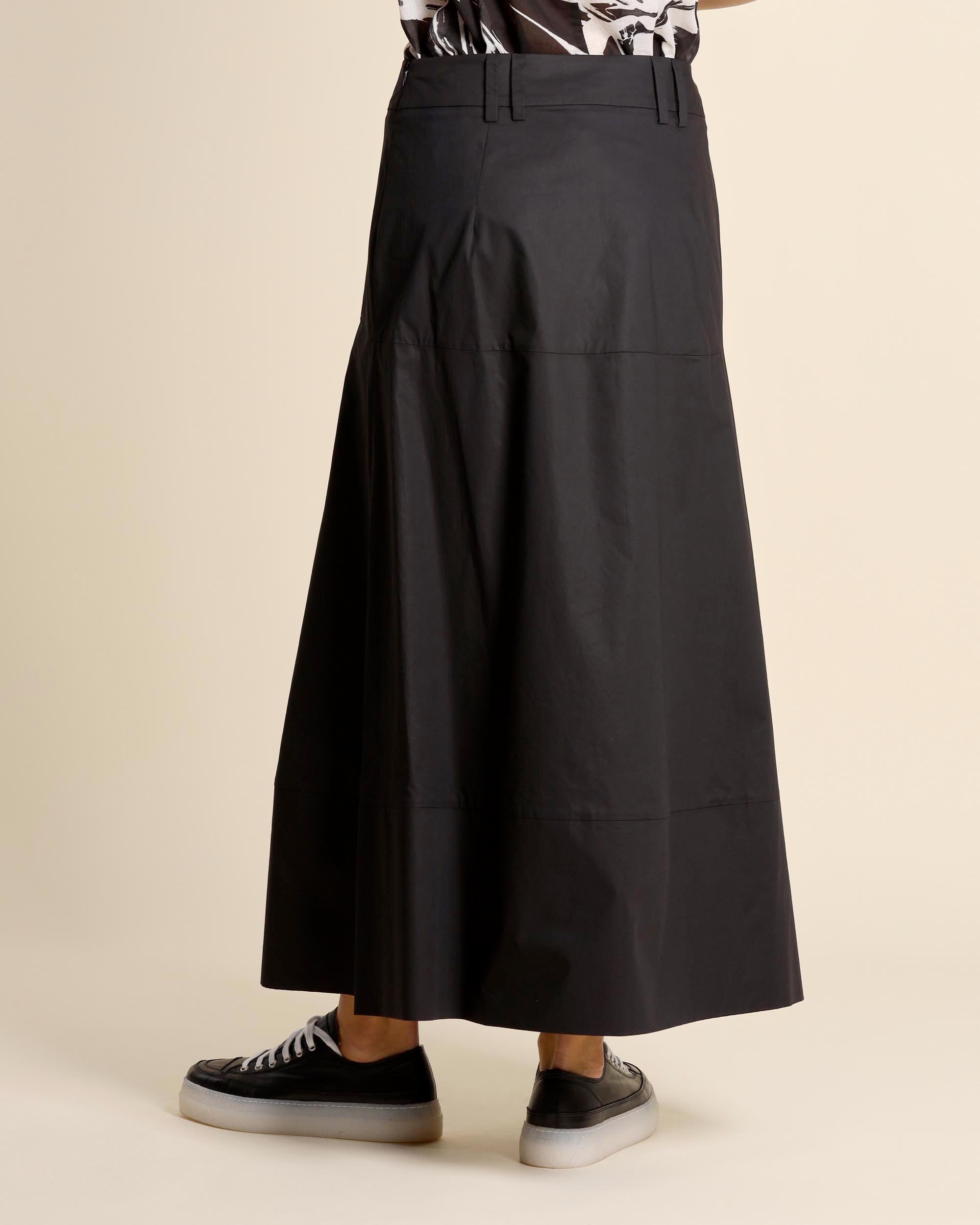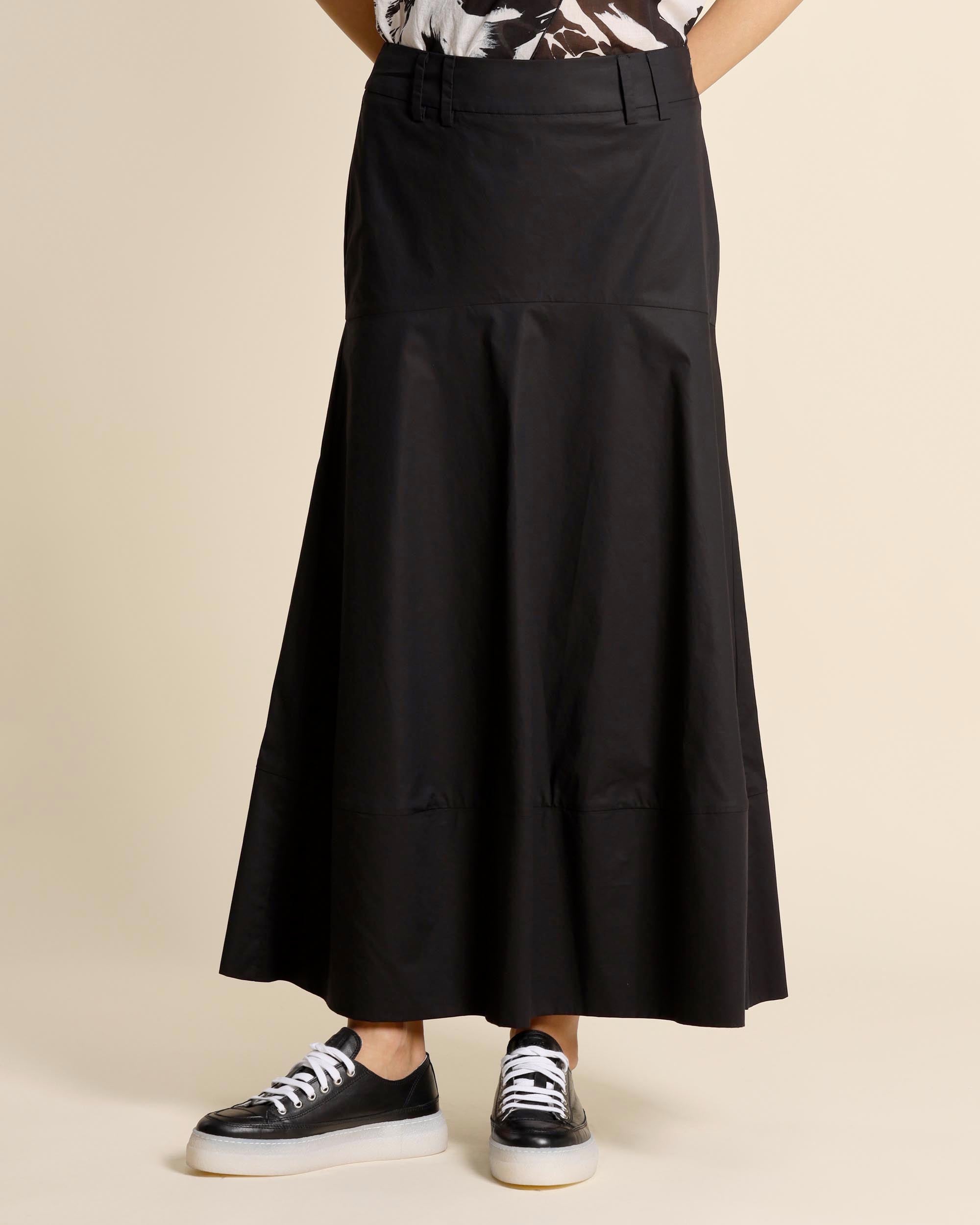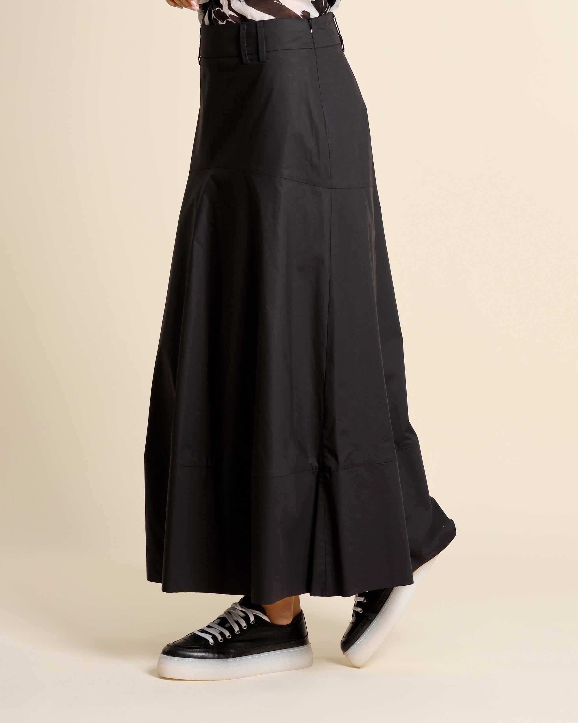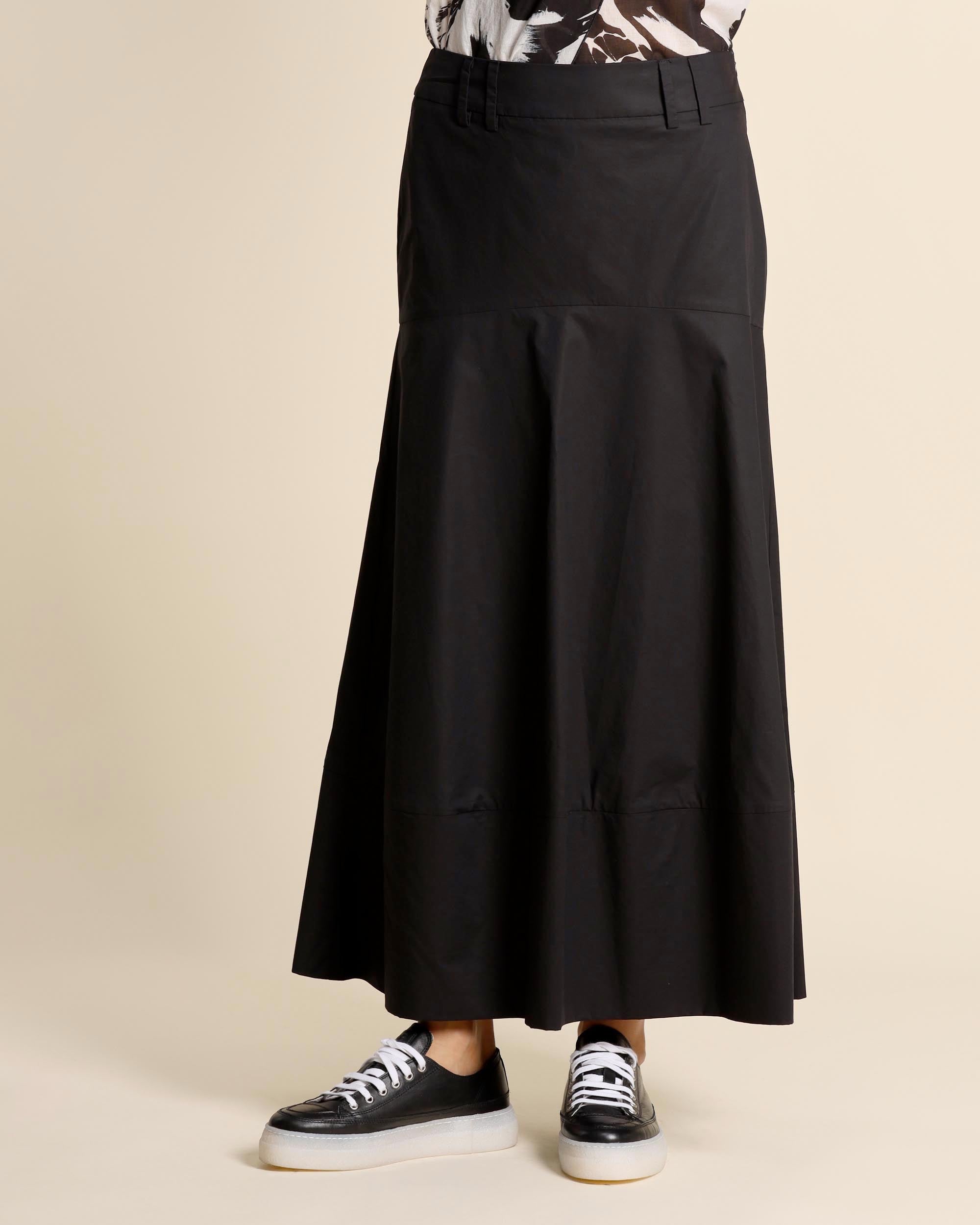 Gonna nera lunga in popeline di cotone, chiusura laterale con zip invisibile sul fianco, linea svasata, sfoderata, made in Italy, la modella indossa una tg.42, la modella ha le seguenti misure: altezza 177, seno 86,vita 65, fianchi 93, collezione donna Alessia Santi Primavera Estate 2026