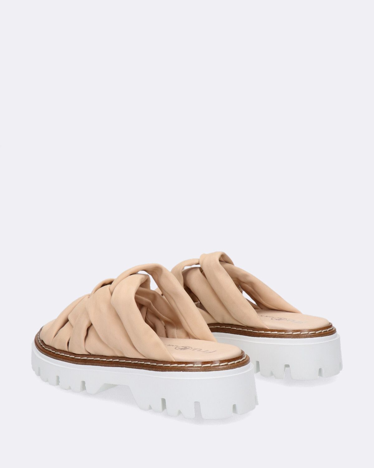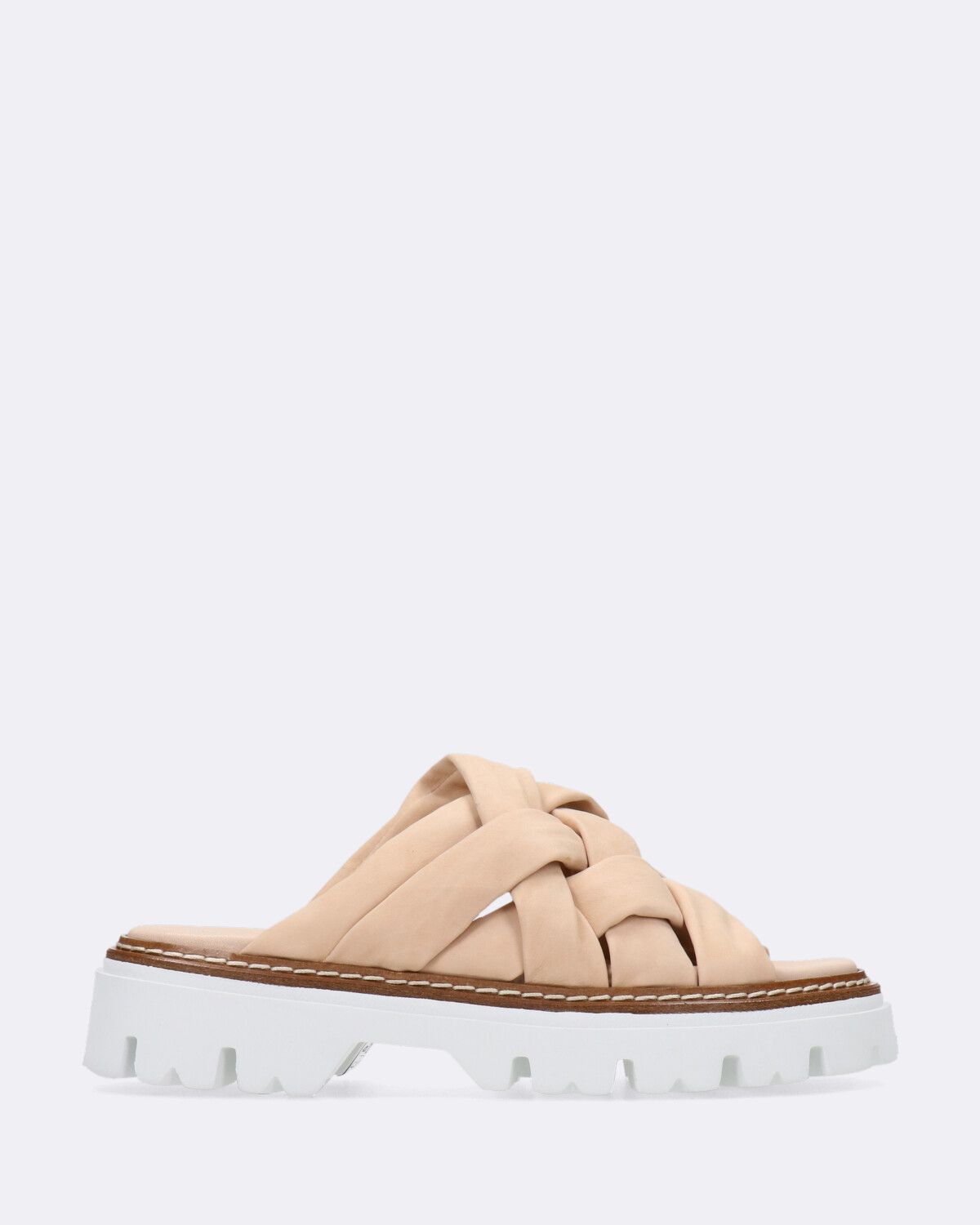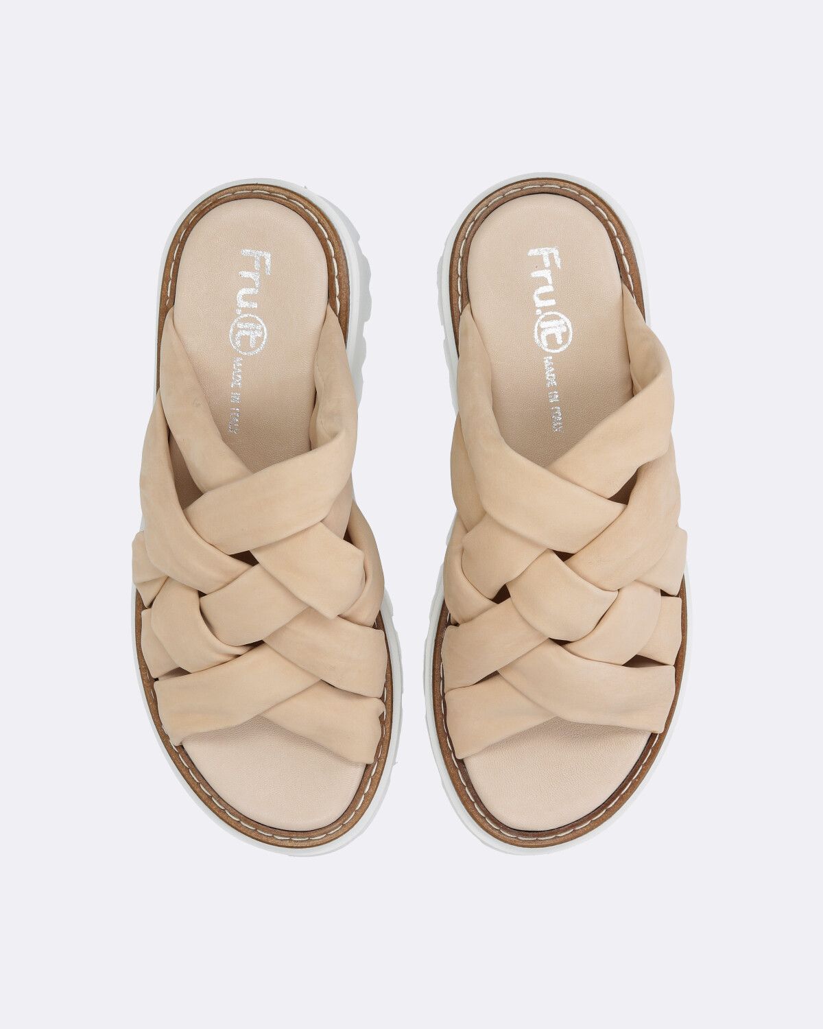 Sandali in morbido vitello color sughero con conciatura vegetale, suola in gomma extra light 20mm, guardolo cucito, tacco 35mm, fodera in pelle, sottopiede imbottito per un ottimo comfort in pelle, tomaia a fasce incrociate, punta tonda, made in Italy, collezione donna Fruit Primavera Estate 2022