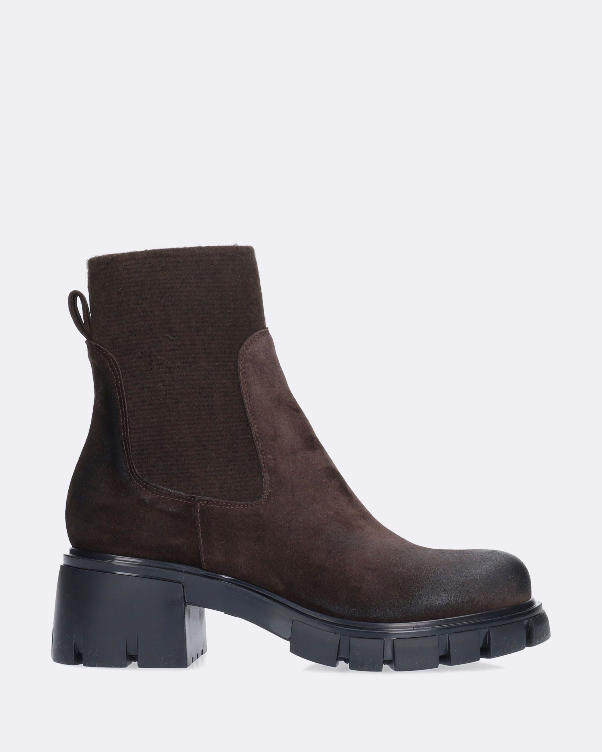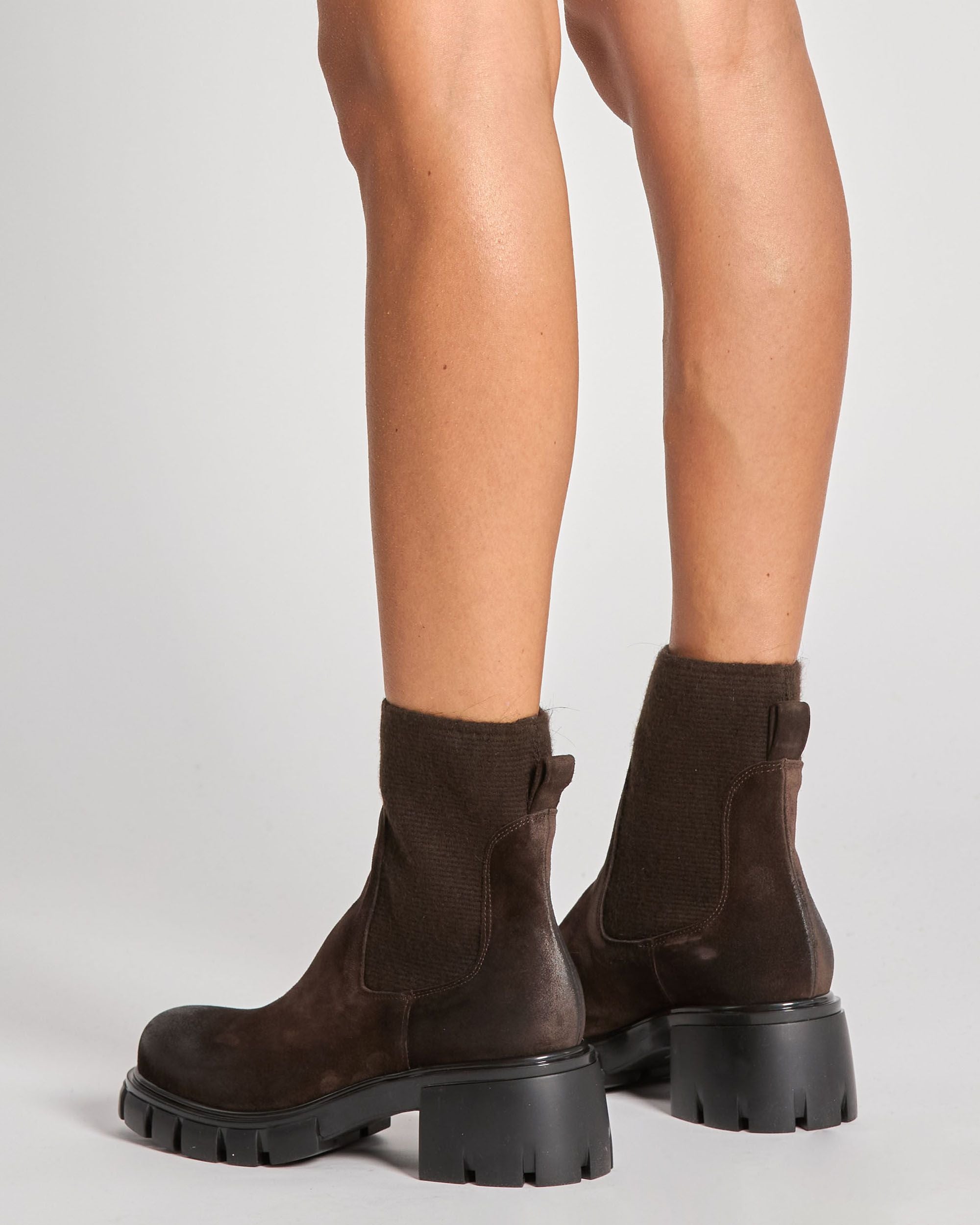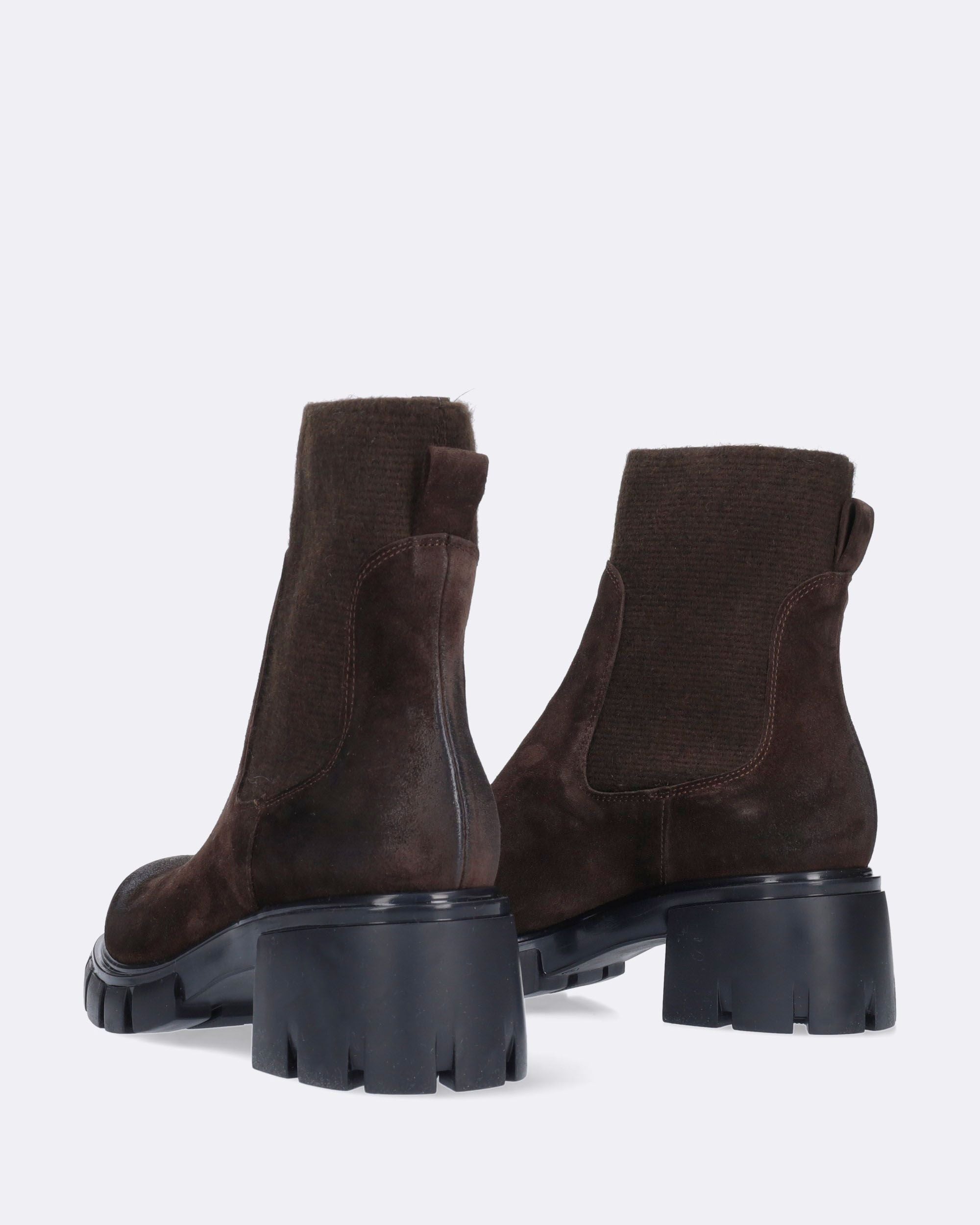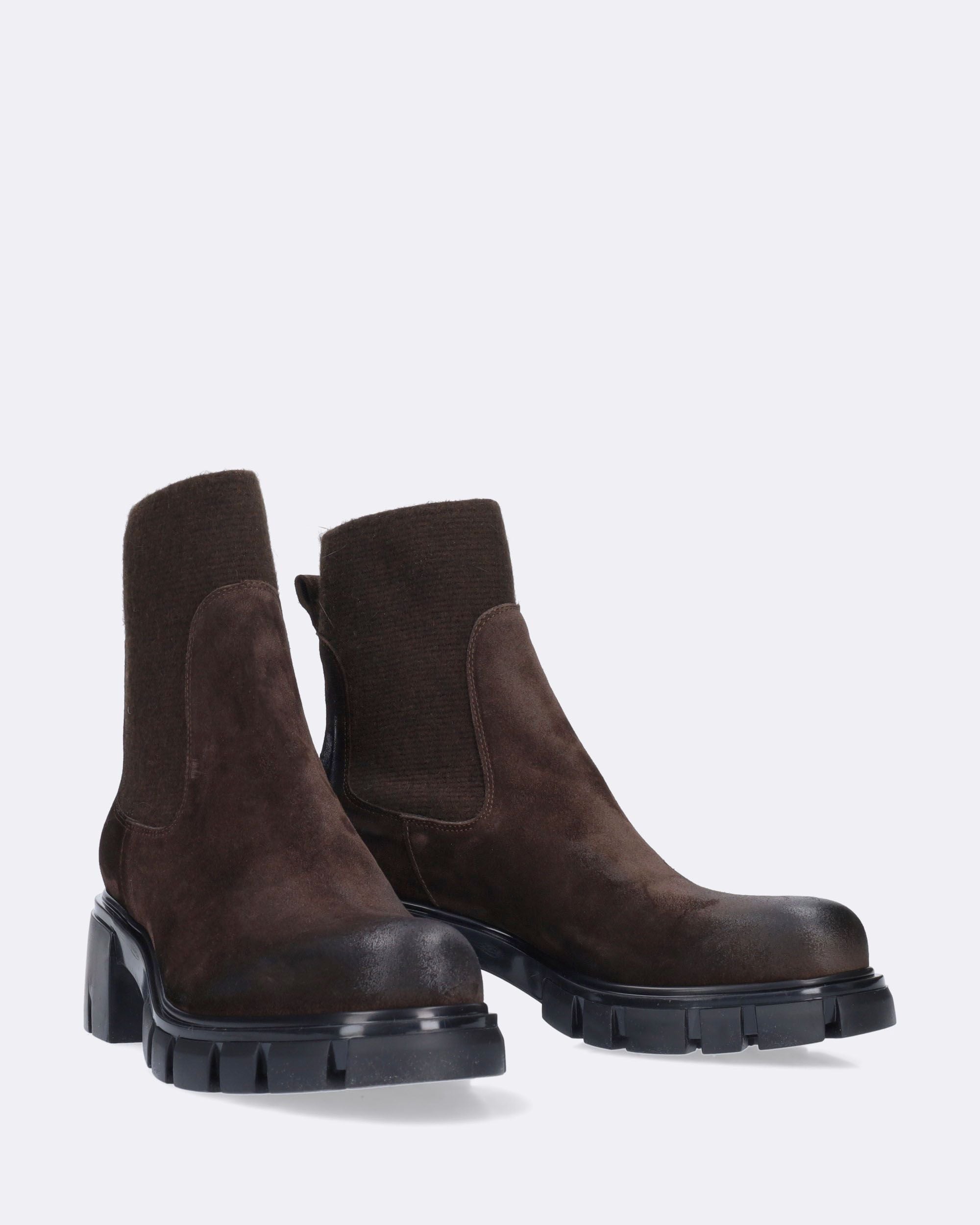 Tronchetti in velour testa moro tamponati effetto vinted, concia vegetale, elastico in tinta, tirante posteriore, tacco 50mm, suola in gomma, fodera in pelle, sottopiede in pelle, made in Italy, collezione donna Fruit Autunno Inverno 2024/25