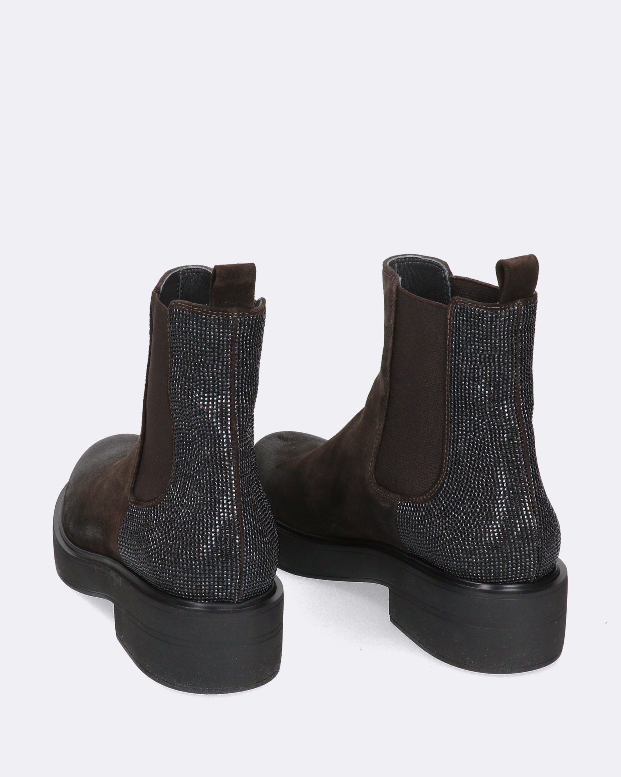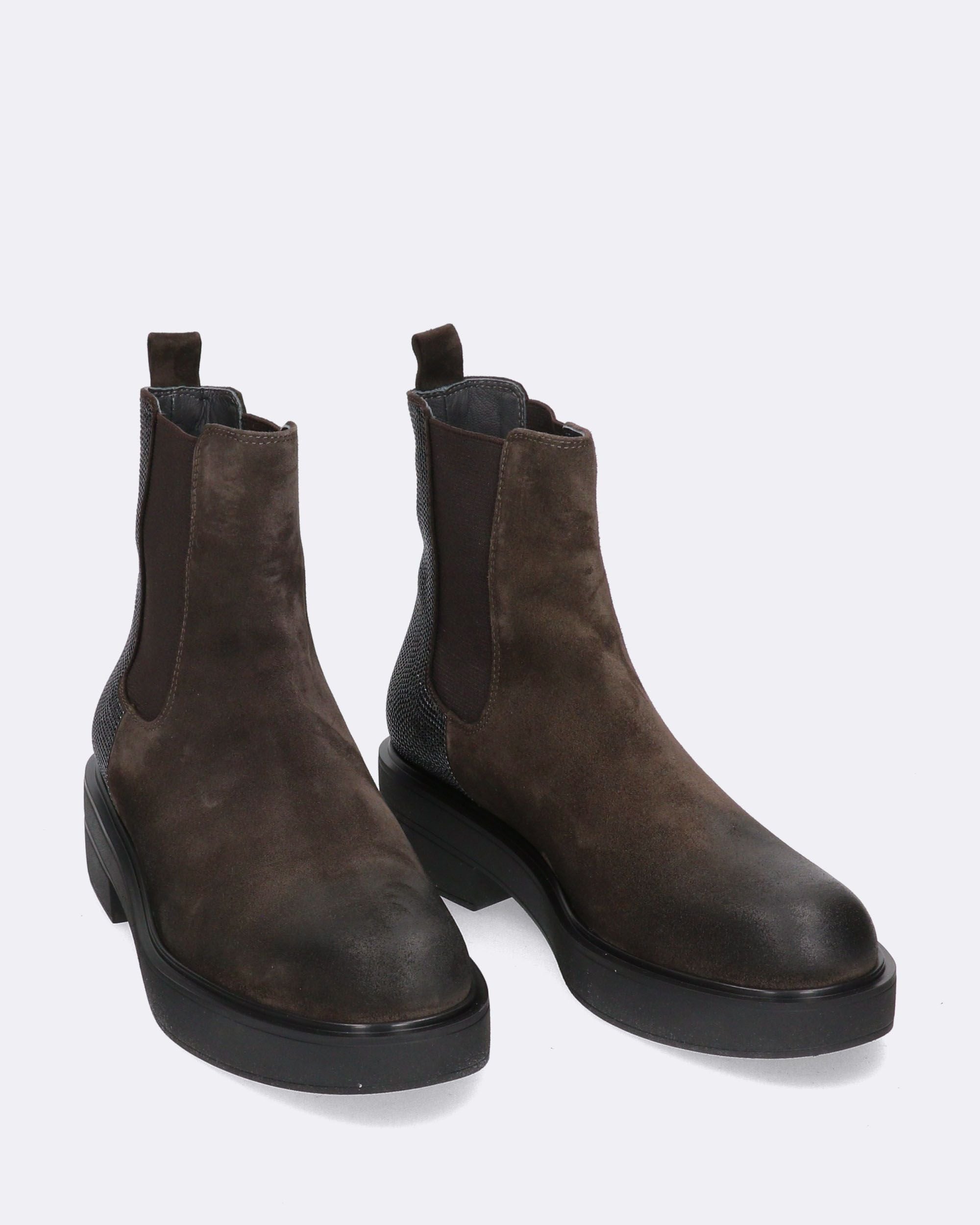 Chelsea boots in velour testa moro, concia vegetale, dettaglio di microborchie in tinta sulla parte posteriore, elastici laterali, tirante posteriore, tacco 40mm, suola in gomma ultralight, fodera in pelle, sottopiede in pelle, made in Italy, collezione donna Fruit Autunno Inverno 2024/25