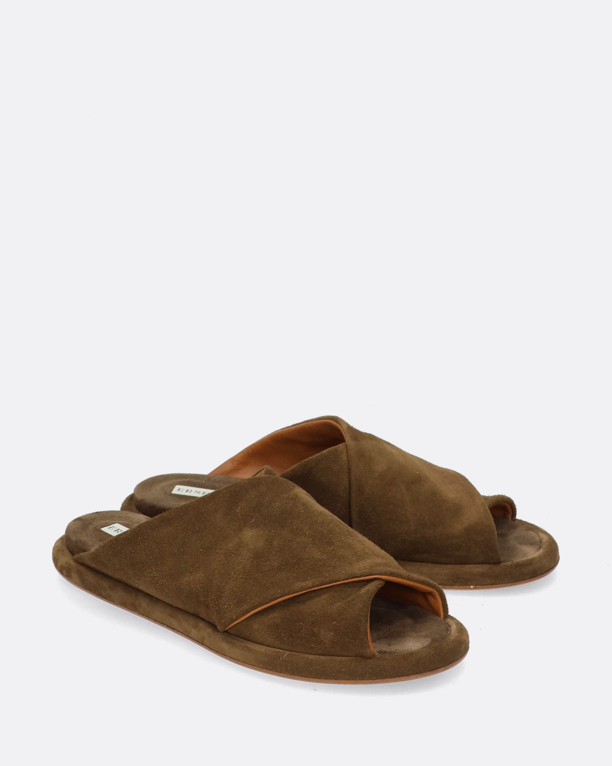 Sandali bassi in suede color cognac, suola in cuoio con iniezione in gomma antiscivolo con logo, fasce incrociate, sottopiede in suede, fodera in pelle, punta tonda, made in Italy, Collezione Donna Ernesto Dolani Primavera Estate 2025