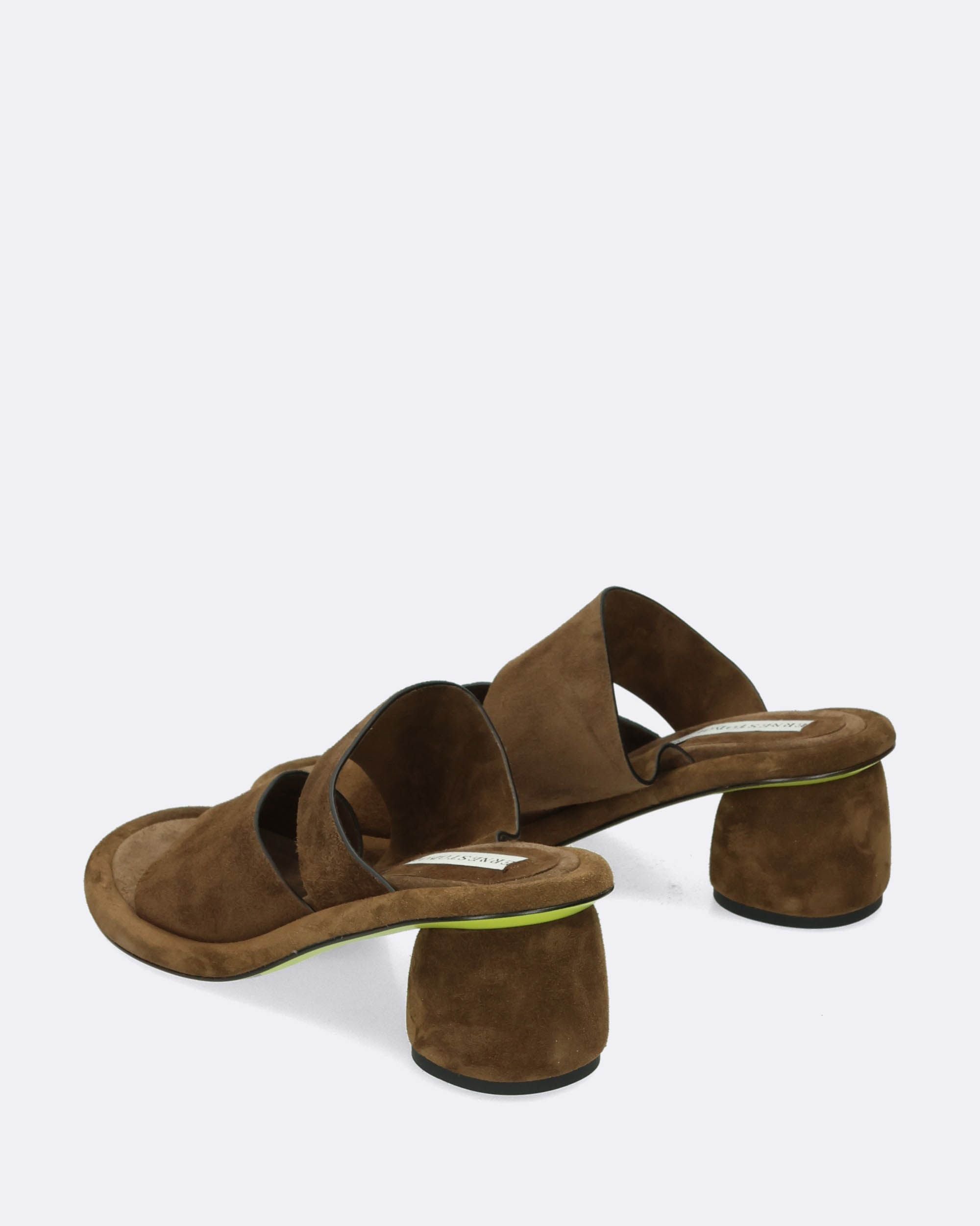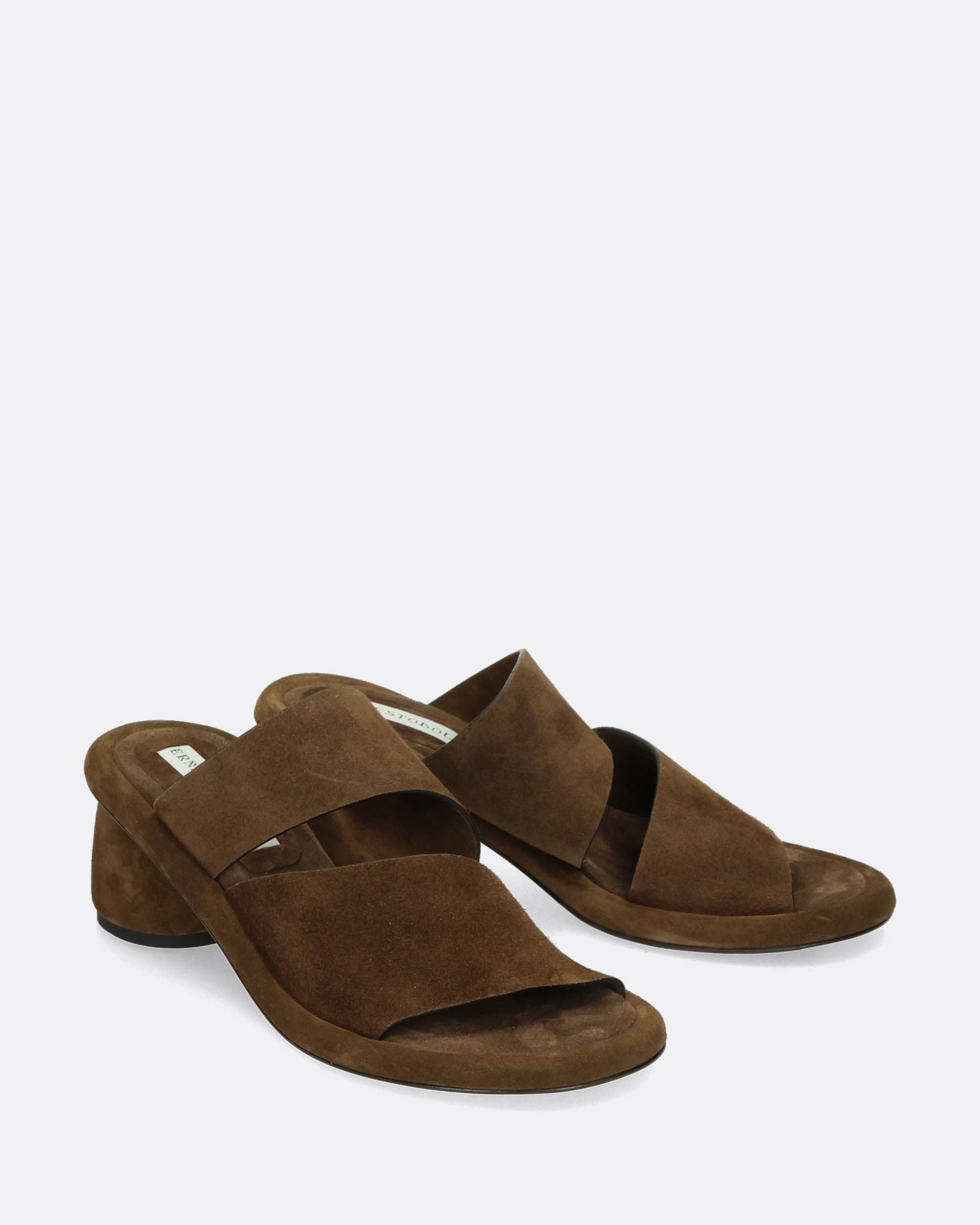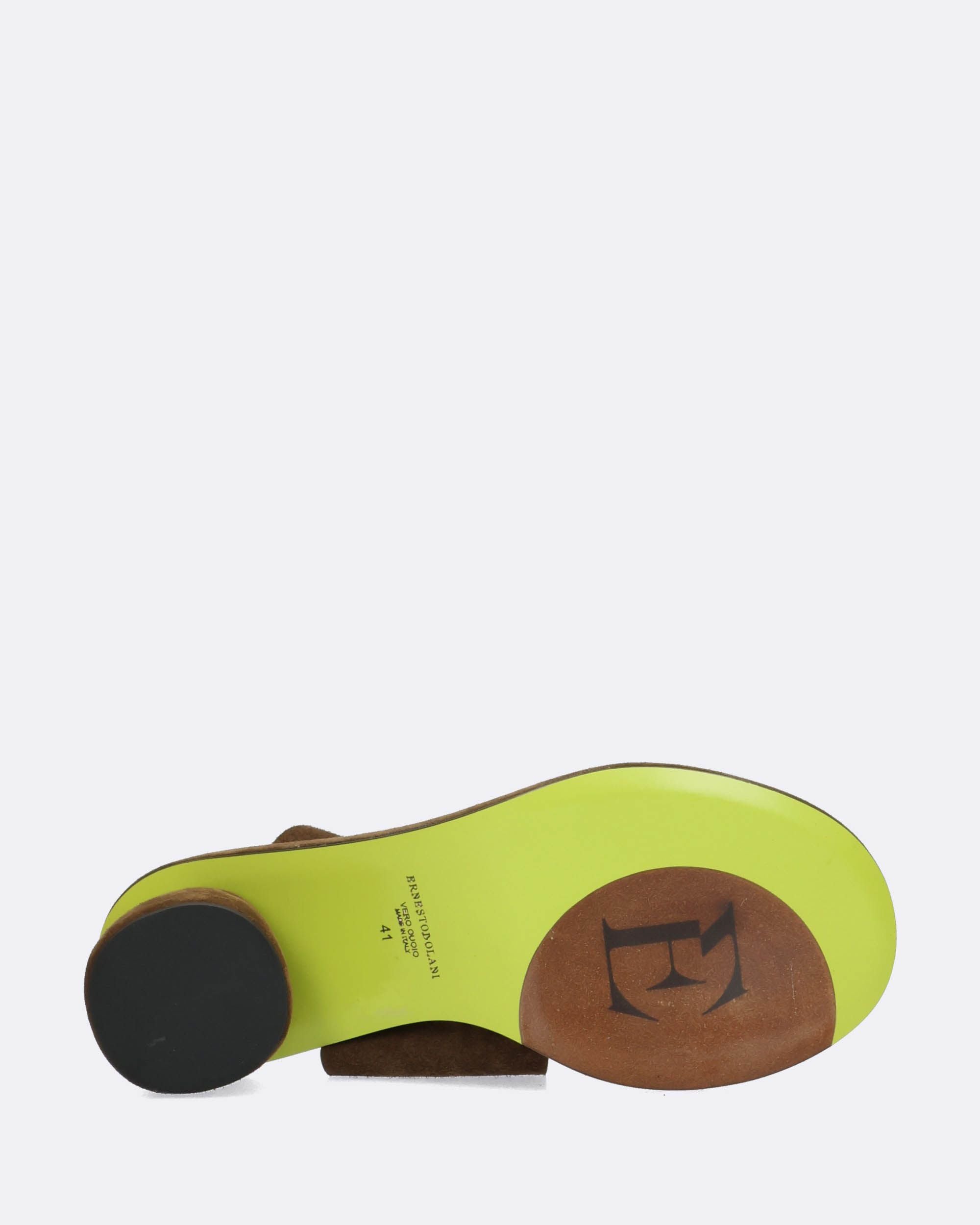Sandali con tacco in suede color cognac, suola in cuoio con iniezione in gomma antiscivolo con logo, tacco 60mm ricoperto, sottopiede in suede, fodera in pelle, punta tonda, made in Italy, Collezione Donna Ernesto Dolani Primavera Estate 2025