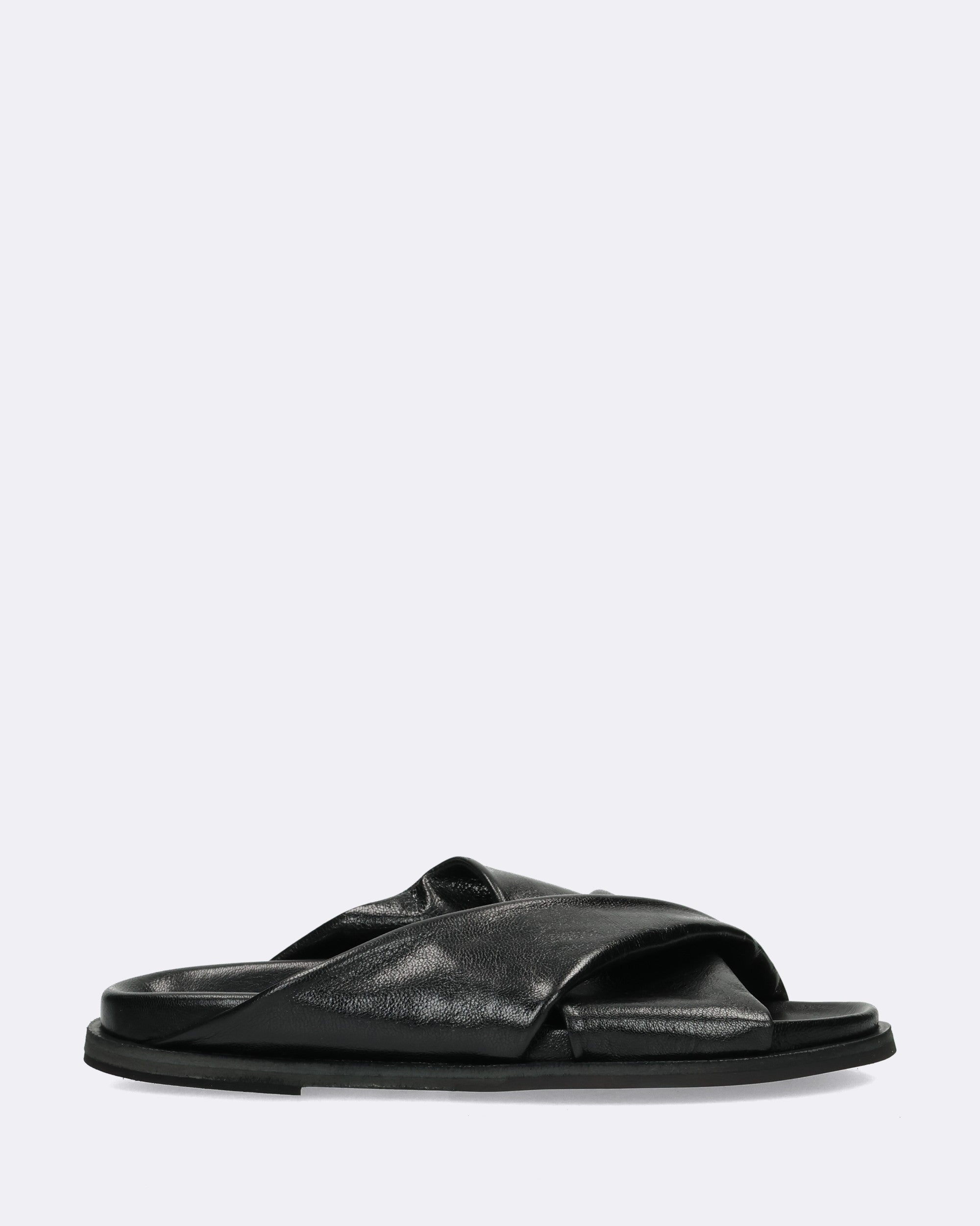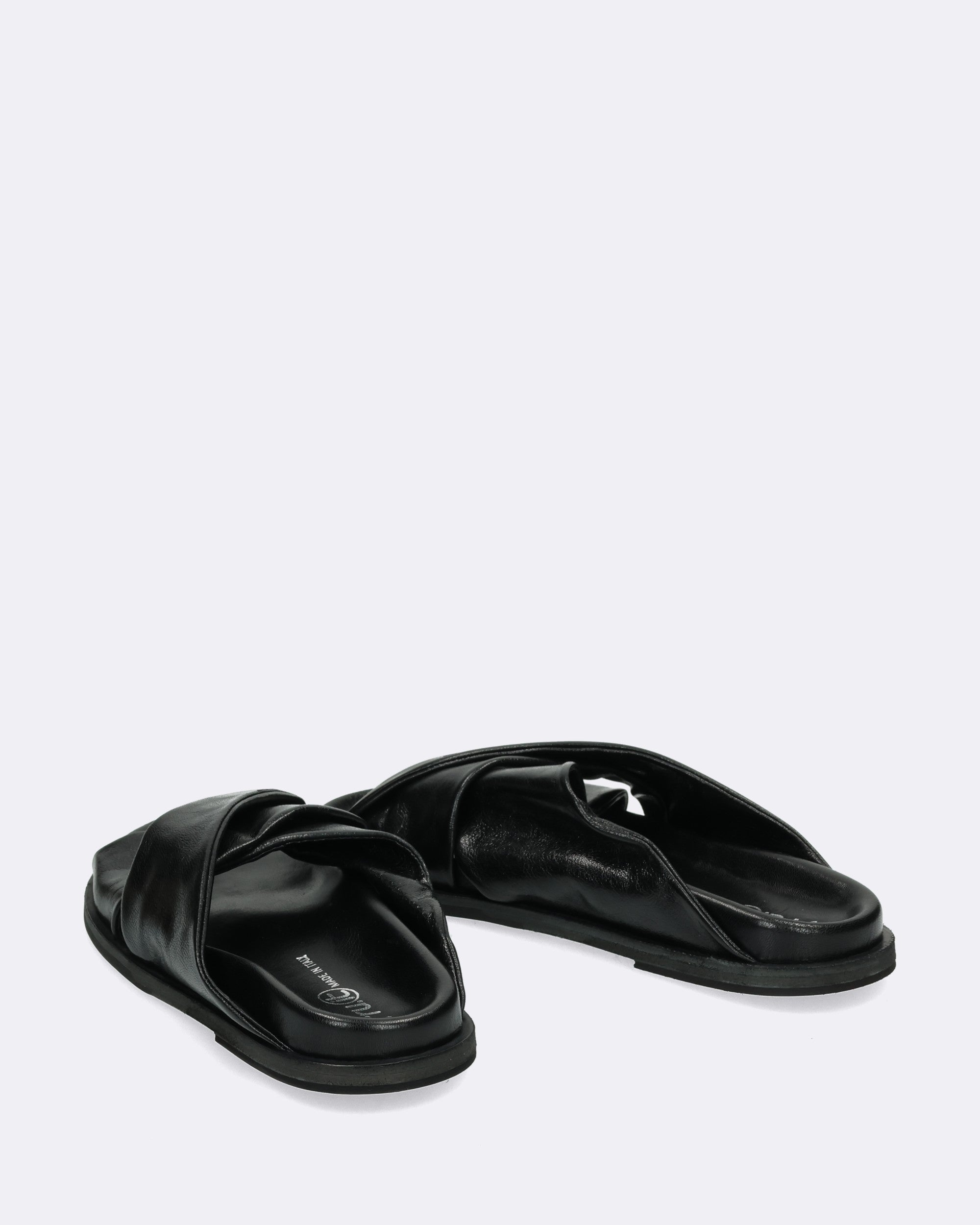 Sandali neri in pelle, fasce incrociate, tacco 15mm, sottopiede in pelle, fusbett, suola in cuoio e gomma, punta tonda, made in Italy, collezione donna Fruit Primavera Estate 2025