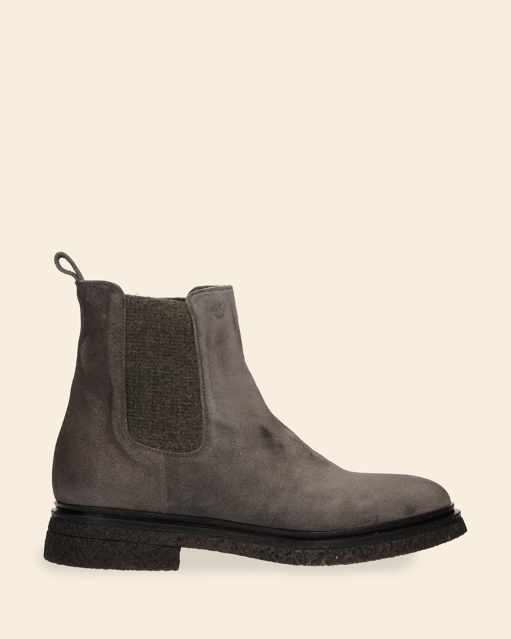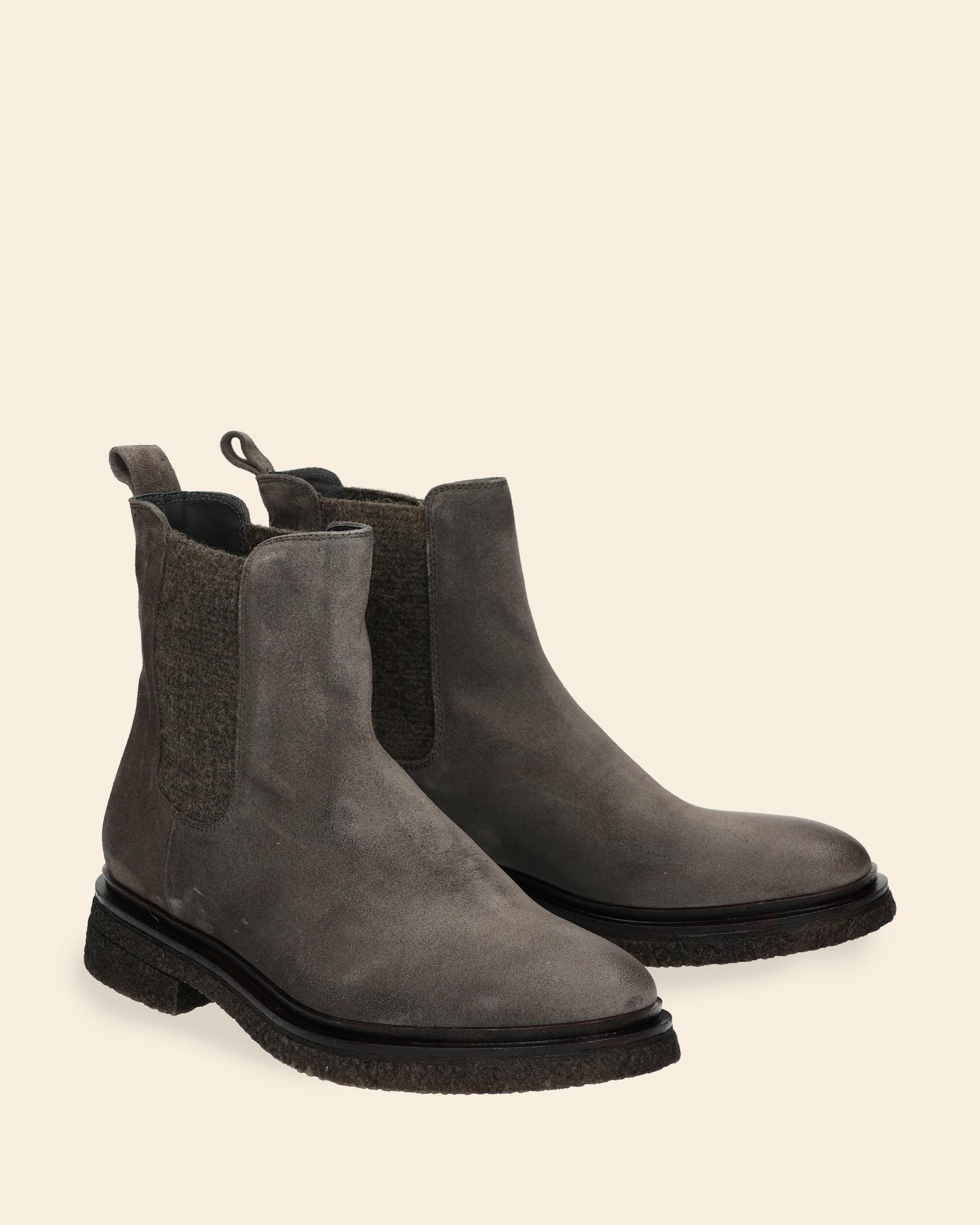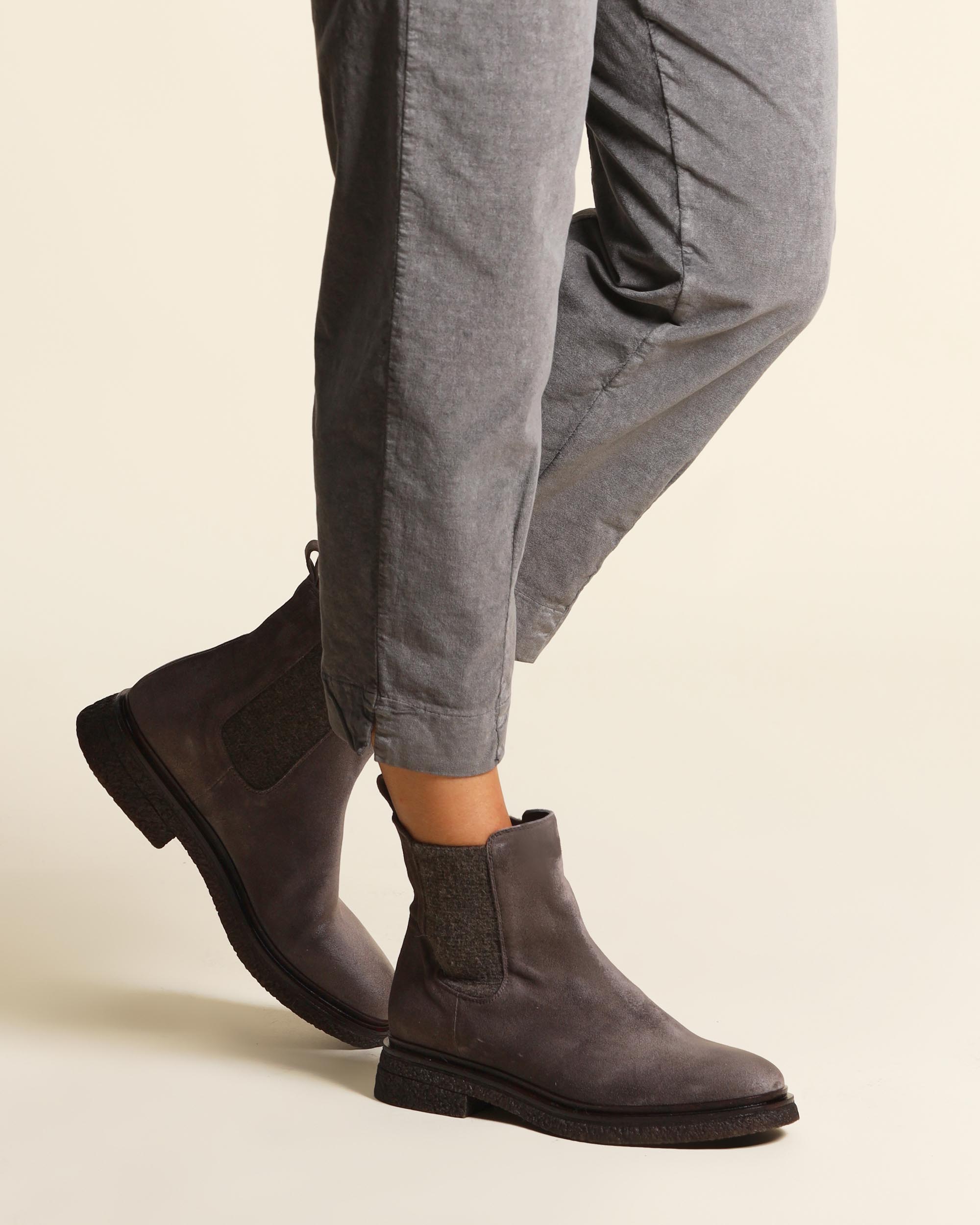 Tronchetti grigi in velour effetto invecchiato, inserti elastici laterali, suola in gomma, tacco 35, fodera in pelle, sottopiede in pelle, tirante posteriore in pelle, made in Italy, collezione donna Fruit Autunno Inverno 2025/26