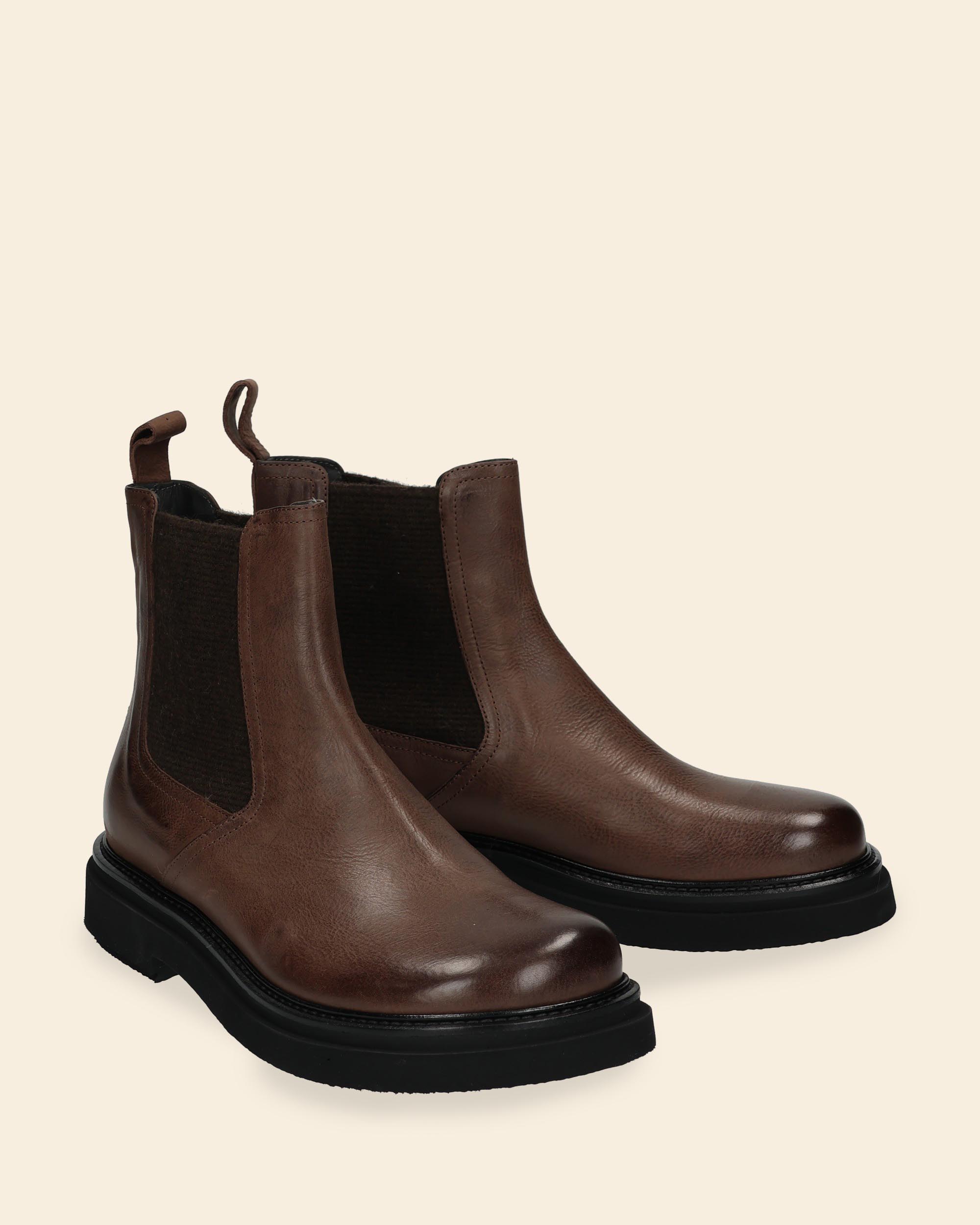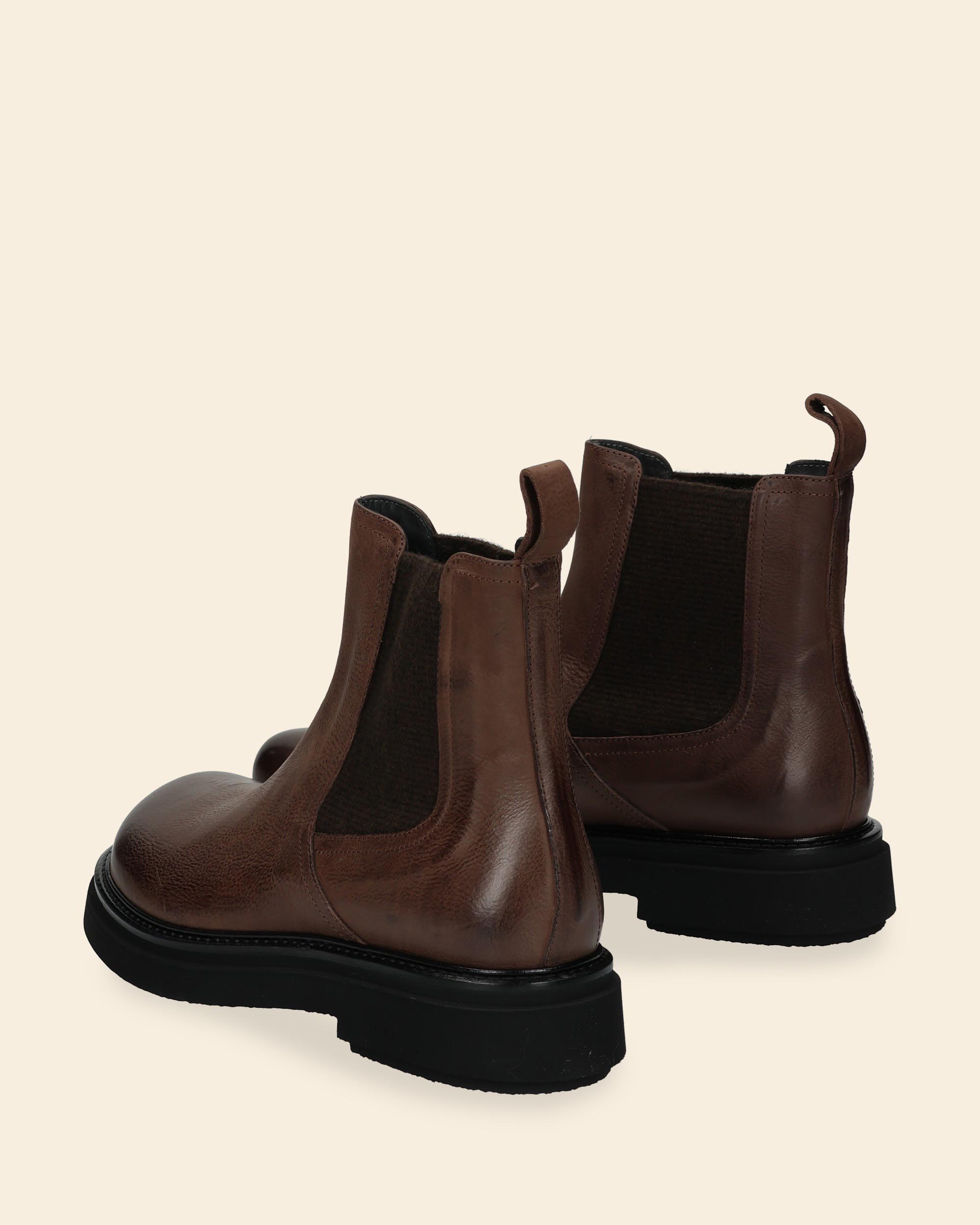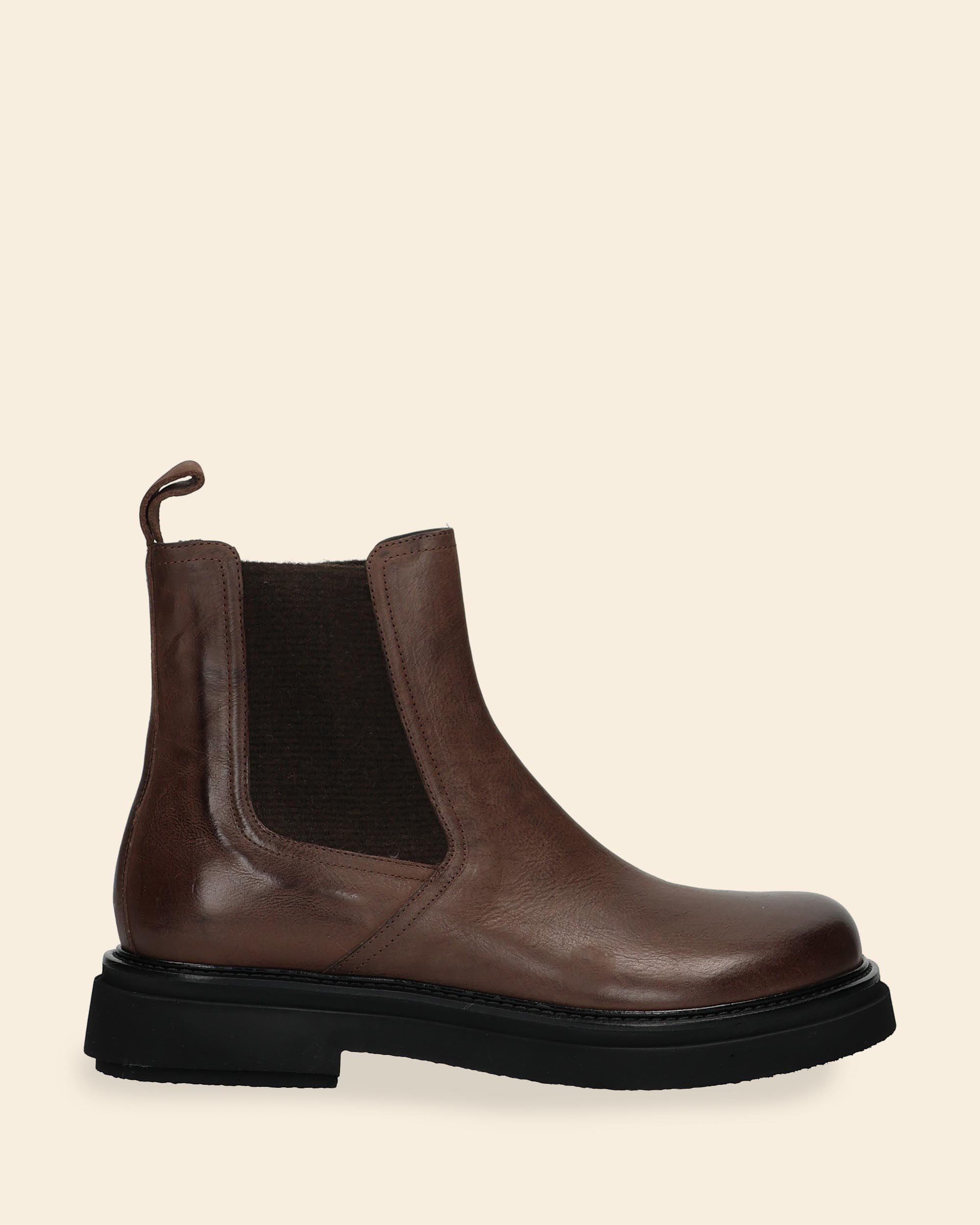Tronchetti testa moro in pelle effetto invecchiato, inserti elastici laterali, suola in gomma, tacco 35, fodera in pelle, sottopiede in pelle, tirante posteriore in pelle, made in Italy, collezione donna Fruit Autunno Inverno 2025/26