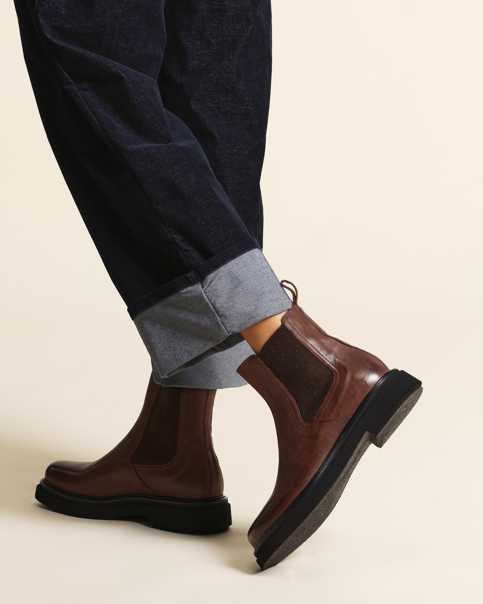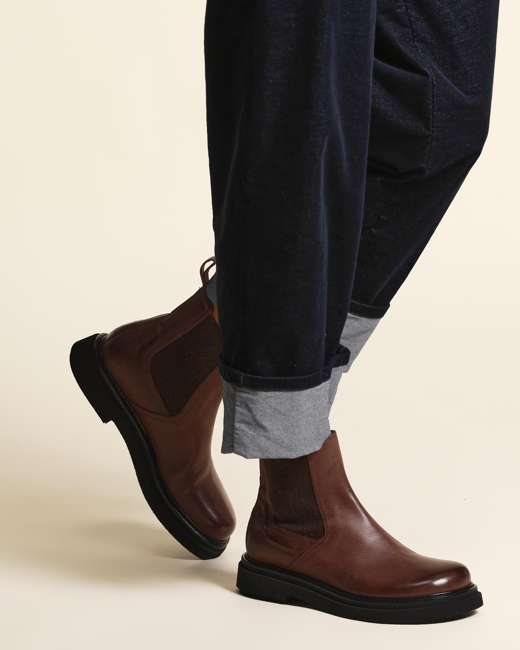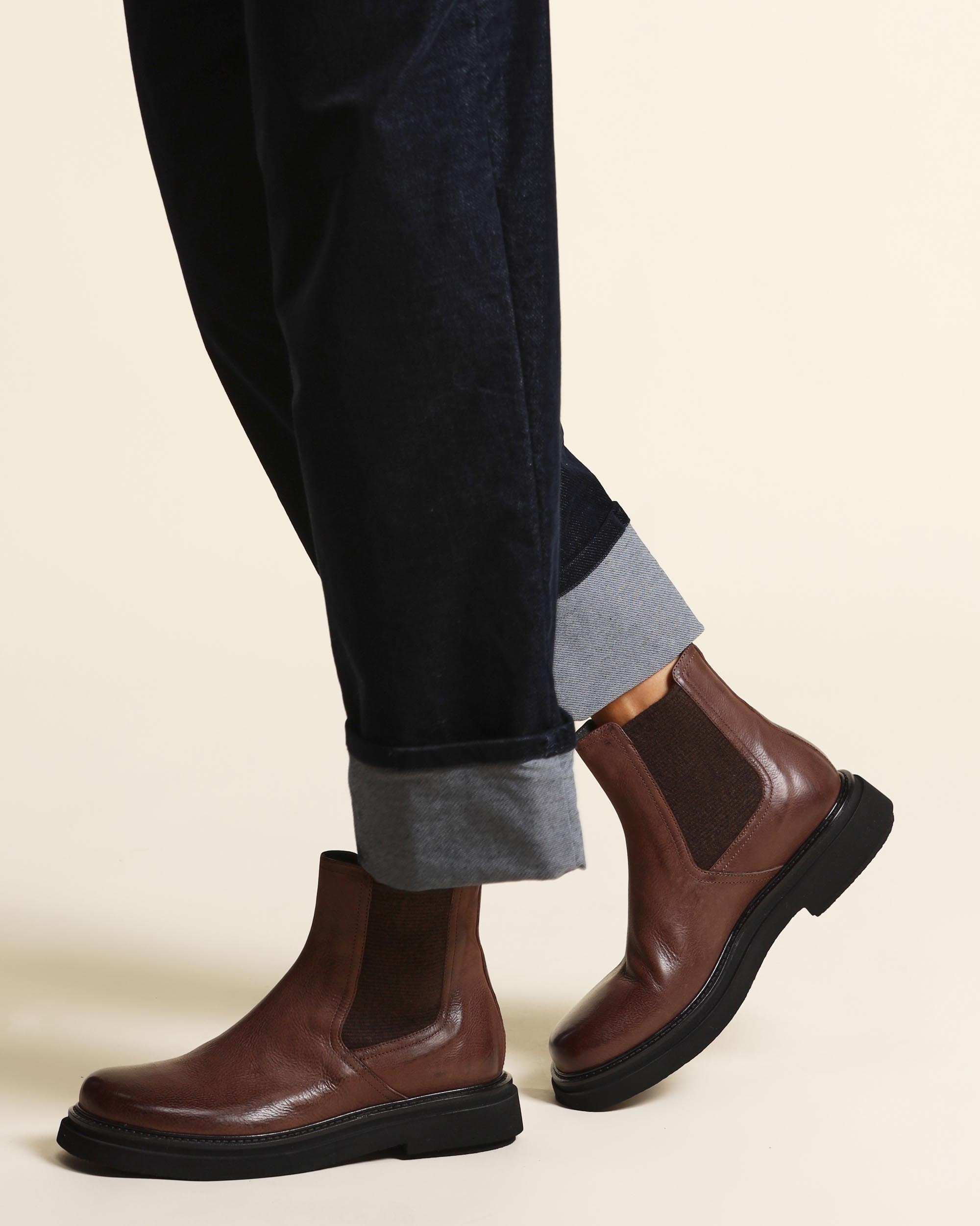 Tronchetti testa moro in pelle effetto invecchiato, inserti elastici laterali, suola in gomma, tacco 35, fodera in pelle, sottopiede in pelle, tirante posteriore in pelle, made in Italy, collezione donna Fruit Autunno Inverno 2025/26