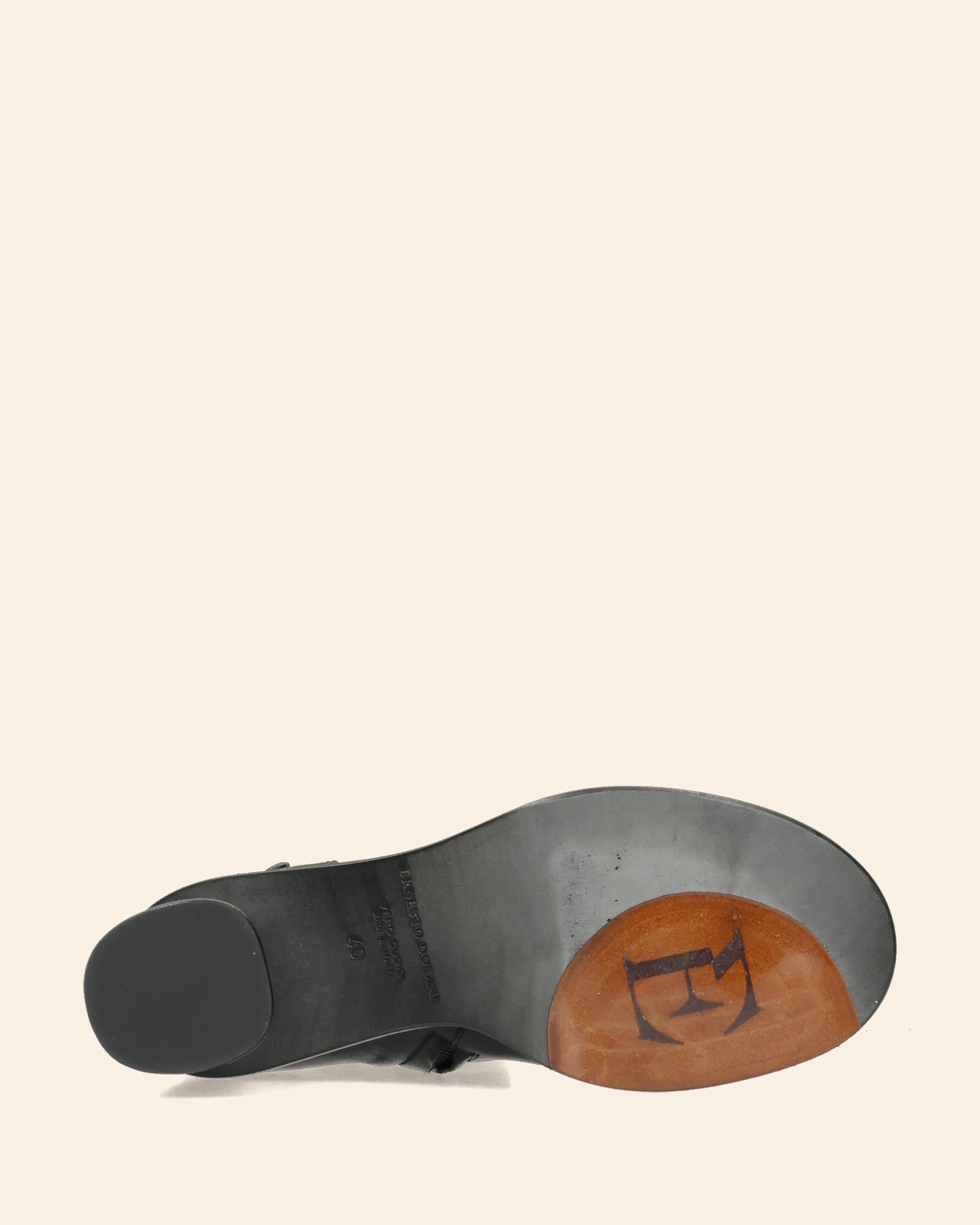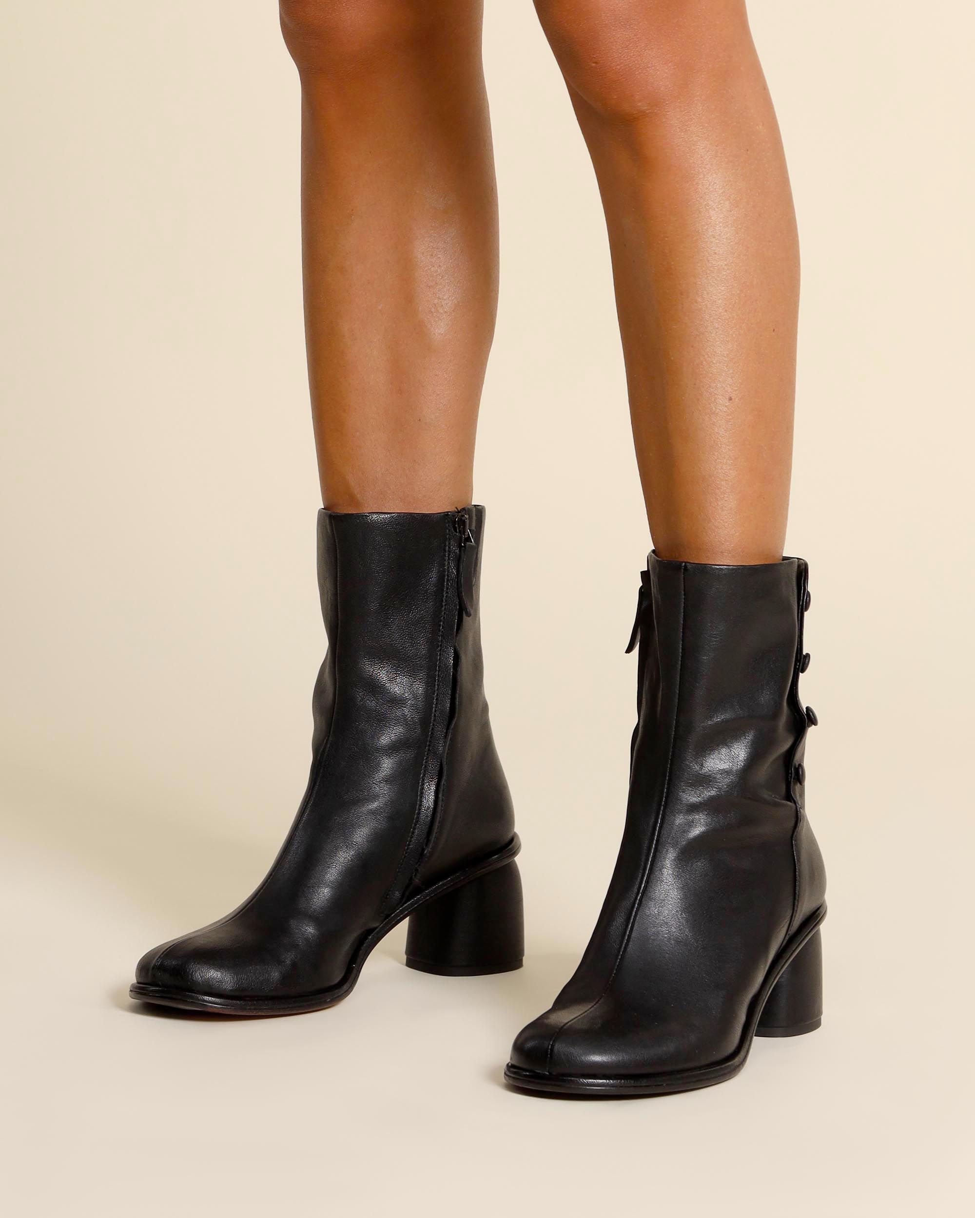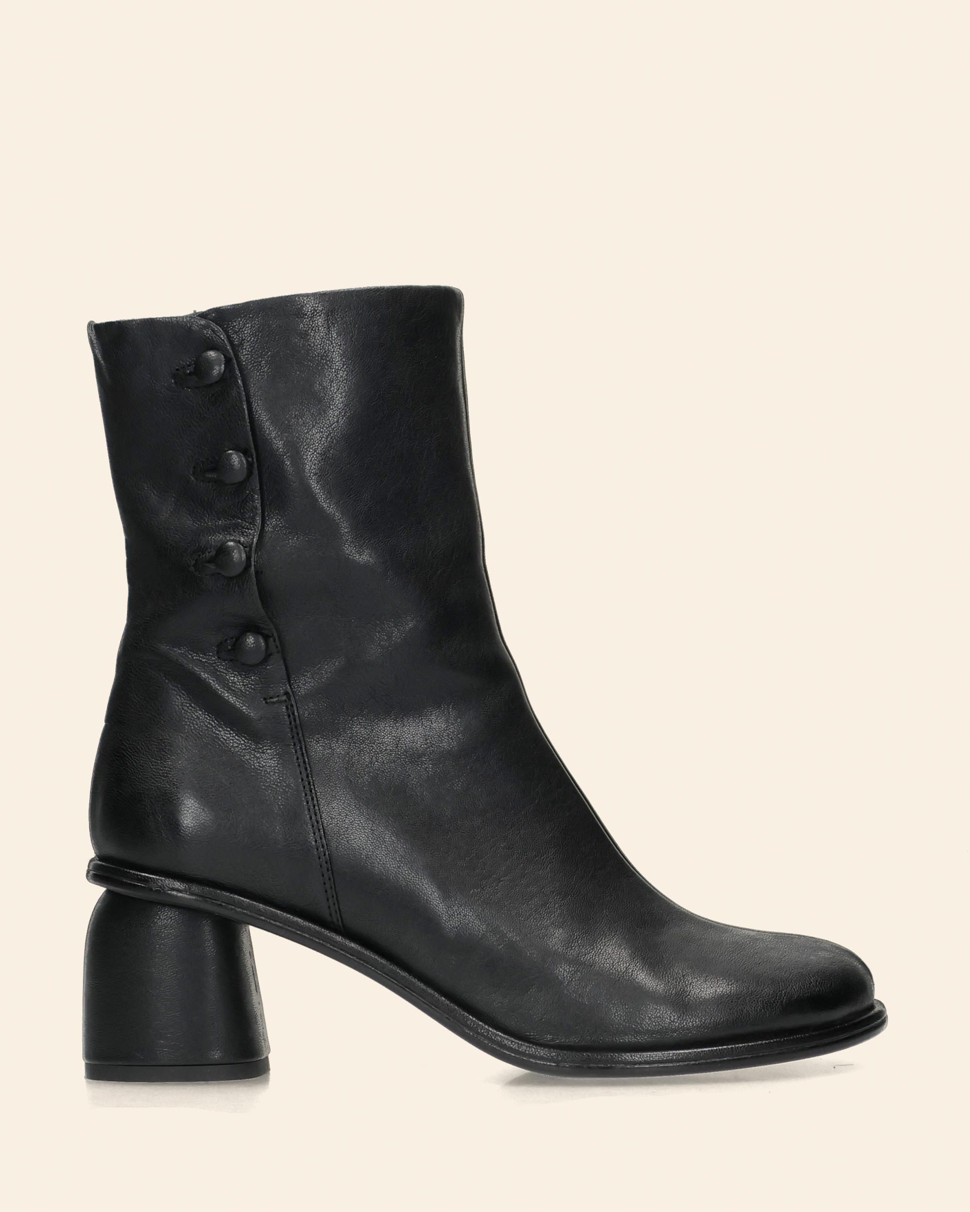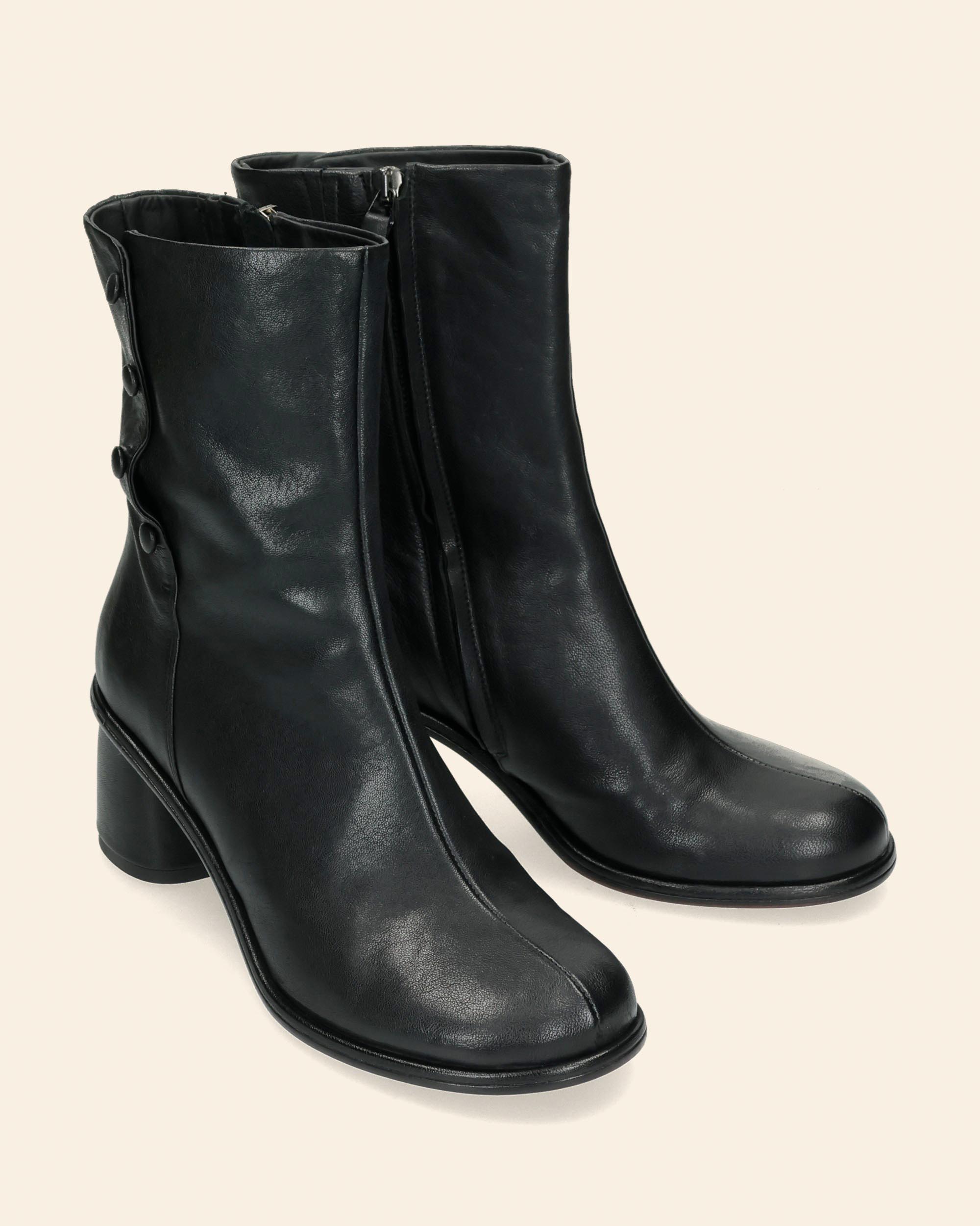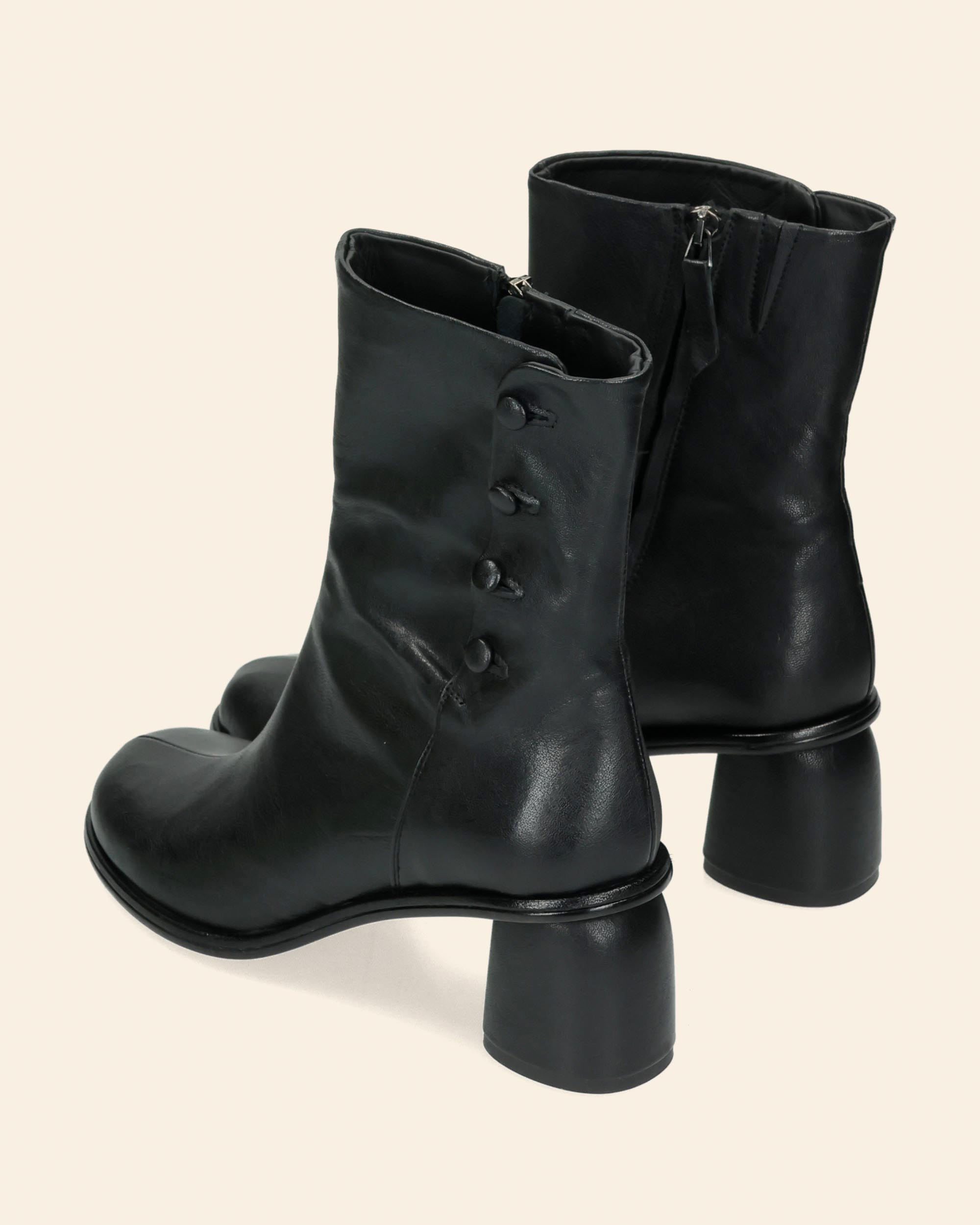 Stivaletti in pelle nera, fodera in pelle, sottopiede in pelle, tacco in pelle 60mm, dettaglio esterno di finti bottoni, zip interna, punta tonda, suola in cuoio con inserto in gomma logato, made in Italy, collezione Autunno inverno Ernesto Dolani 2025/2026