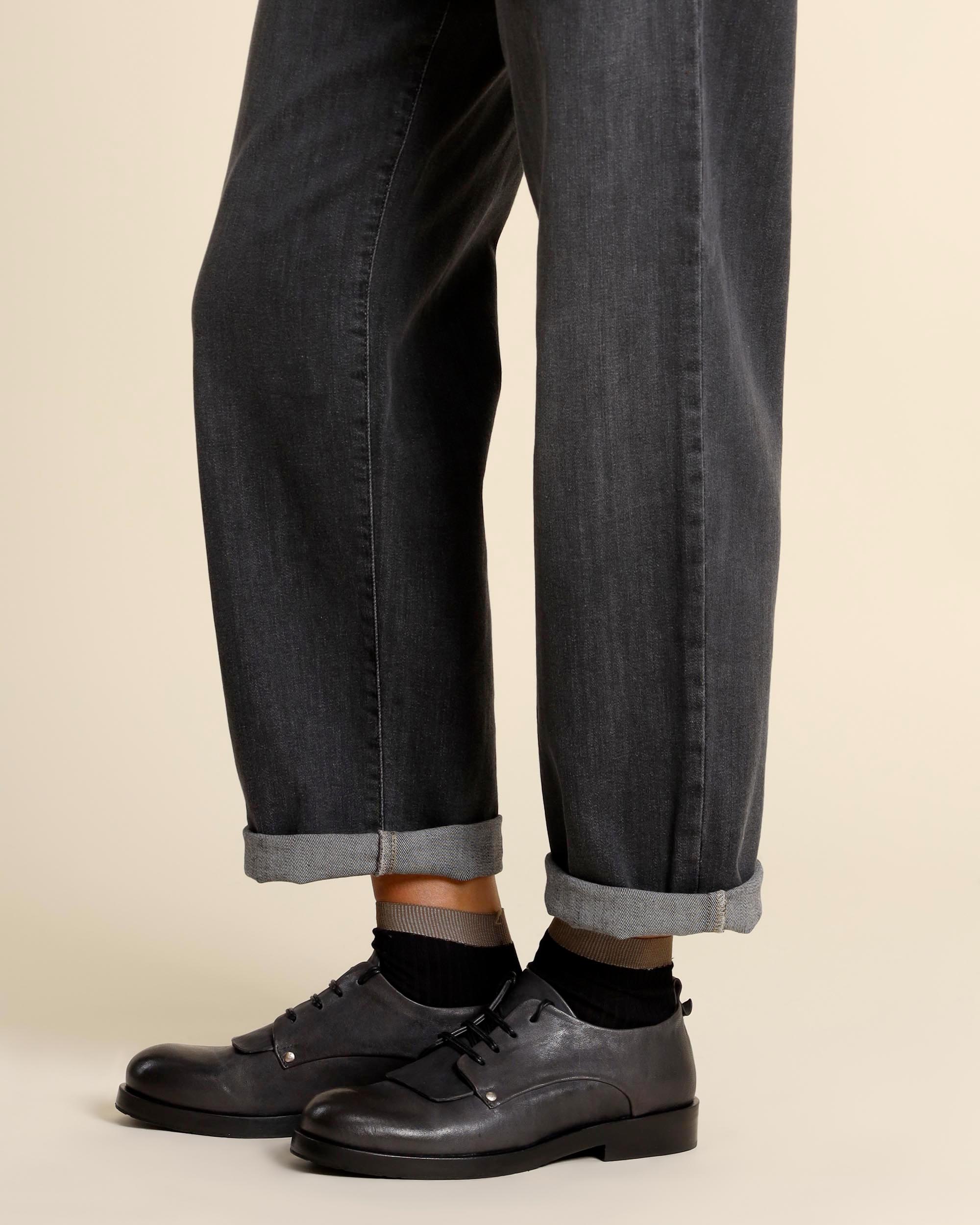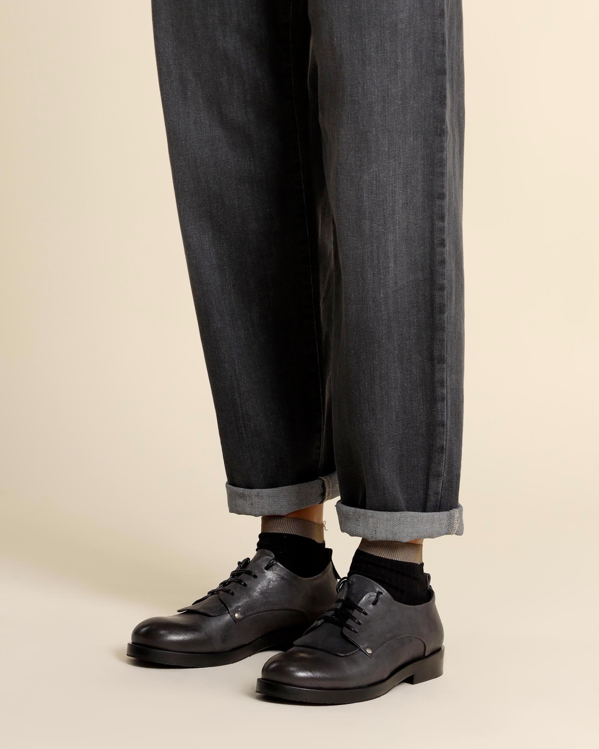 Stringate in pelle effetto invecchiato color grigio antracite, sottopiede in pelle, fodera in pelle, punta tonda, tacco 25mm, fondo in cuoio con inserto in gomma logato, Made in Italy, Colezione Autunno Inverno Ernesto Dolani 2025/2026