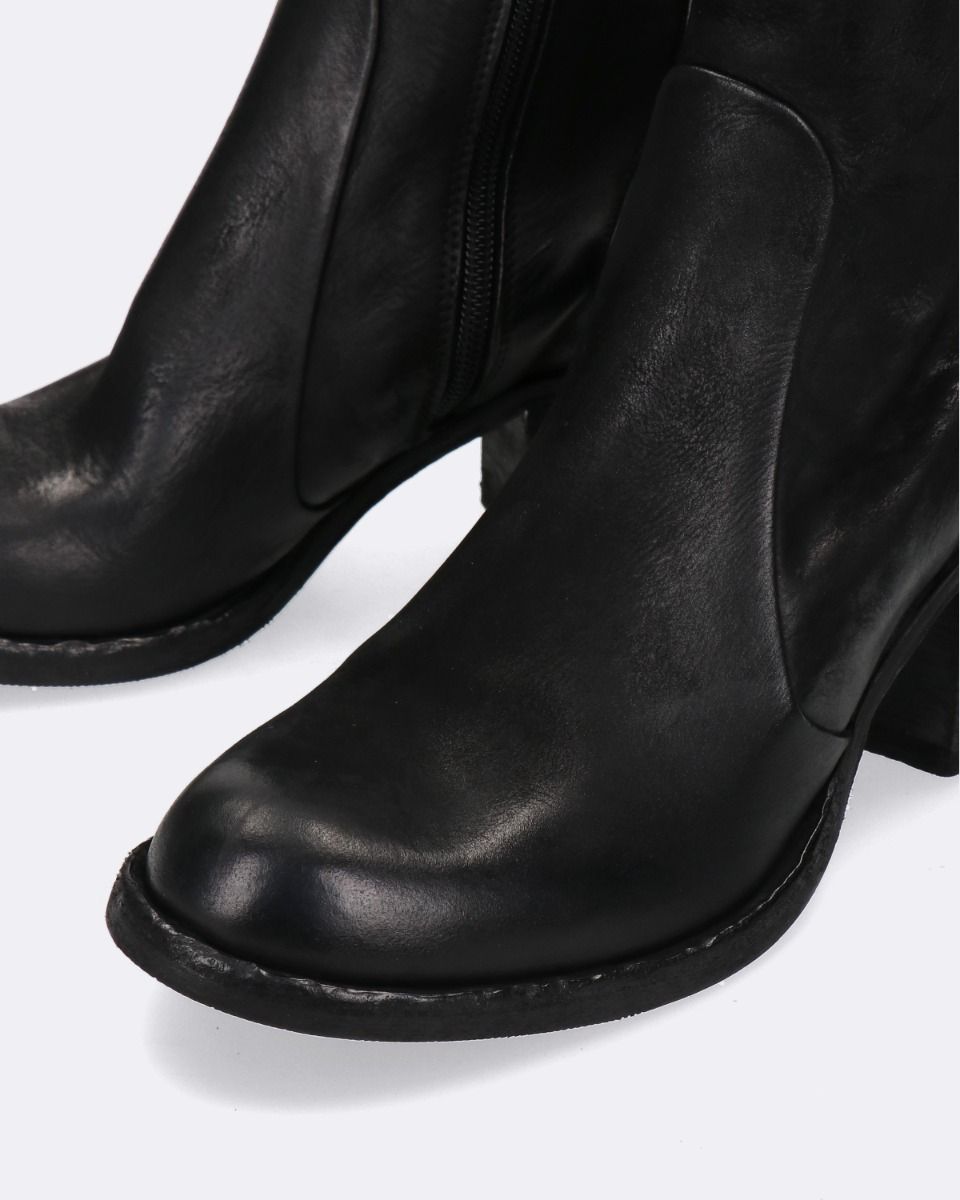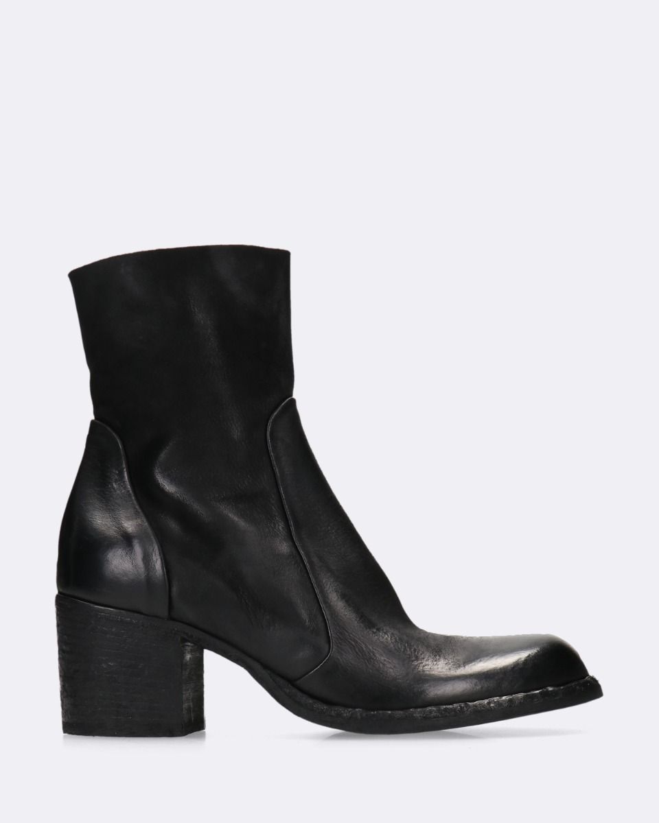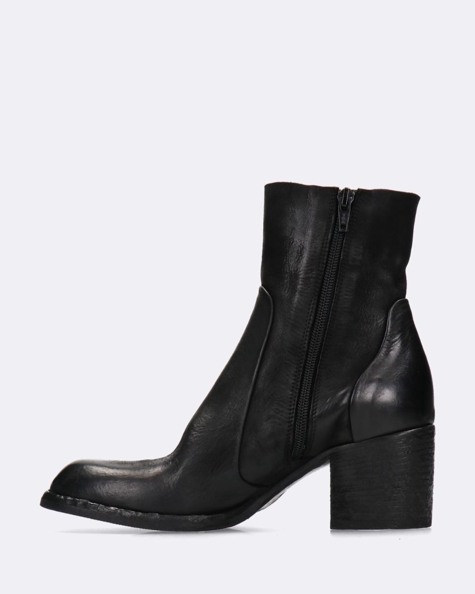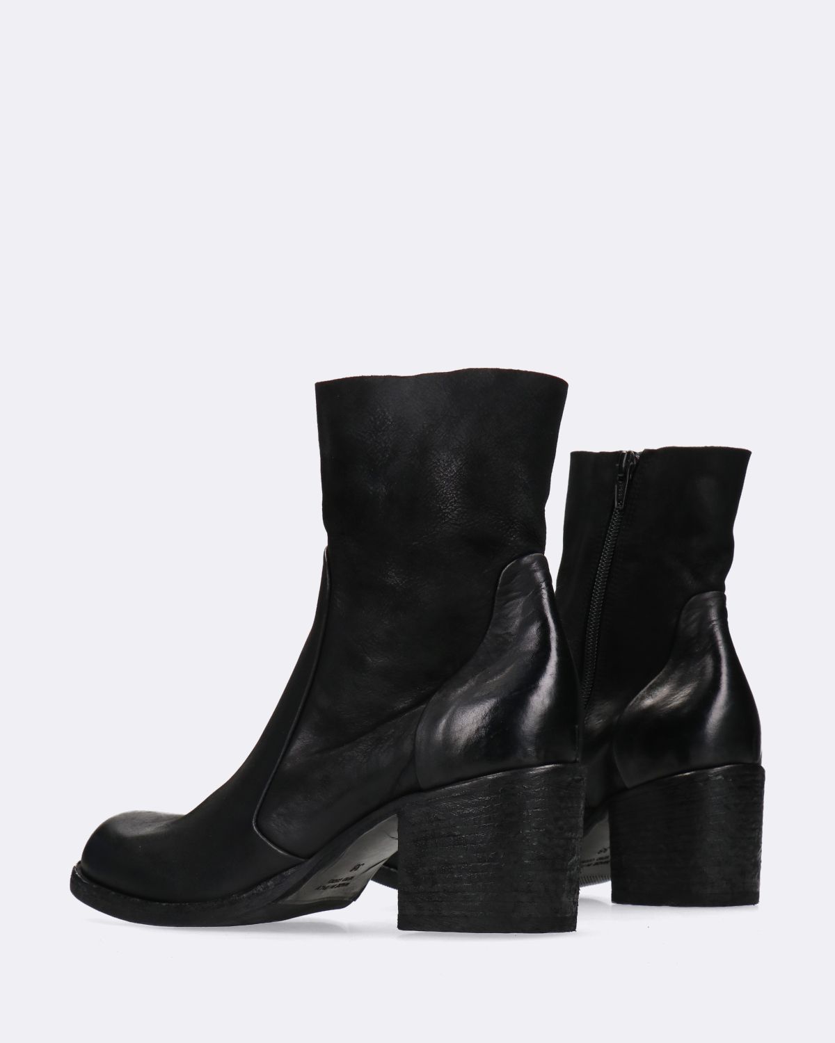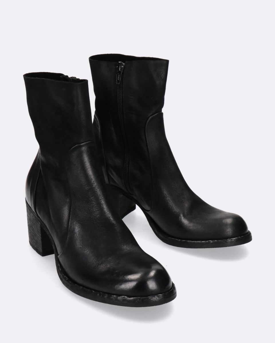 Stivaletti neri in pelle dalla lavorazione vintage, anticata e rifinita a mano, suola in cuoio e gomma, tacco 60mm, soletta in pelle, chiusura laterale con zip, fodera in pelle, made in Italy, collezione donna Strategia Autunno Inverno 2022/23