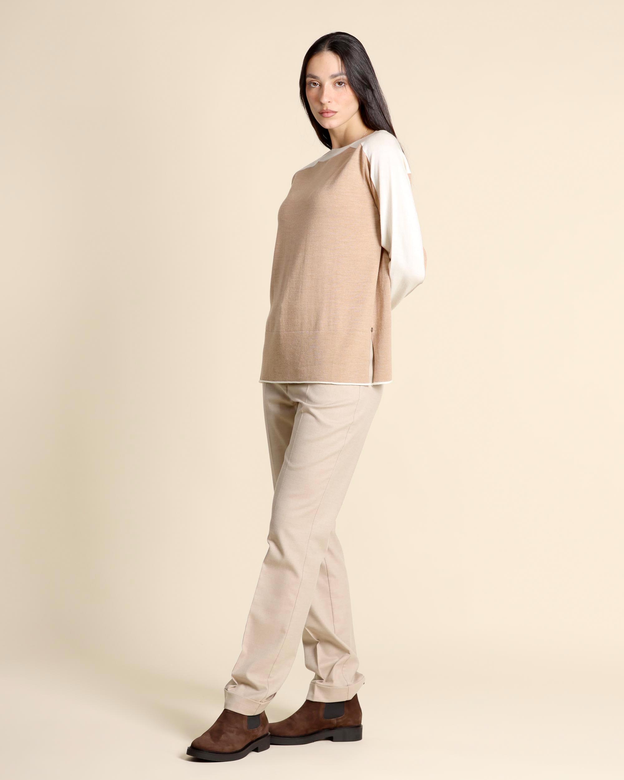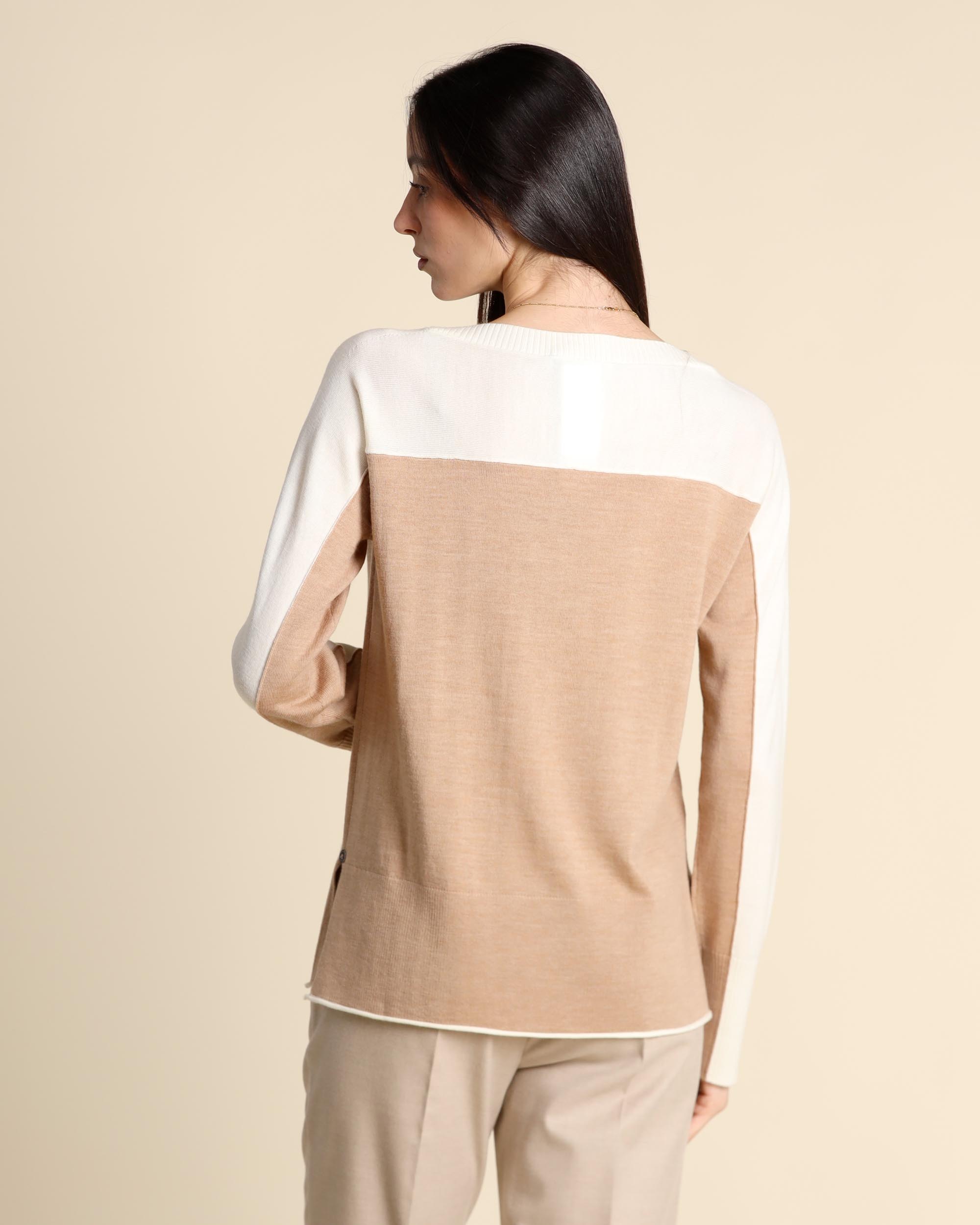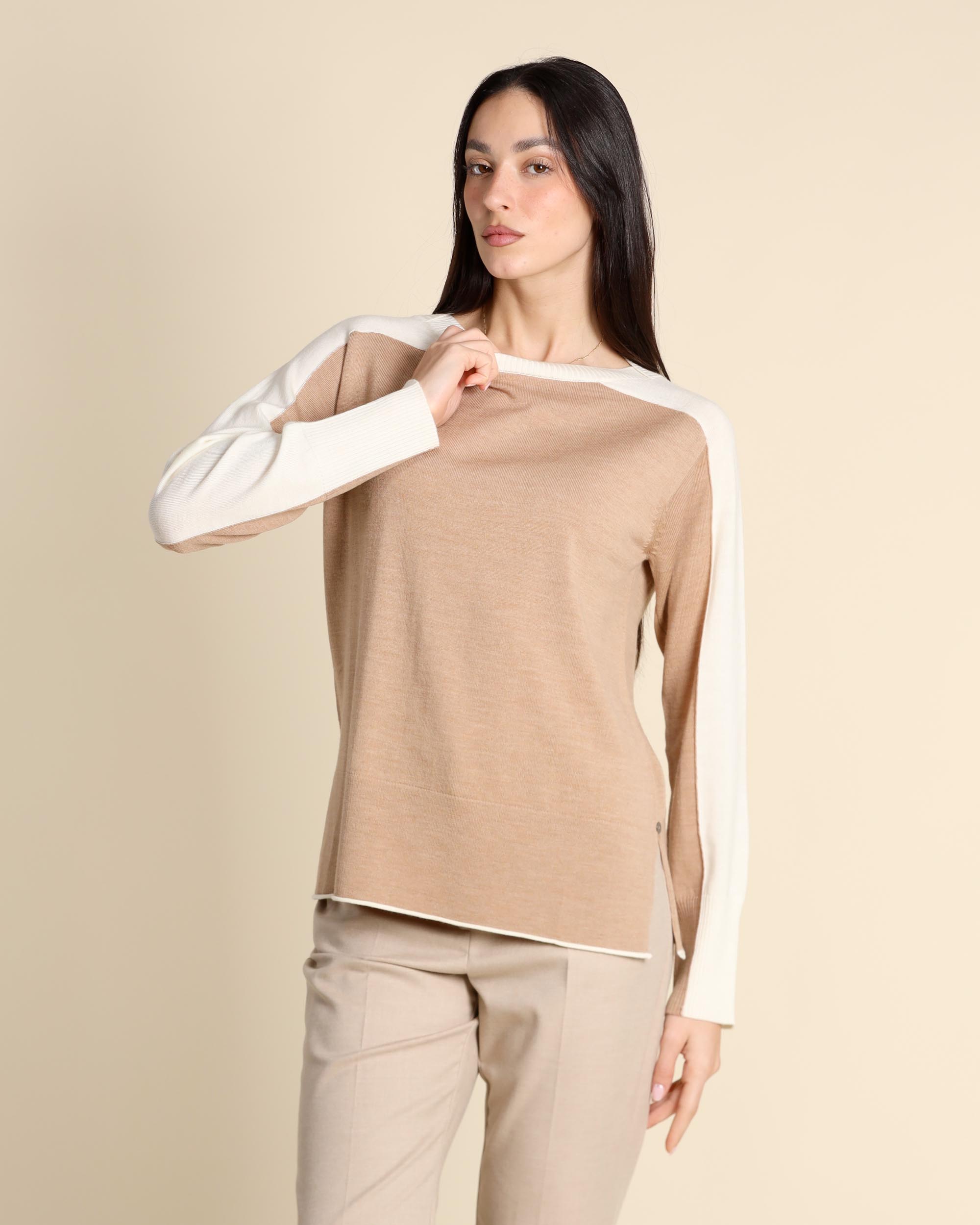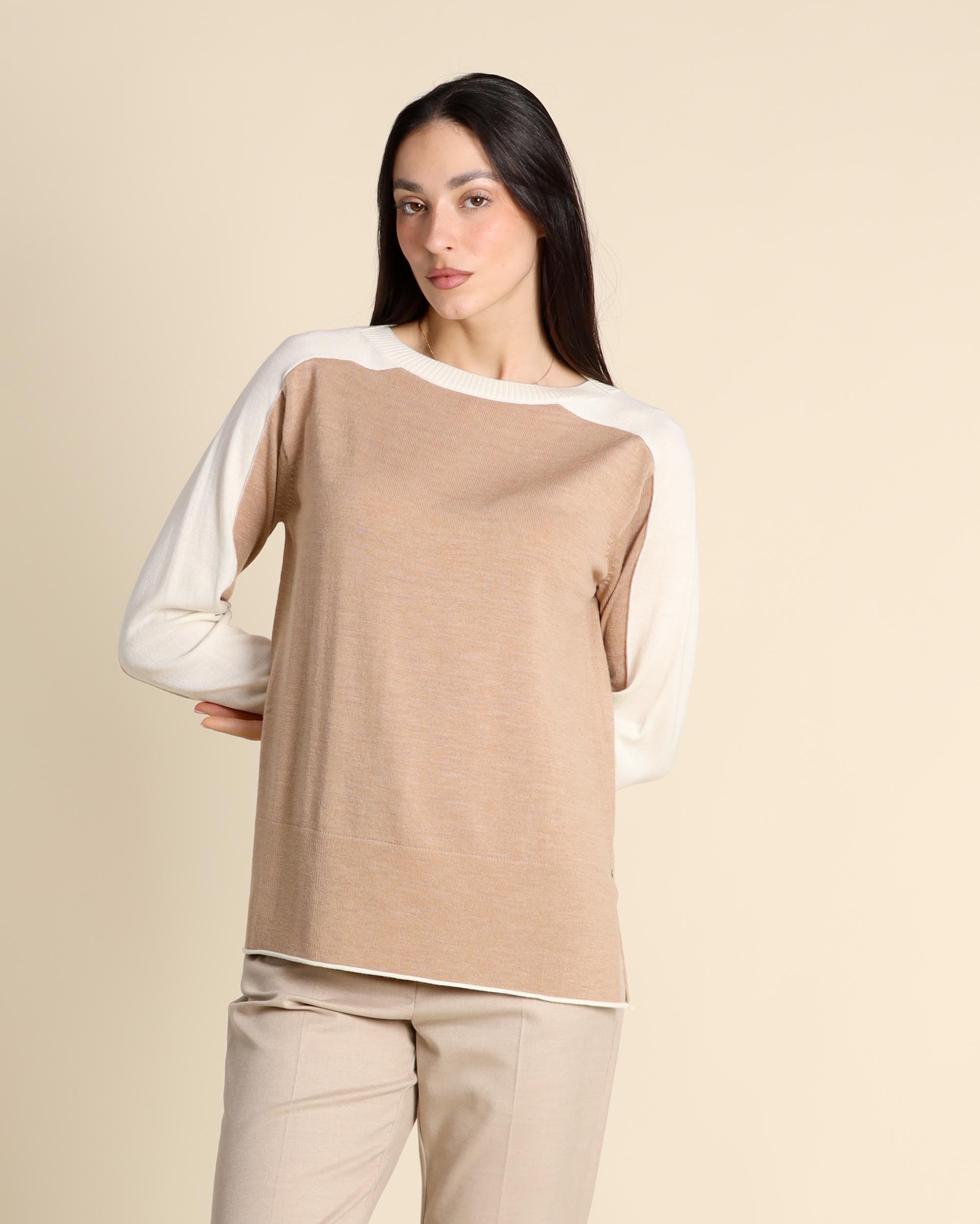 Maglia cammello e panna 100% lana, scollo tondo, maniche lunghe, linea ampia, spacchi laterali, la modella indossa una tg.S, la modella ha le seguenti misure: altezza 177, seno 84, vita 63, fianchi 94, collezione donna Pennyblack Autunno Inverno 2025/26