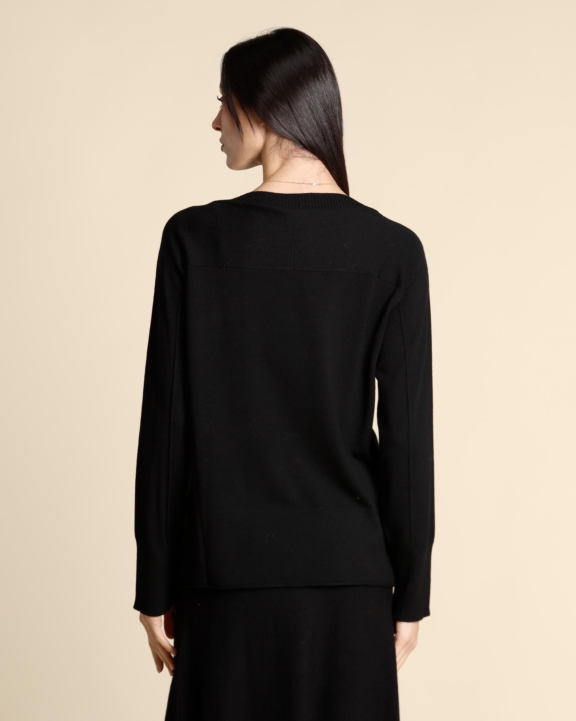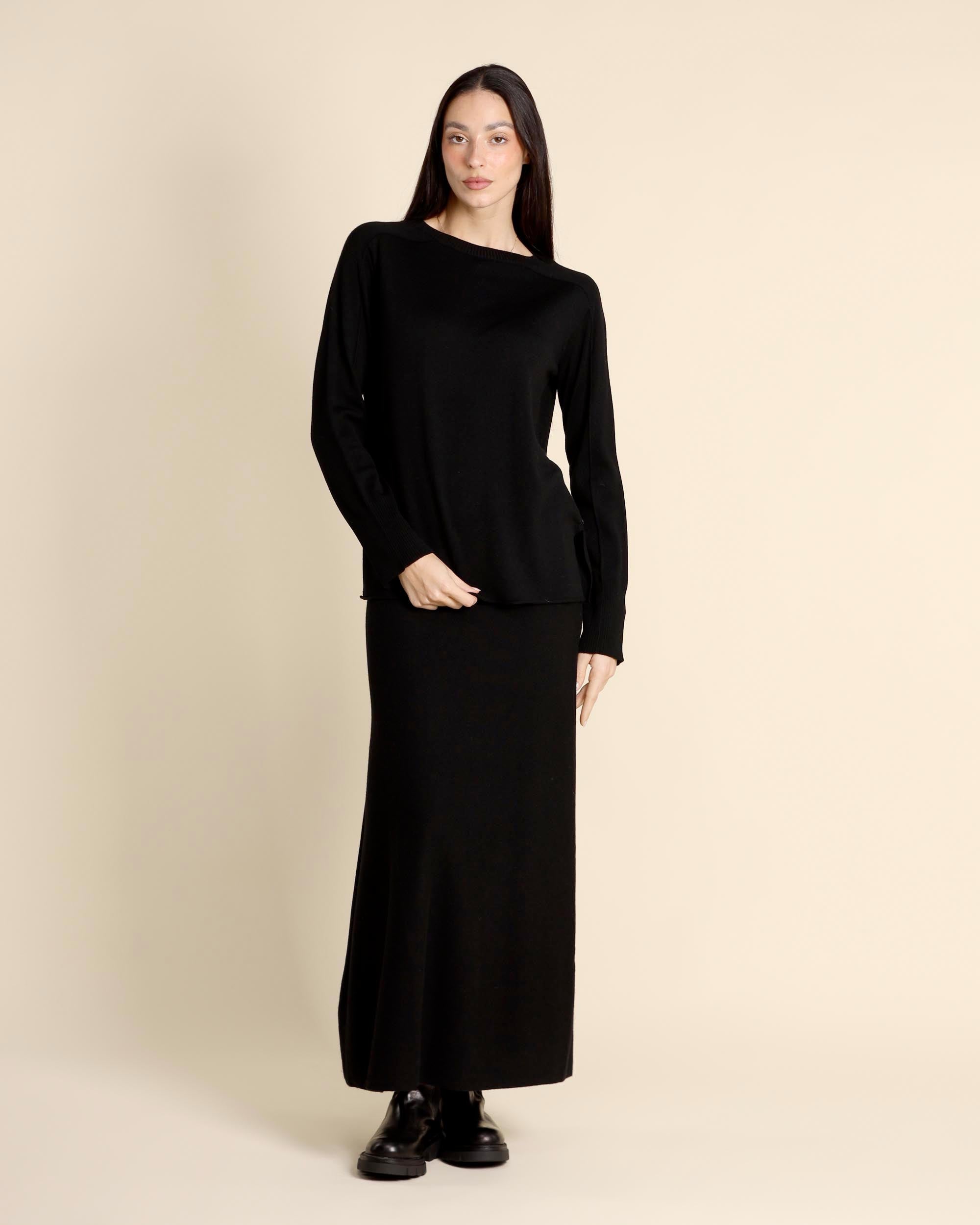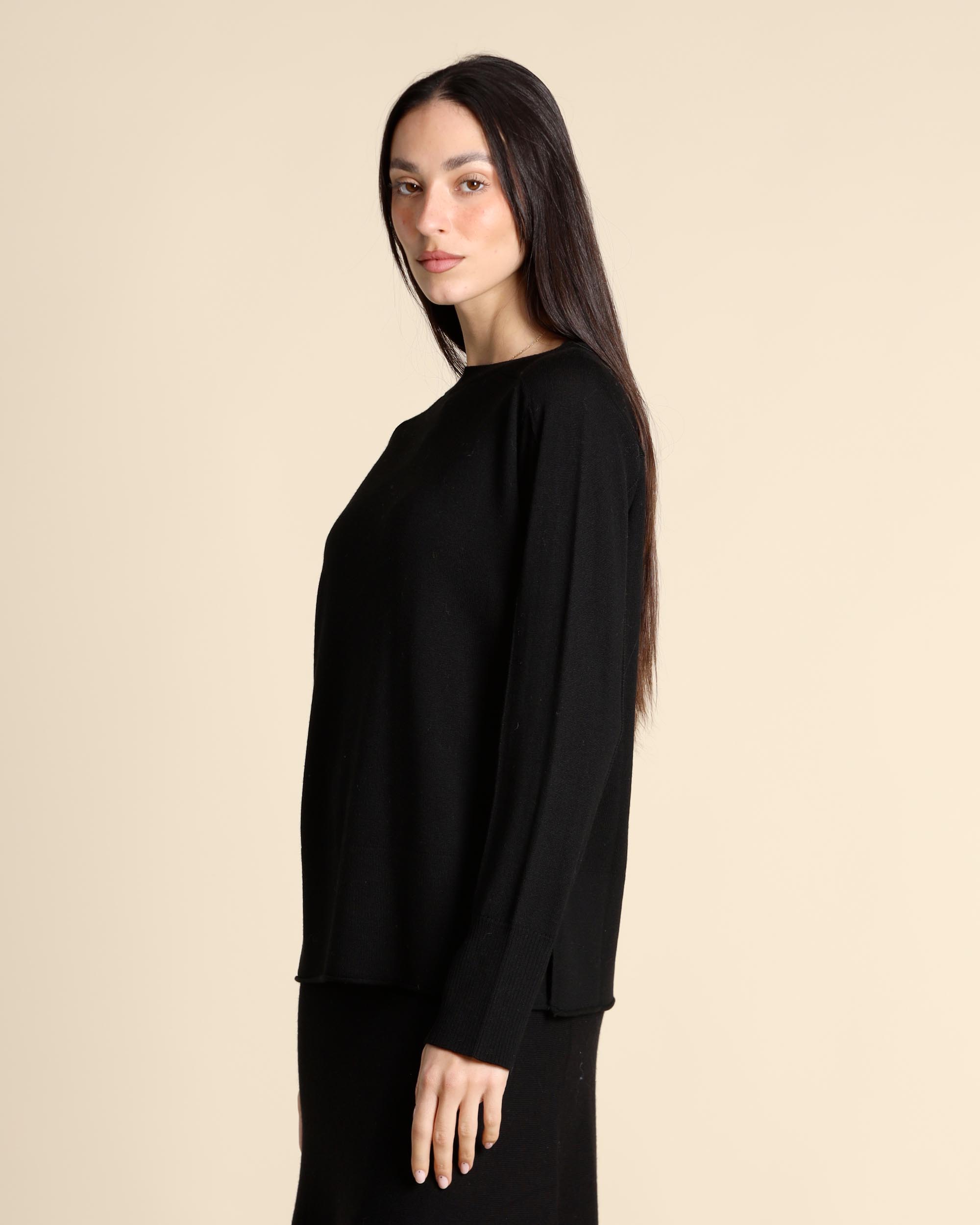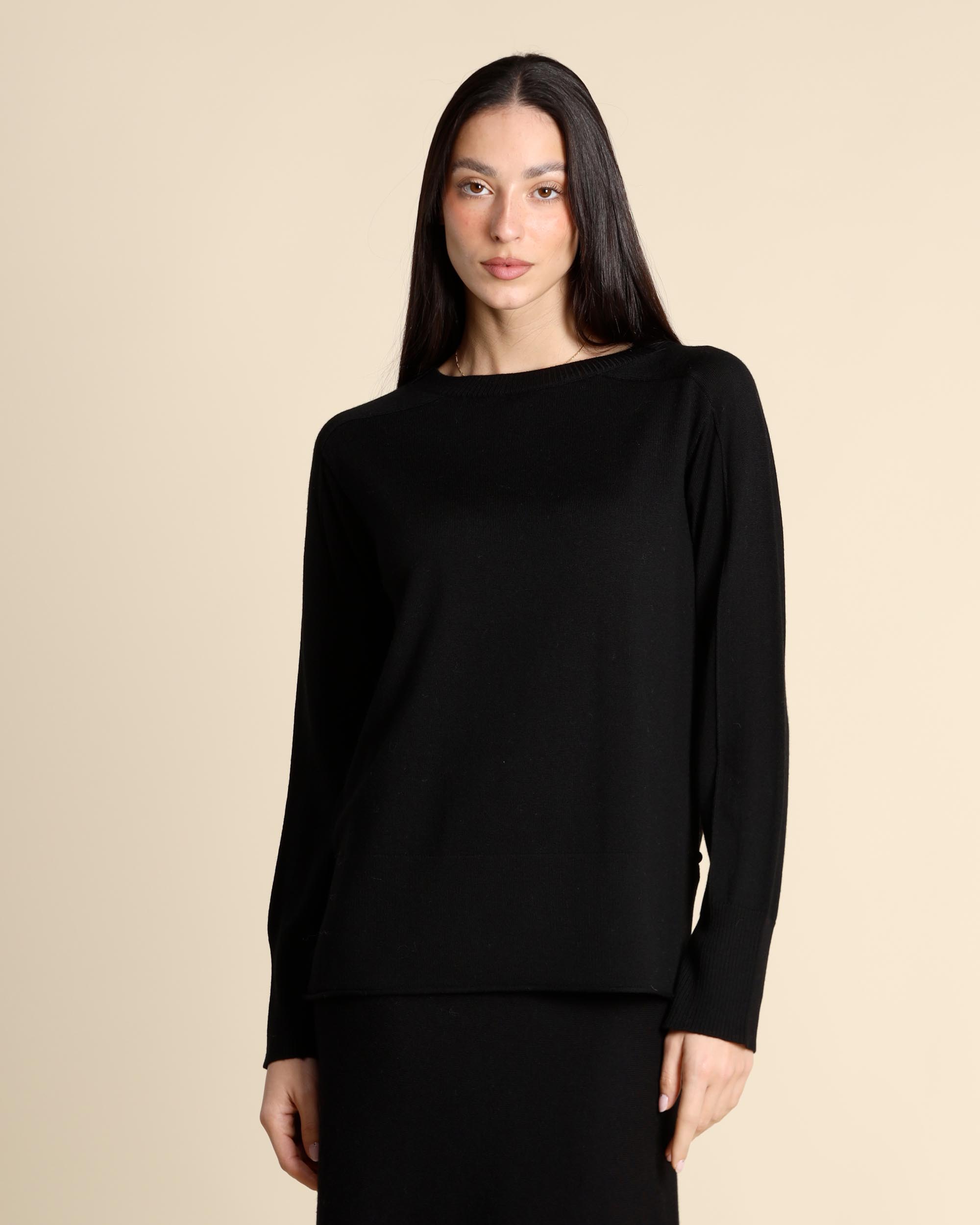 Maglia nera 100% lana, scollo tondo, maniche lunghe, linea ampia, spacchi laterali, la modella indossa una tg.S, la modella ha le seguenti misure: altezza 177, seno 84, vita 63, fianchi 94, collezione donna Pennyblack Autunno Inverno 2025/26