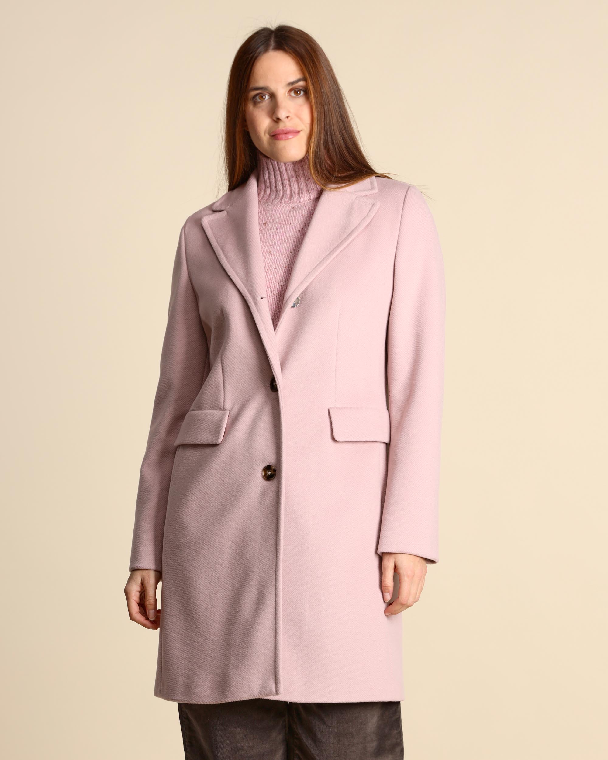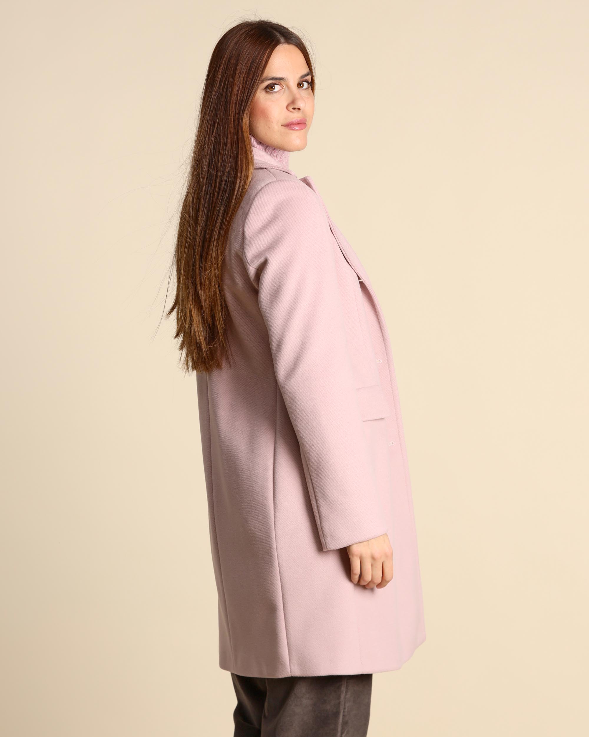 Cappotto rosa in panno soft, collo a revers, maniche lunghe, chiusura con bottoni, linea semiaderente, tasche con patta, foderato, la modella indossa una tg.42, la modella ha le seguenti misure: altezza 179, seno 86,vita 65, fianchi 93, collezione donna Emme by Marella Autunno Inverno 2025/26