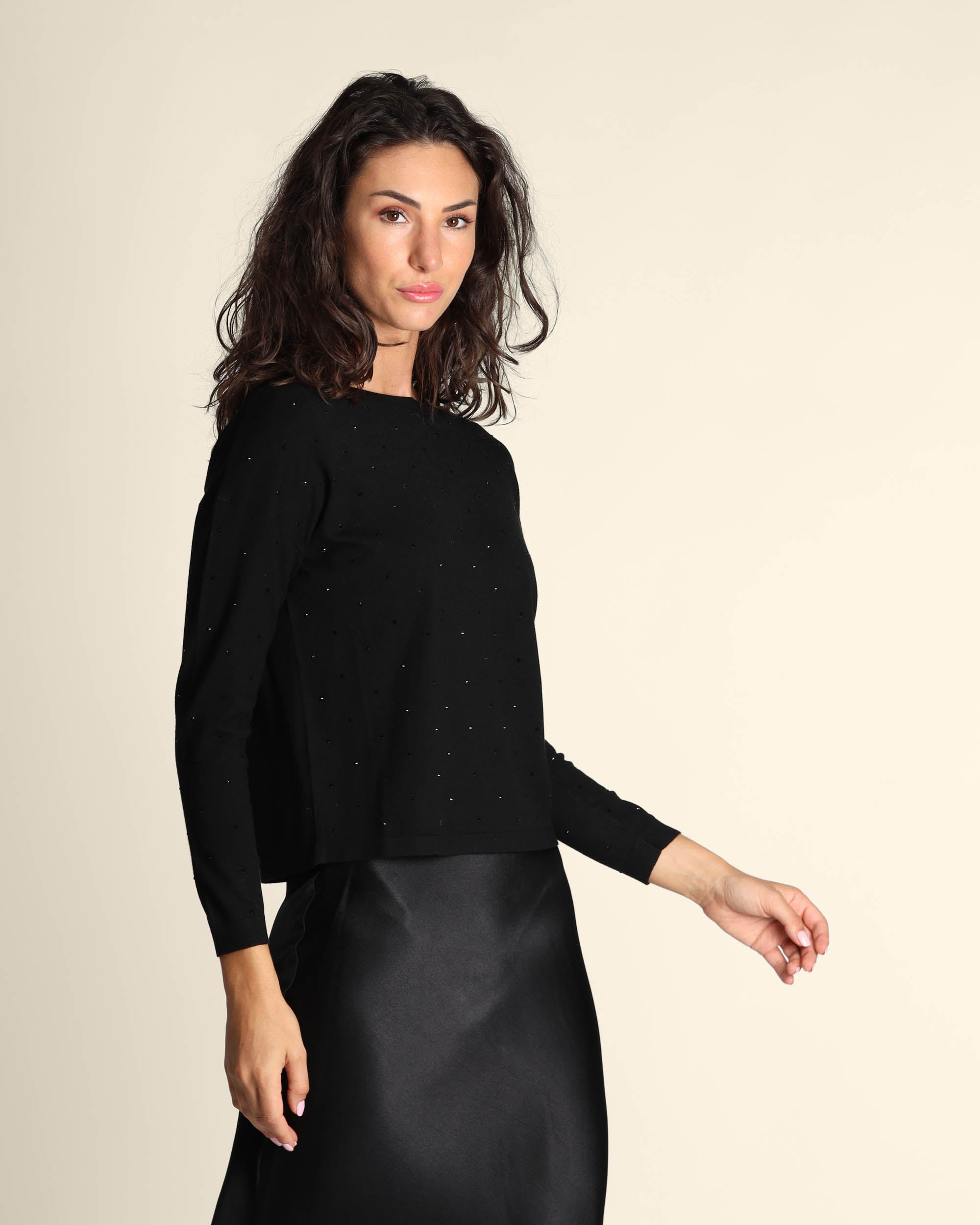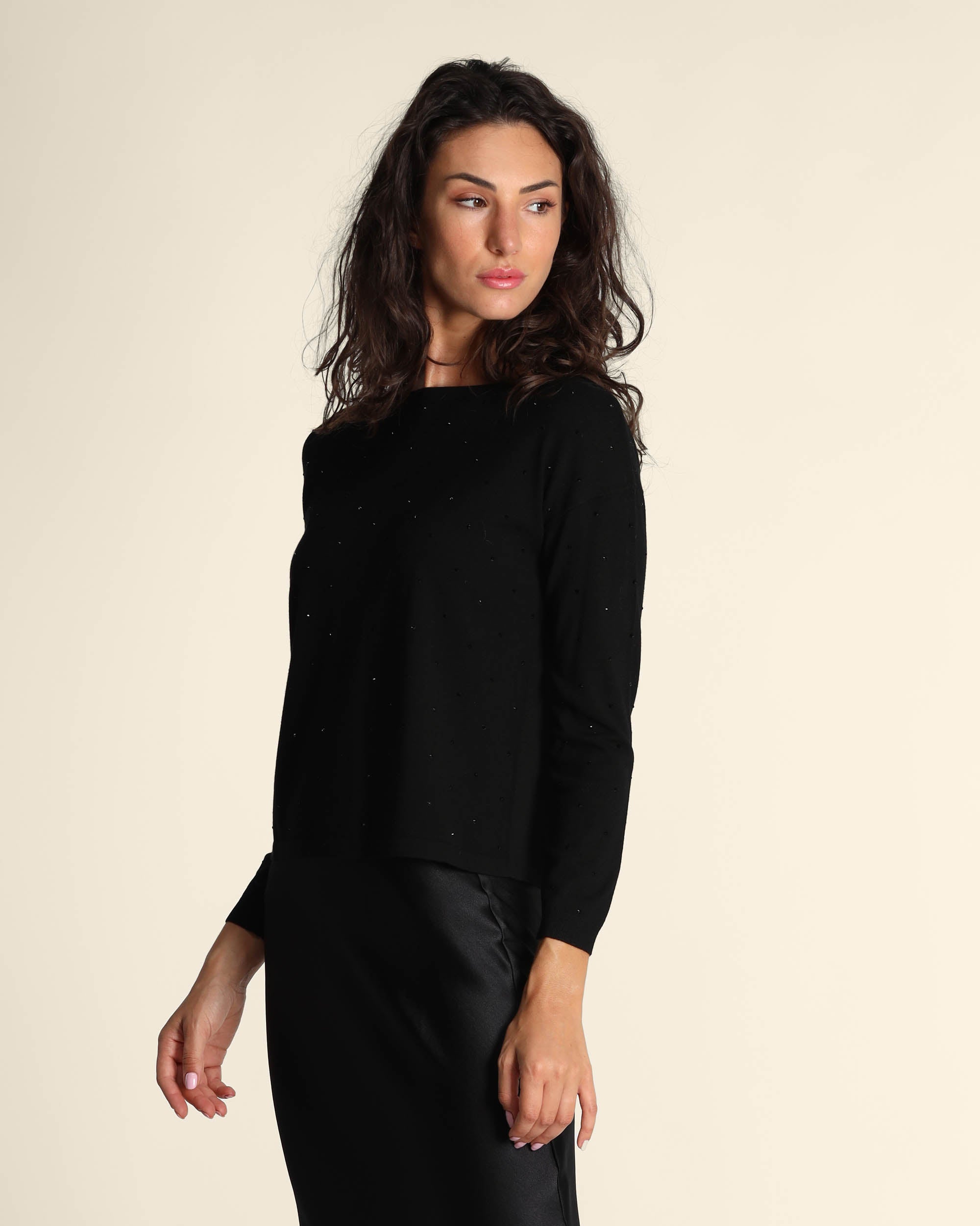 Maglia nera in misto viscosa con applicazione di micro borchie, scollo a barchetta, giro sceso, maniche lunghe, linea dritta, la modella indossa una tg.S, la modella ha le seguenti misure: altezza 179, seno 84, vita 63, fianchi 94, collezione donna Pennyblack Autunno Inverno 2025/26