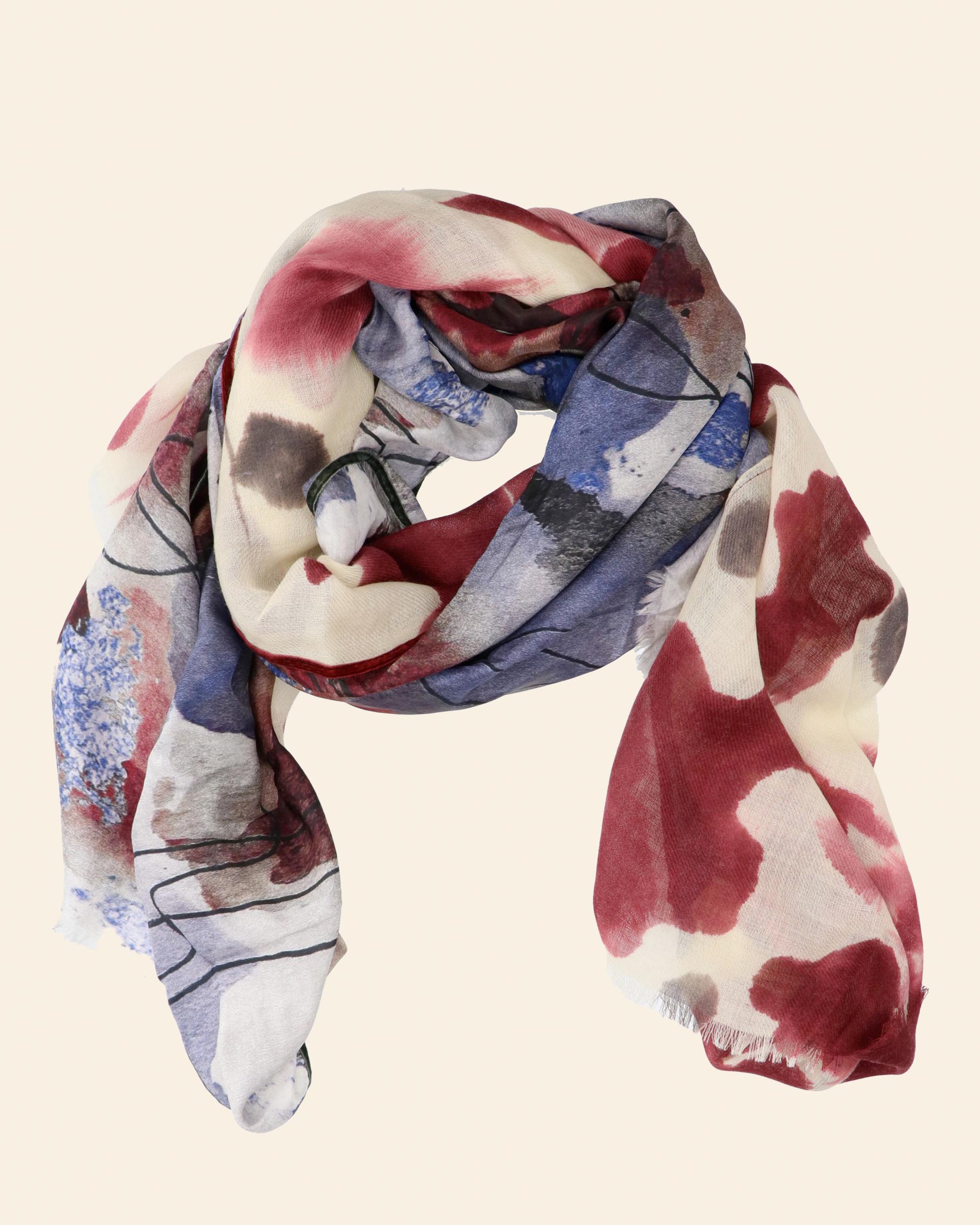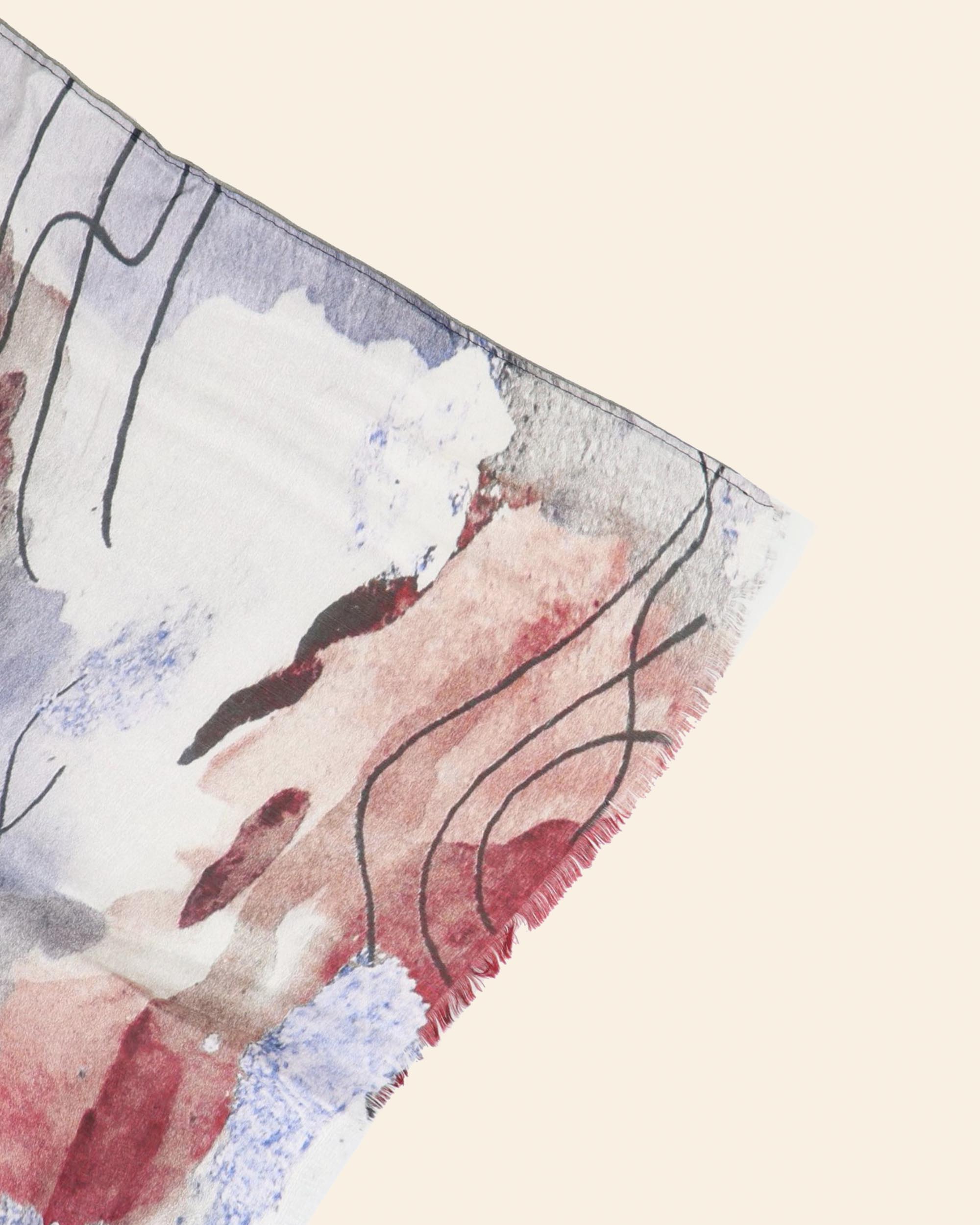 Stola in lana e seta a fantasia viola e bordeaux e panna, misura 100 cm x 200 cm, profilata in velluto color grigio, collezione donna Pyaar Autunno Inverno 2025/2026