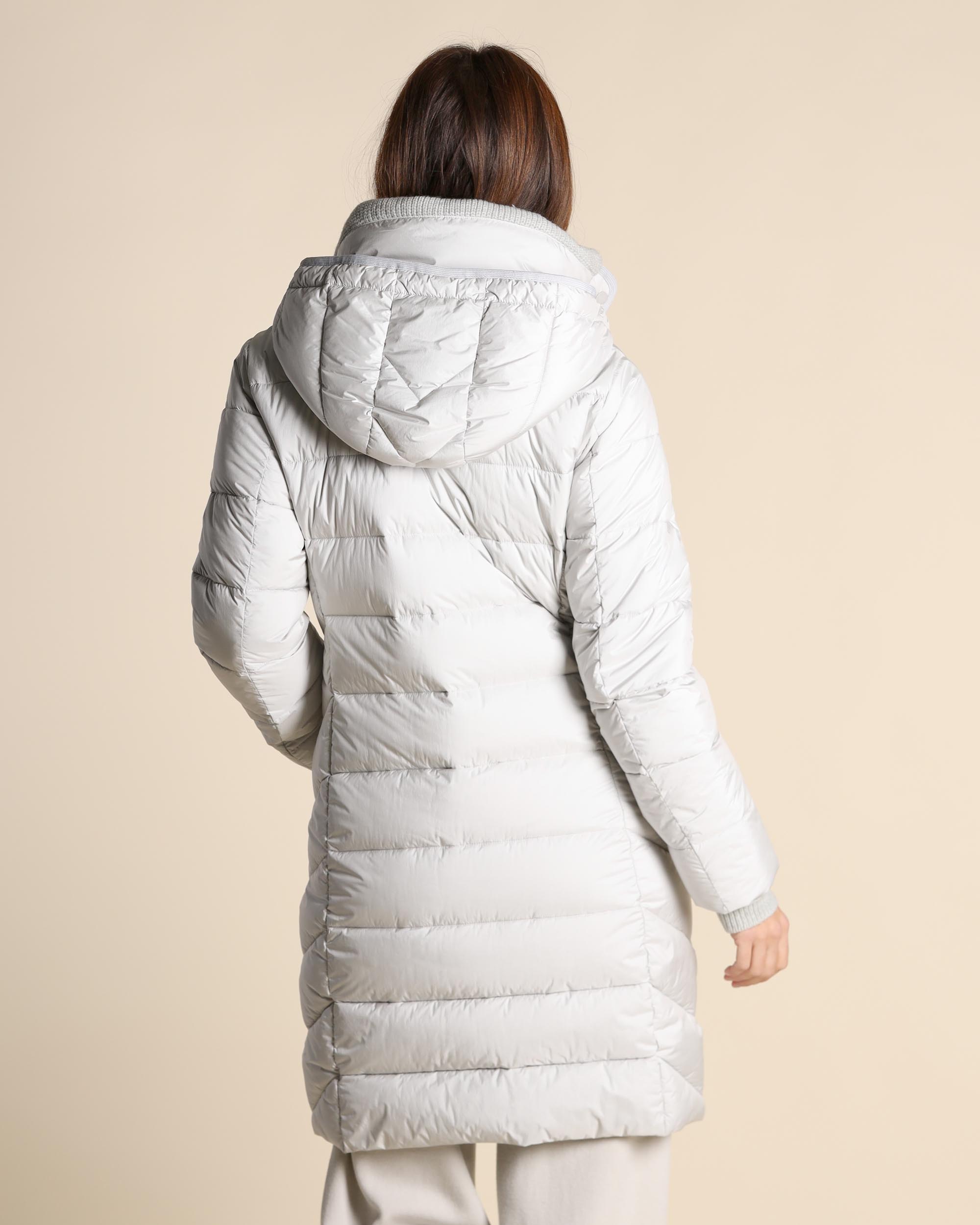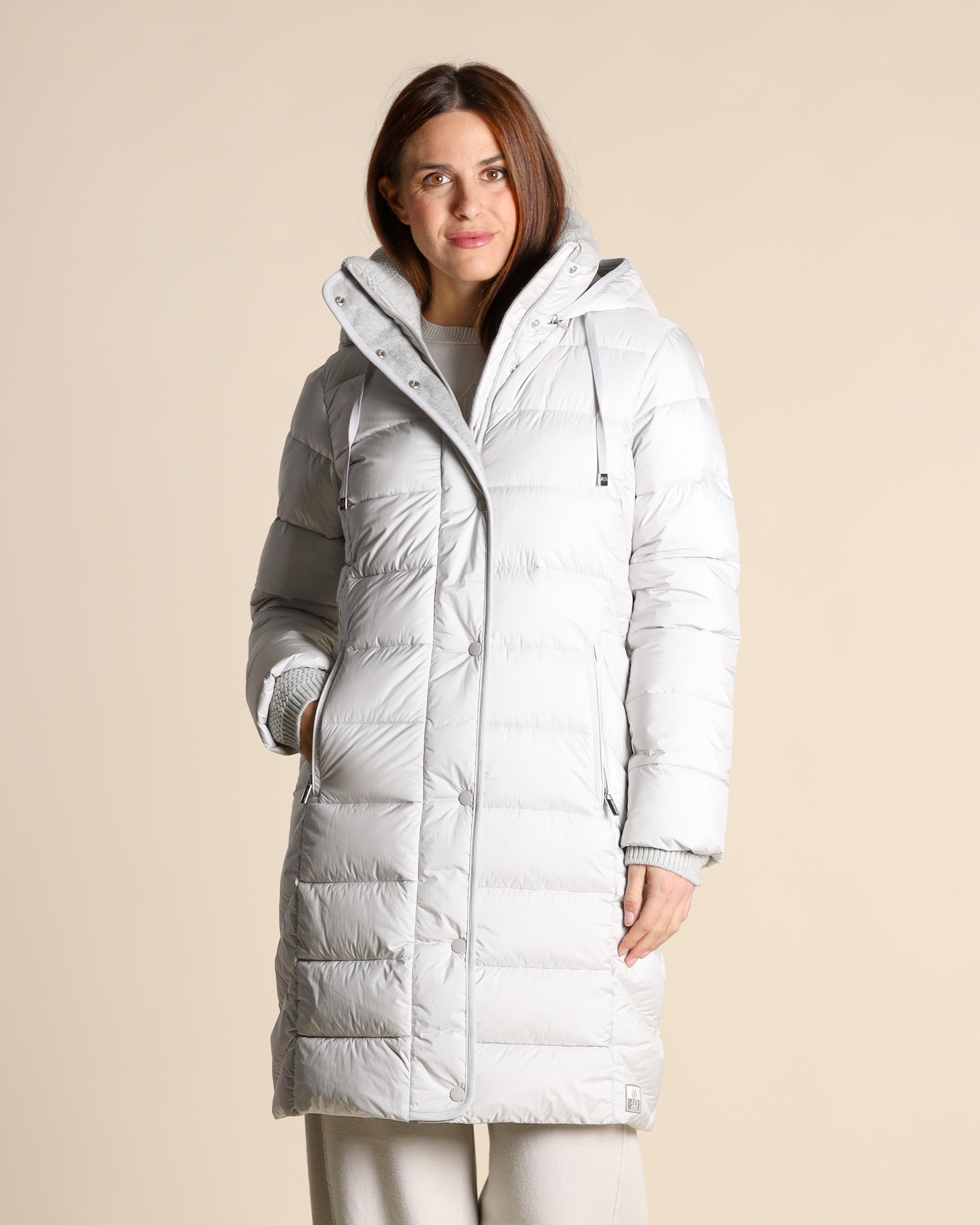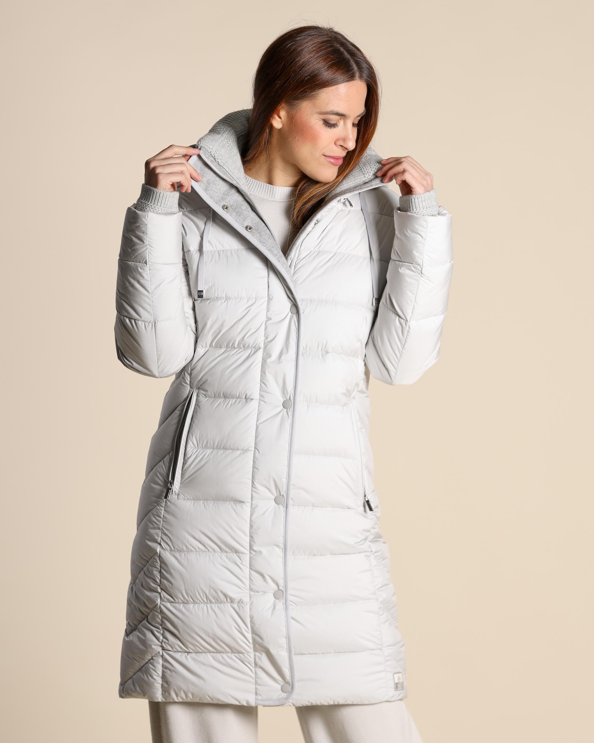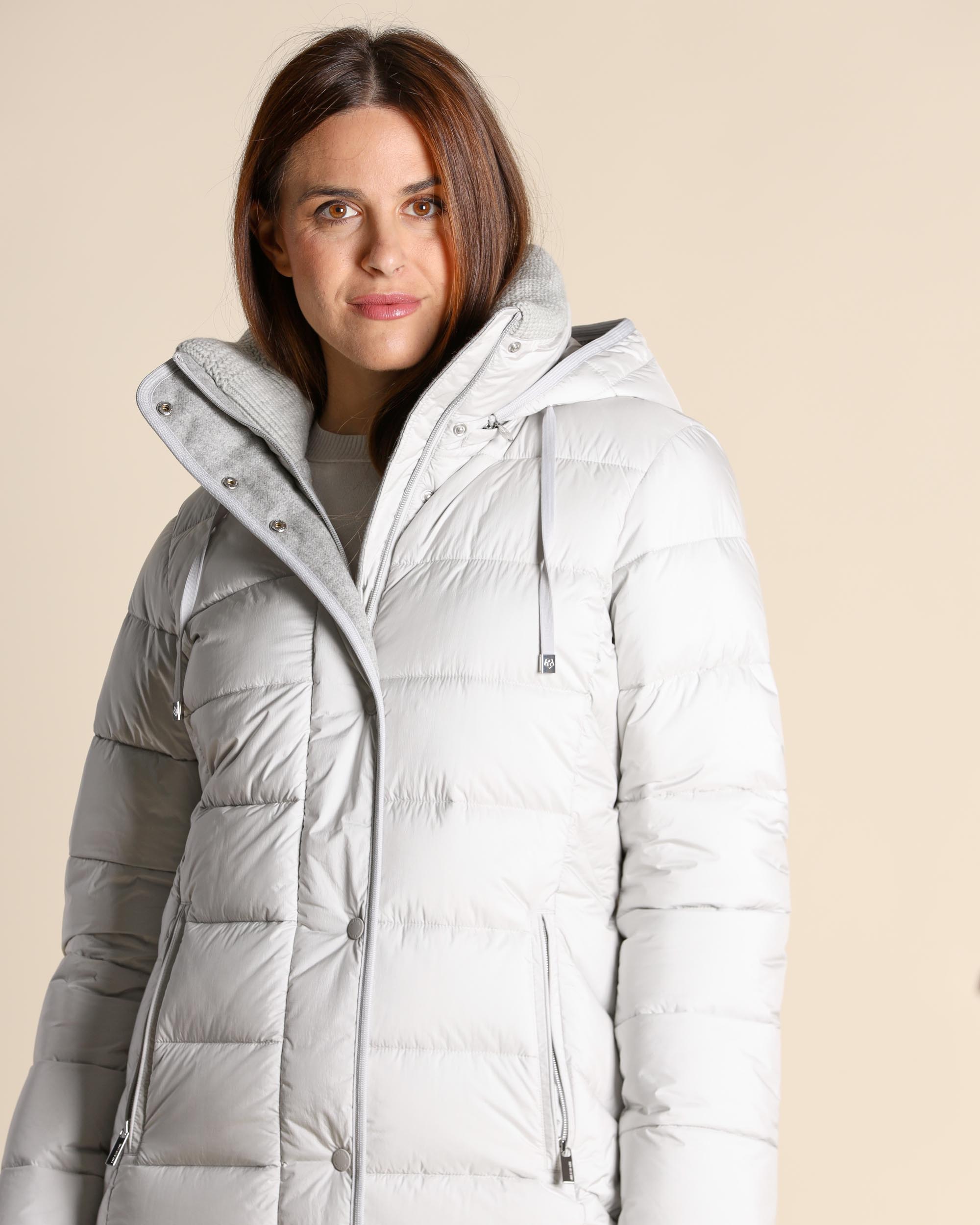 Piumino color ghiaccio in raso antigoccia, collo alto con interno in maglia e cappuccio con coulisse removibile, maniche lunghe con polsino in maglia, chiusura con zip a doppio cursore e bottoni automatici nascosti, tasche a filetto con zip, linea dritta, fodera animalier, imbottitura in Thinsulate, tessuto in microfibra sintetica termoisolante e traspirante, protegge dalle basse temperature con un peso molto contenuto, a parità di peso, garantisce un isolamento termico 15 volte superiore ad altri tessuti isolanti dello stesso spessore, la modella indossa una tg.42, la modella ha le seguenti misure: altezza 177, seno 87,vita 65, fianchi 93, collezione donna Milestone Autunno Inverno 2025/26