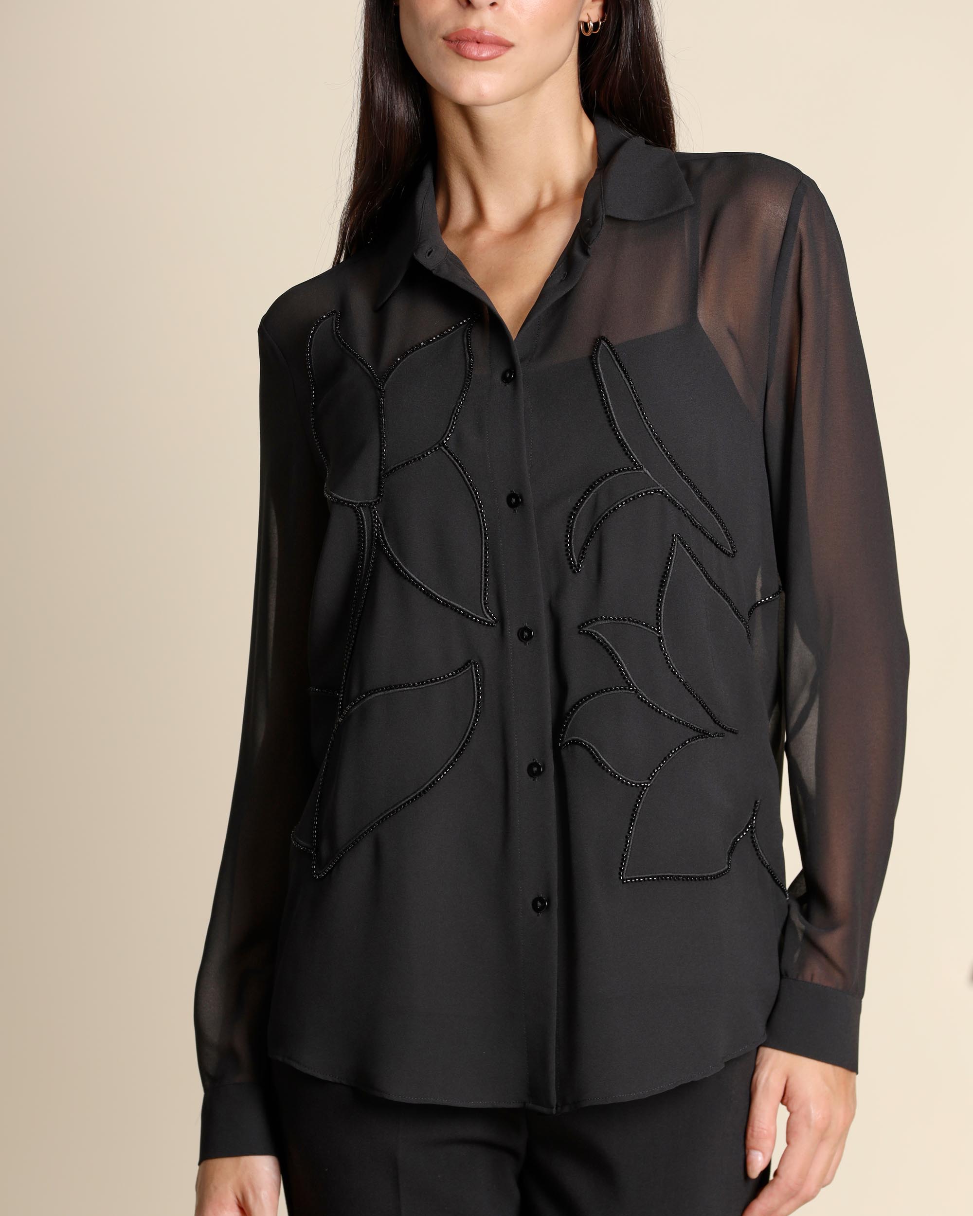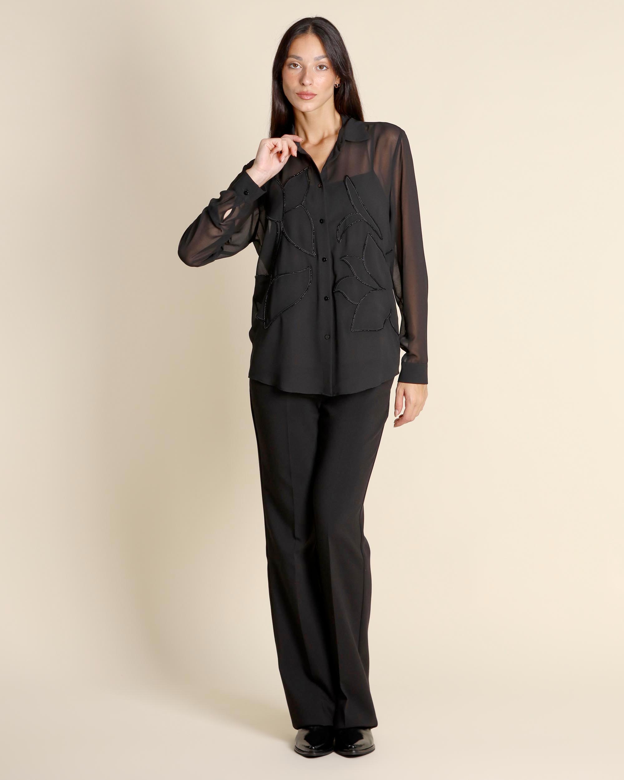 Camicia nera in georgette ricamata con perline sul davanti, collo a camicia, maniche lunghe, chiusura con bottoni, linea dritta e morbida, top antitrasparenza, la modella indossa una tg.42, la modella ha le seguenti misure: altezza 173, seno 86,vita 65, fianchi 93, collezione donna Pennyblack Autunno Inverno 2025/26