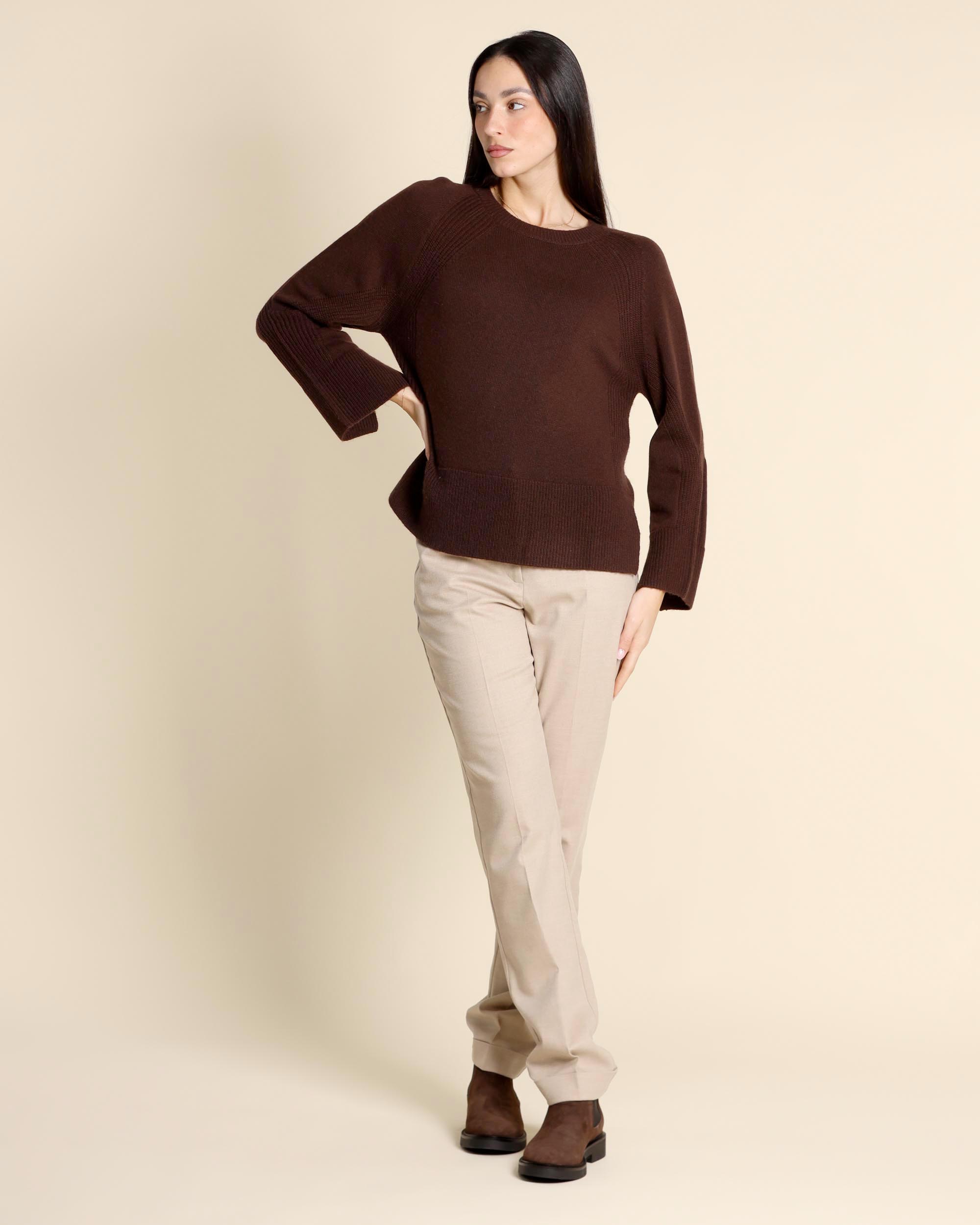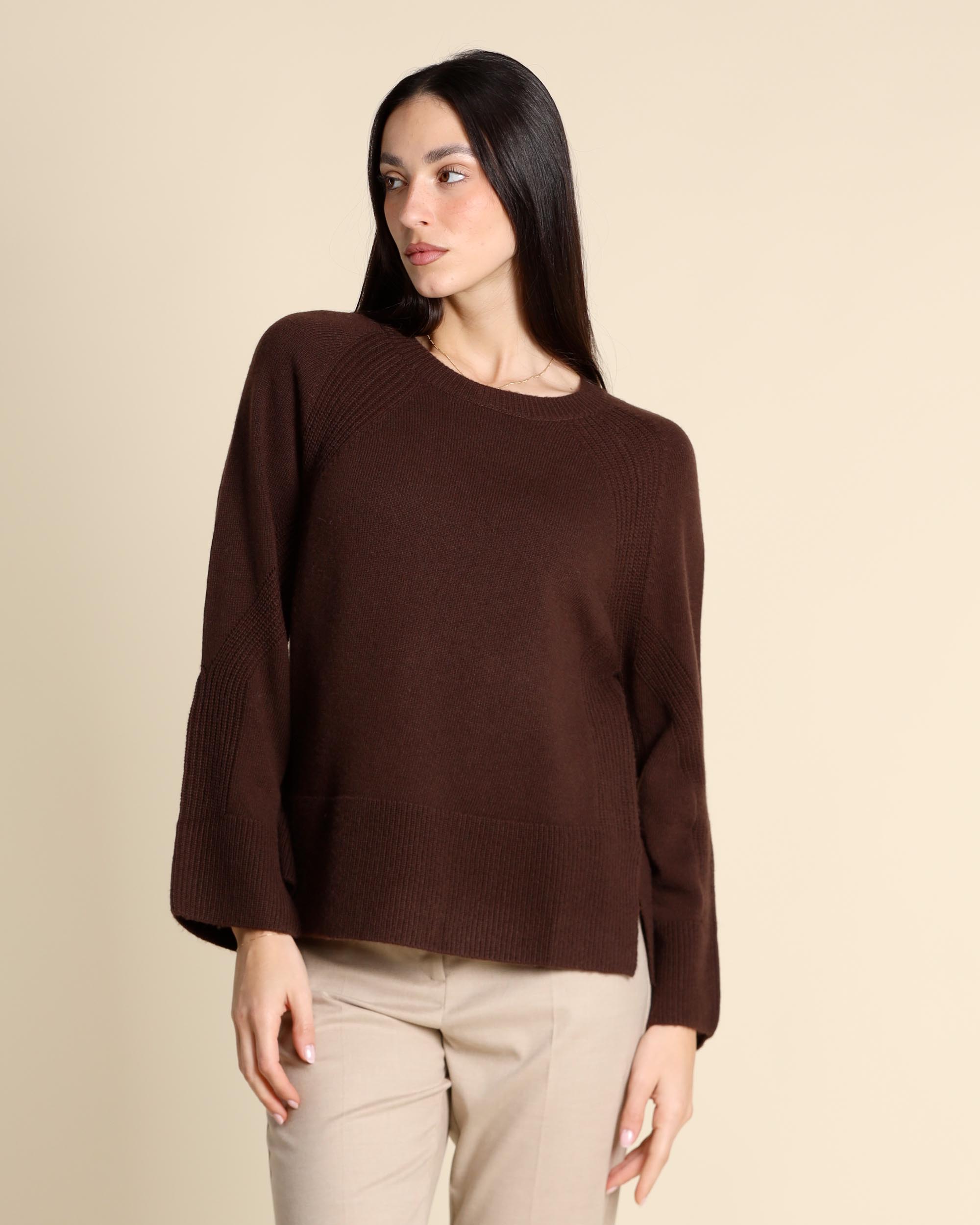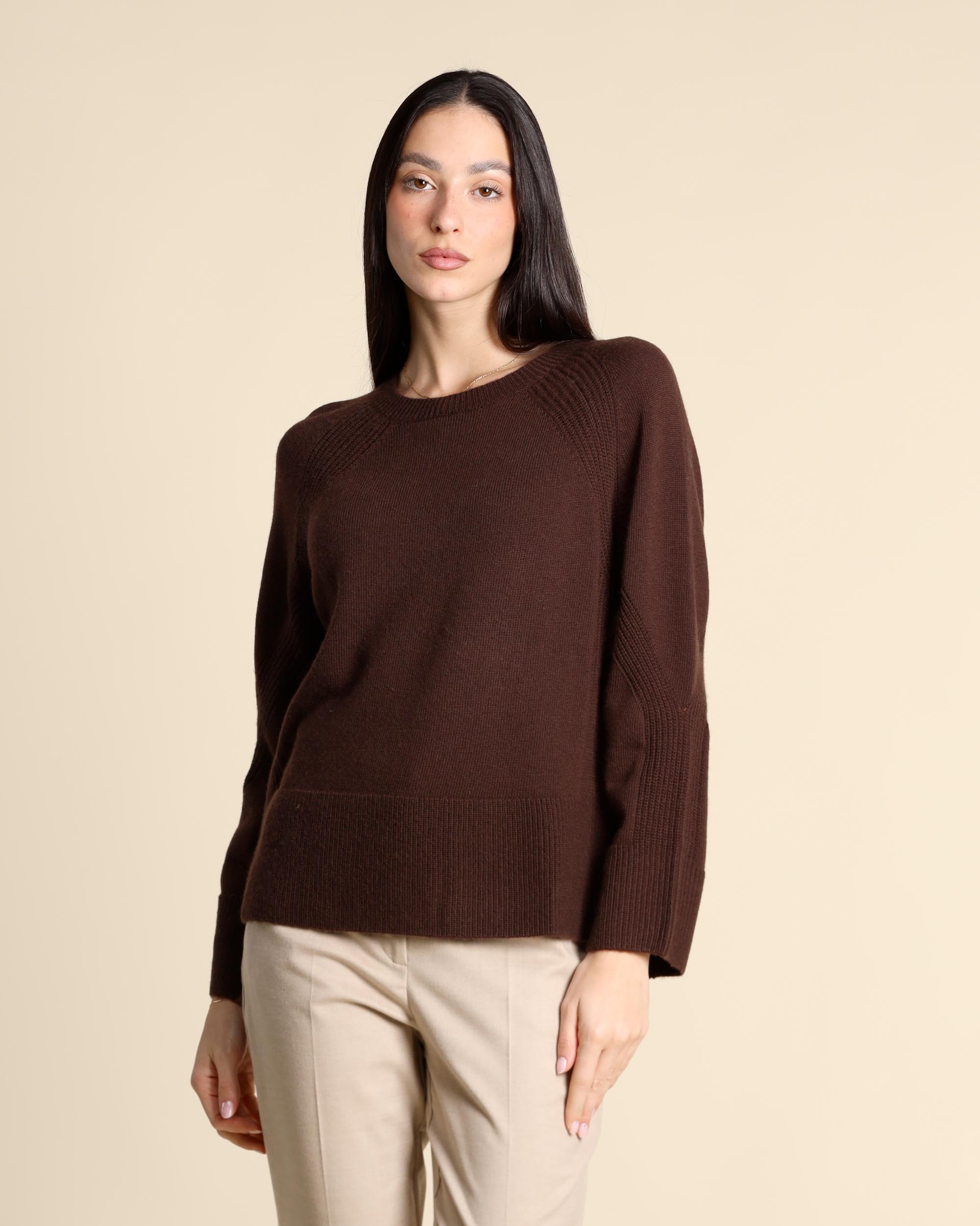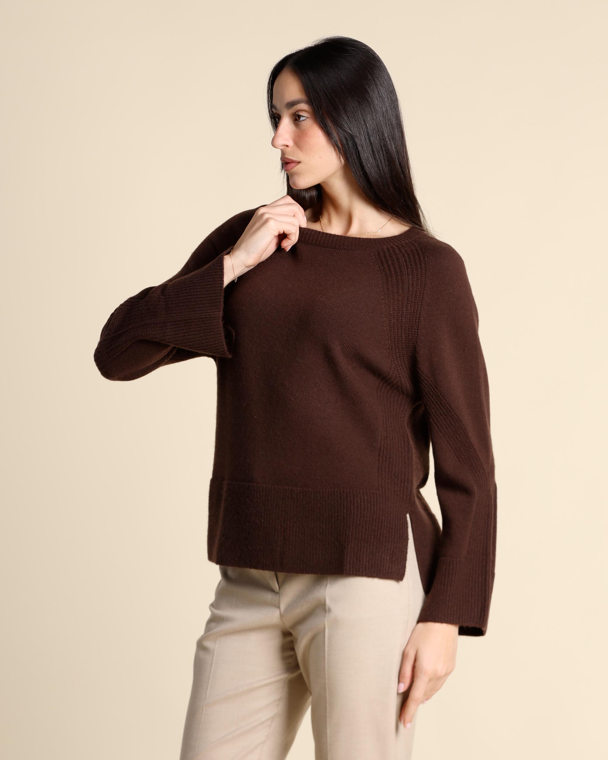 Maglia testa moro in misto lana vergine, scollo tondo, maniche lunghe raglan con spacco nei polsi, linea morbida, spacchi laterali, la modella indossa una tg.S, la modella ha le seguenti misure: altezza 173, seno 84, vita 63, fianchi 94, collezione donna Emme by Marella Autunno Inverno 2025/26